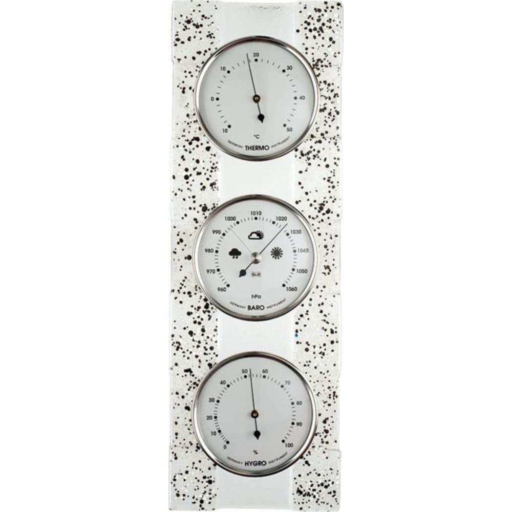 Kombinovaný analogový barometr s teploměrem a vlhkoměrem vsazený do moderní skleněné podložky. Umí změřit teplotu v místnosti, stanovit relativní hodnotu vlhkosti vzduchu a aktuální hodnotu tlaku vzduchu. Díky mechanickému systému funguje zcela bez napájení.