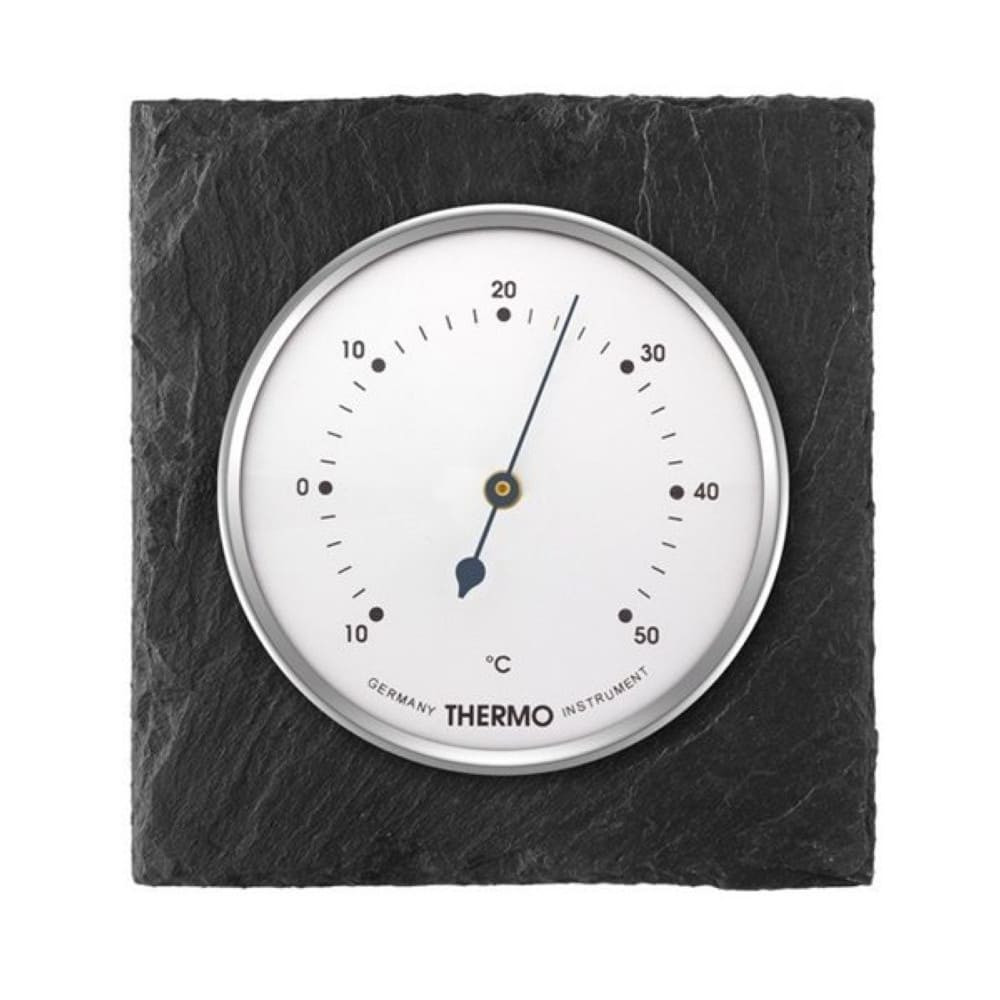 Designový pokojový mechanický teploměr v břidlicovém pouzdru k zavěšení na zeď. Přírodní kámen břidlice je ideálním doplňkem interiérového designu. Teplota je zobrazena ve stupních Celsia (°C) s měřicím rozsahem −10 °C až +50 °C.