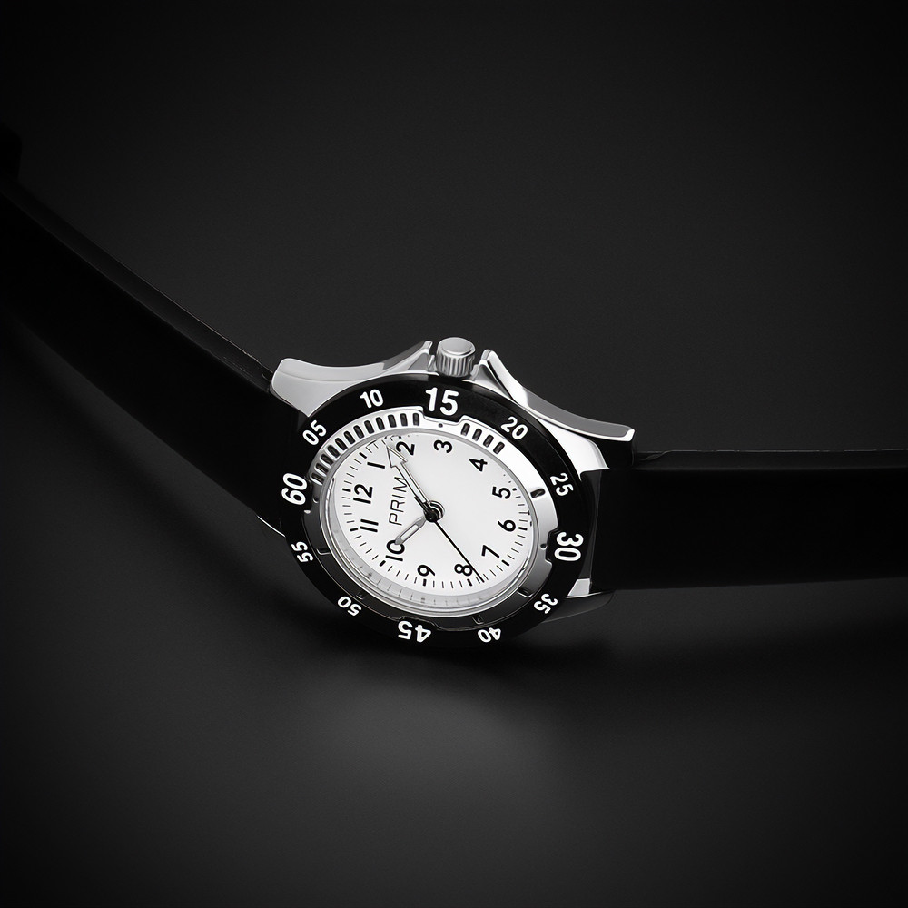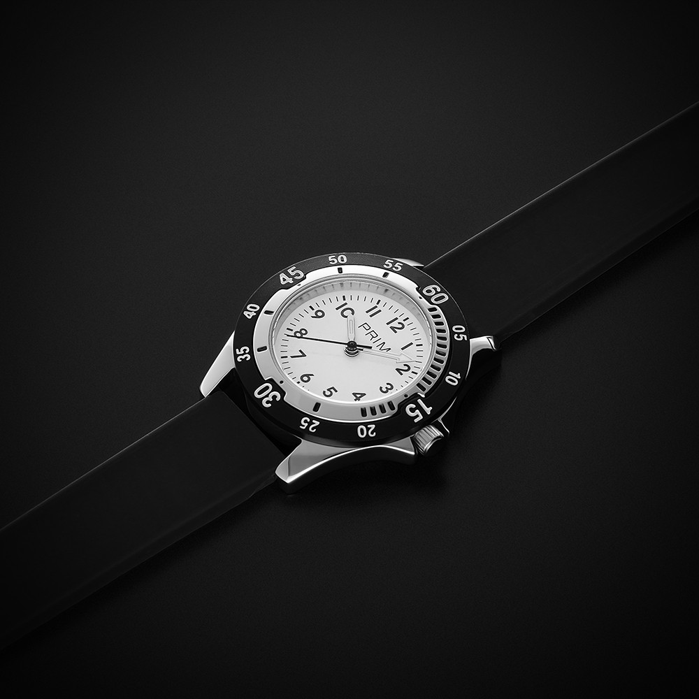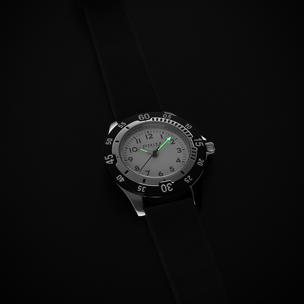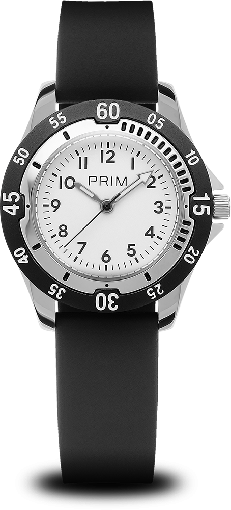 Tým grafiků se nechal inspirovat čitelným a lehce rozpoznatelným ciferníkem s arabskými číslicemi v barvách kroužku a doplnil model barevnými ručičkami. Zvolili jsme také pestré barvy, ze kterých si vybere každý školák a naučí se tak rozpoznávat čas na svých prvních PRIM hodinkách. Praktické je také zobrazení minut na fixním okruží, které pomohou rozpoznat čas. Hodinky jsou kompletně vyrobeny z nerezové oceli 316L a s voděodolností 10 ATM. Celkový vzhled doplňuje barevný příjemný silikonový řemínek.