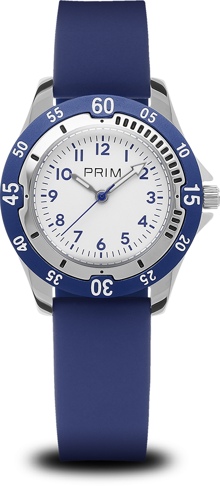 Tým grafiků se nechal inspirovat čitelným a lehce rozpoznatelným ciferníkem s arabskými číslicemi v barvách kroužku a doplnil model barevnými ručičkami. Zvolili jsme také pestré barvy, ze kterých si vybere každý školák a naučí se tak rozpoznávat čas na svých prvních PRIM hodinkách. Praktické je také zobrazení minut na fixním okruží, které pomohou rozpoznat čas. Hodinky jsou kompletně vyrobeny z nerezové oceli 316L a s voděodolností 10 ATM. Celkový vzhled doplňuje barevný příjemný silikonový řemínek.