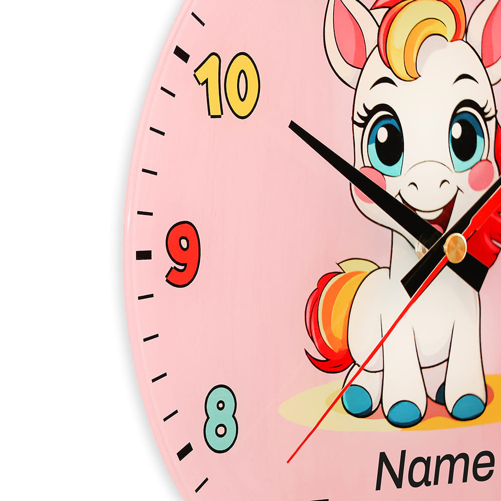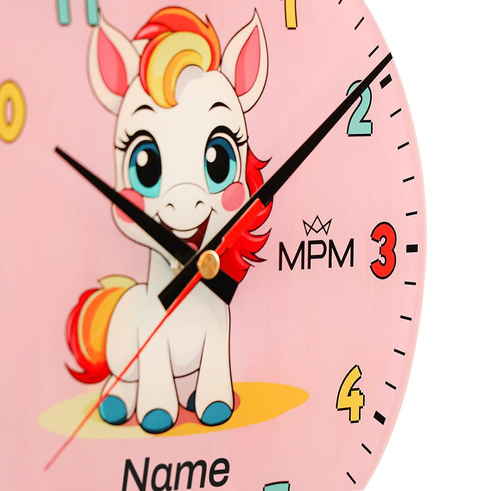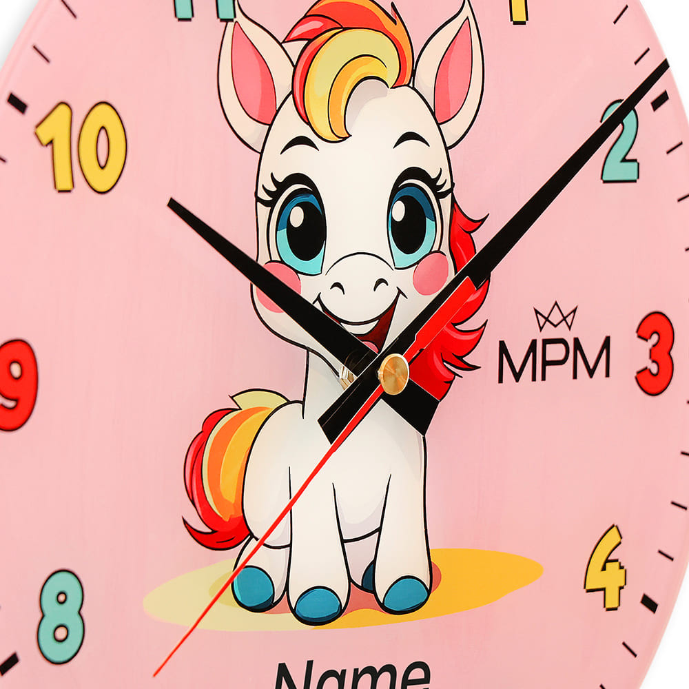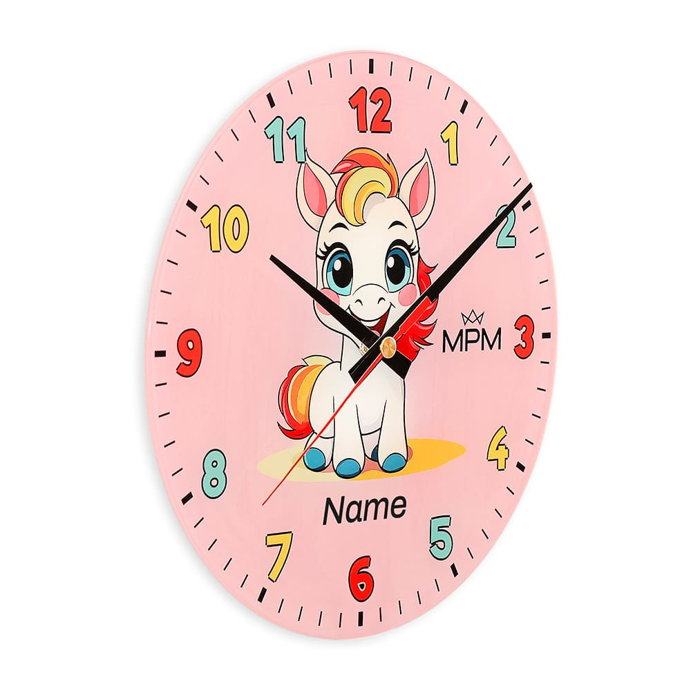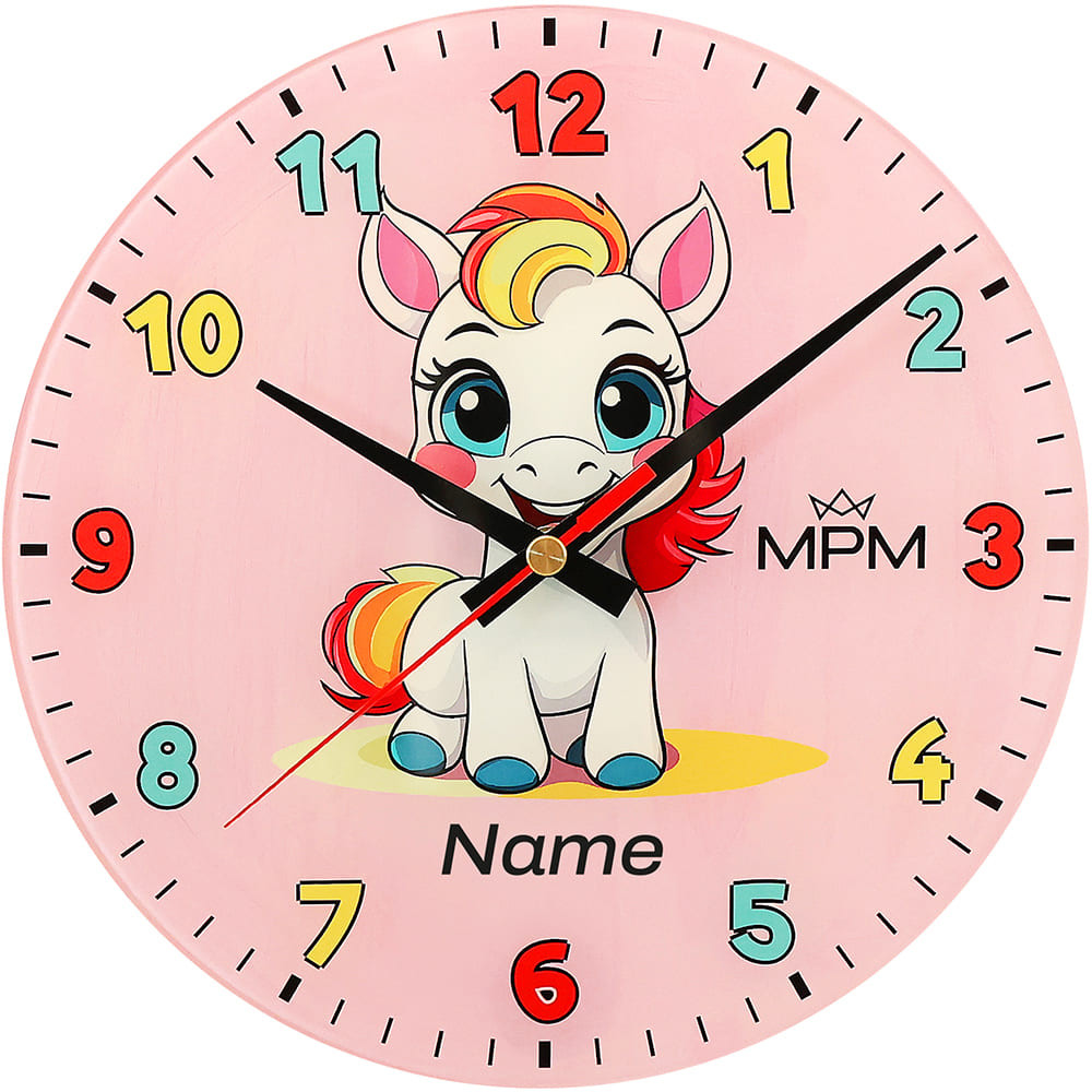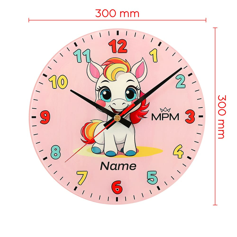 Veselé skleněné nástěnné hodiny rozjasní tvář každého dítěte. Roztomilé motivy – poník s duhovou hřívou a modrými kopyty, veselý oslík na pistáciově zeleném pozadí nebo šťastné štěňátko na sytě žlutém pozadí – rádi potiskneme jménem jejich malého majitele, a to zcela bezplatně. Maximální délka jména je 8-9 znaků.
