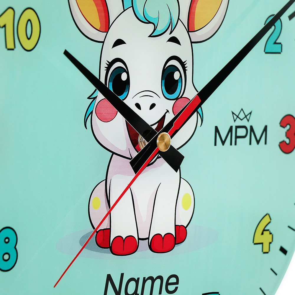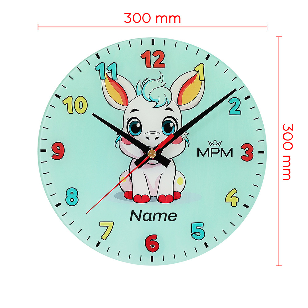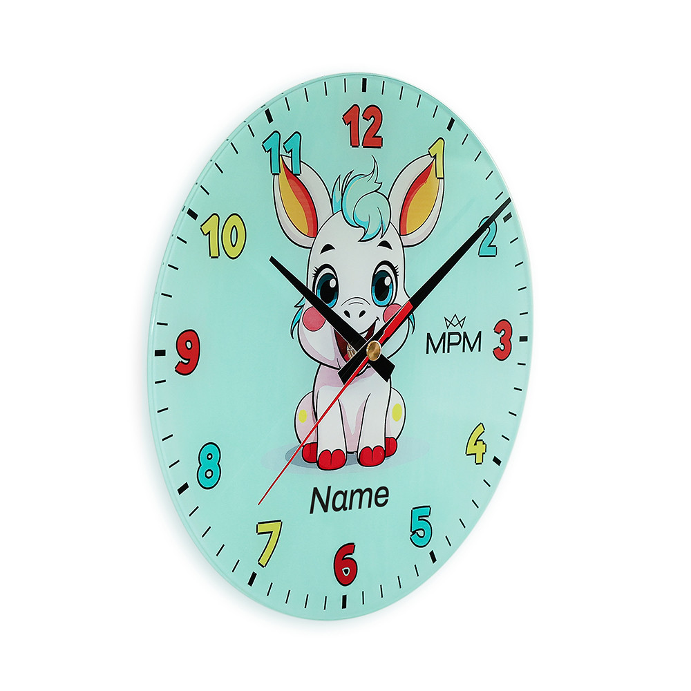 Veselé skleněné nástěnné hodiny rozjasní tvář každého dítěte. Roztomilé motivy – poník s duhovou hřívou a modrými kopyty, veselý oslík na pistáciově zeleném pozadí nebo šťastné štěňátko na sytě žlutém pozadí – rádi potiskneme jménem jejich malého majitele, a to zcela bezplatně. Maximální délka jména je 8-9 znaků.