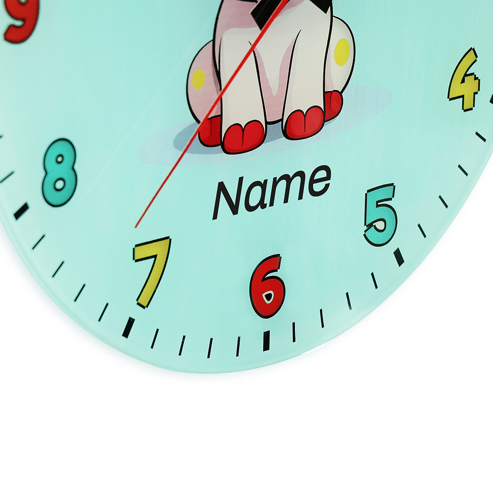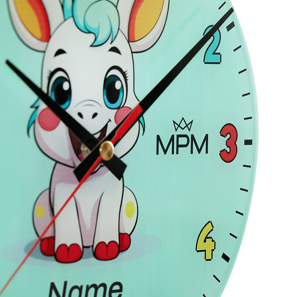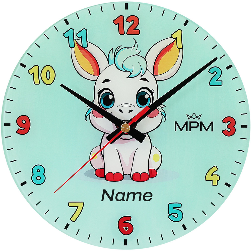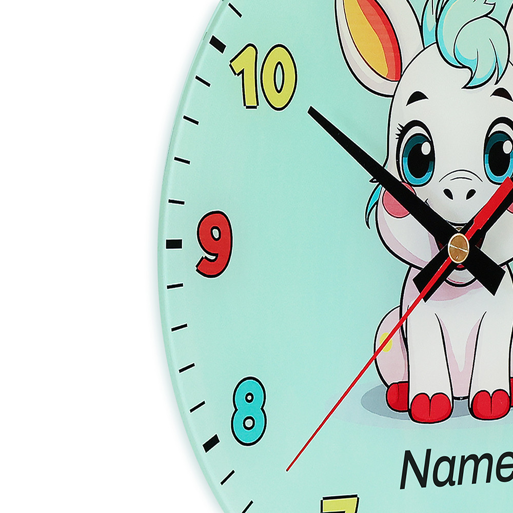 Veselé skleněné nástěnné hodiny rozjasní tvář každého dítěte. Roztomilé motivy – poník s duhovou hřívou a modrými kopyty, veselý oslík na pistáciově zeleném pozadí nebo šťastné štěňátko na sytě žlutém pozadí – rádi potiskneme jménem jejich malého majitele, a to zcela bezplatně. Maximální délka jména je 8-9 znaků.