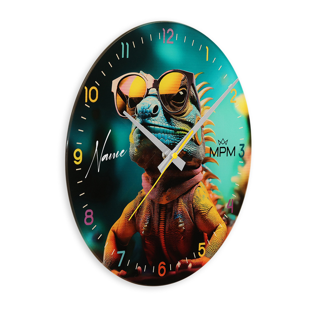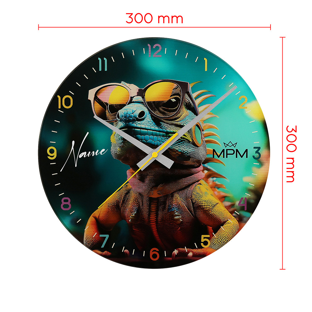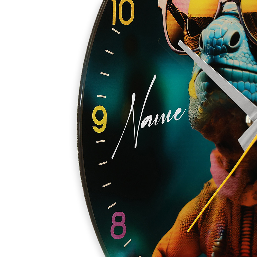 Originální skleněné nástěnné hodiny s hustými zvířecími motivy. Stylový design s žirafou, orangutanem a leguánem ve slunečních brýlích rádi potiskneme jménem jejich majitele, a to zcela bezplatně. Maximální délka jména je 8-9 znaků. Pestré detaily hodin dokonale rozjasní každý kout a vnesou do prostoru dětského pokoje lehkost, šarm a skvělou náladu.
