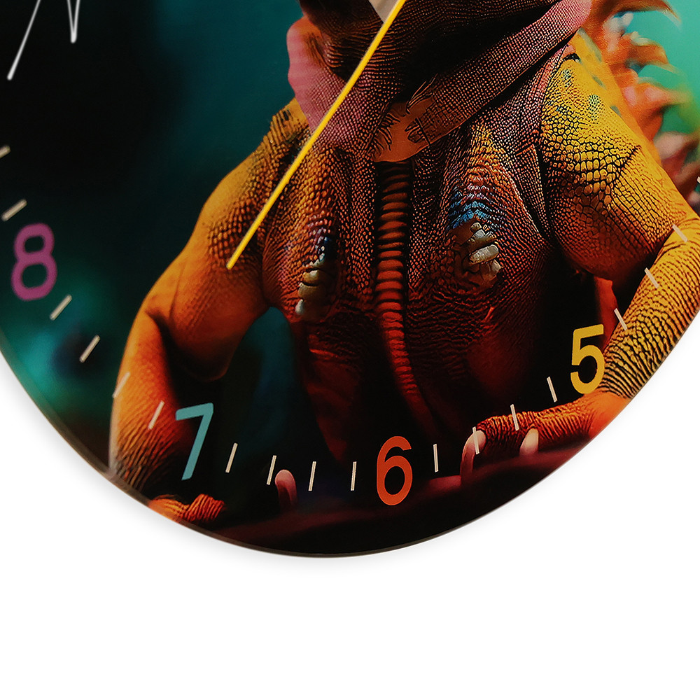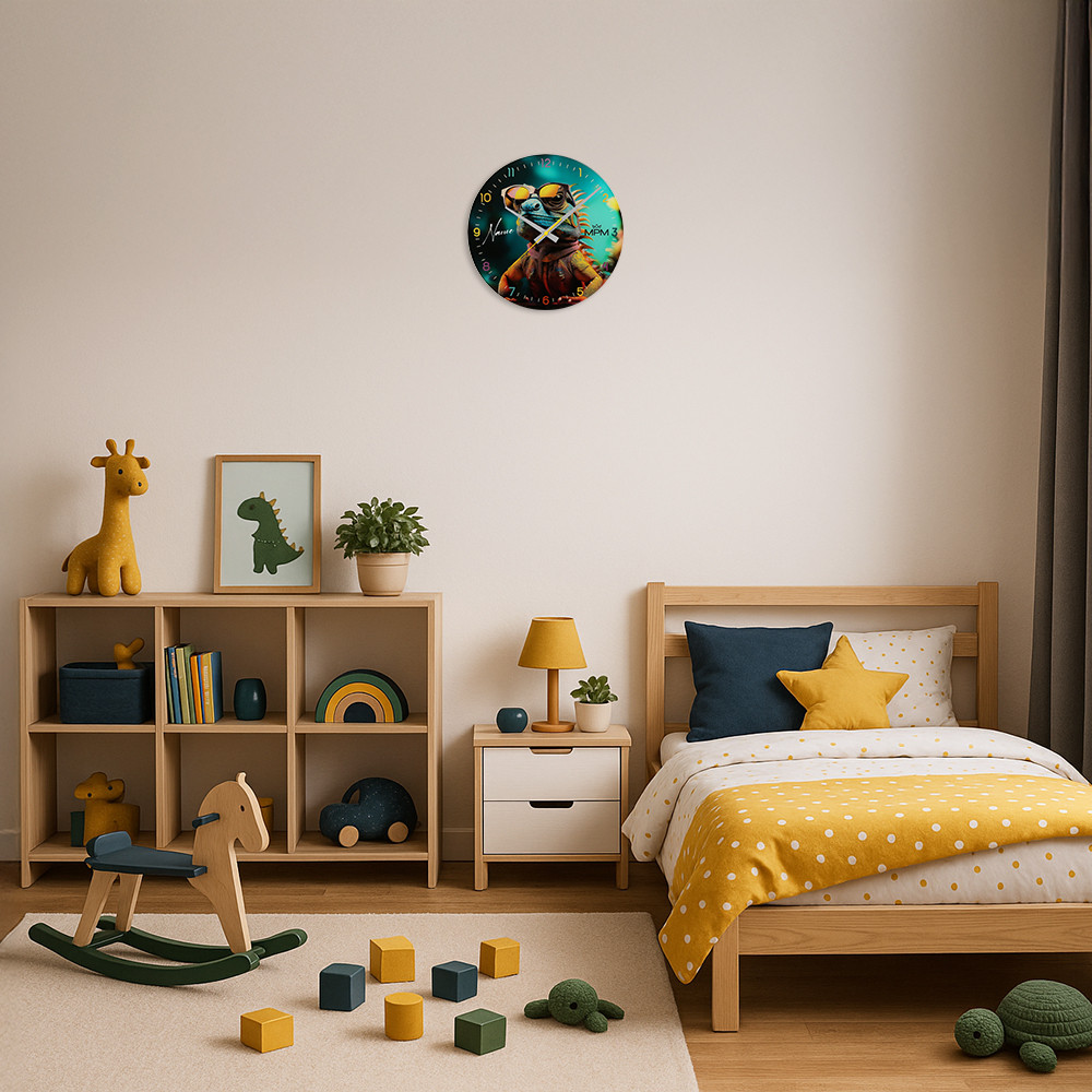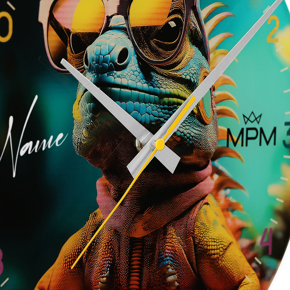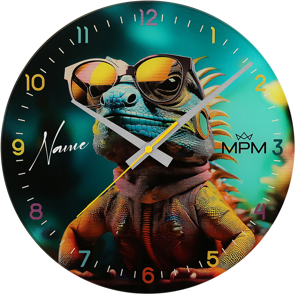 Originální skleněné nástěnné hodiny s hustými zvířecími motivy. Stylový design s žirafou, orangutanem a leguánem ve slunečních brýlích rádi potiskneme jménem jejich majitele, a to zcela bezplatně. Maximální délka jména je 8-9 znaků. Pestré detaily hodin dokonale rozjasní každý kout a vnesou do prostoru dětského pokoje lehkost, šarm a skvělou náladu.