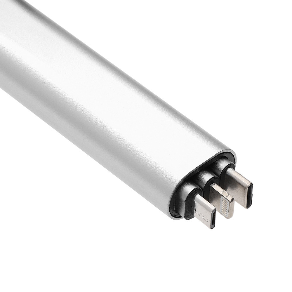Přívěsek s redukcemi Micro USB / iPhone / USB-C, s kabely v nylonovém opletu a koncovkami v plastovém pouzdře.