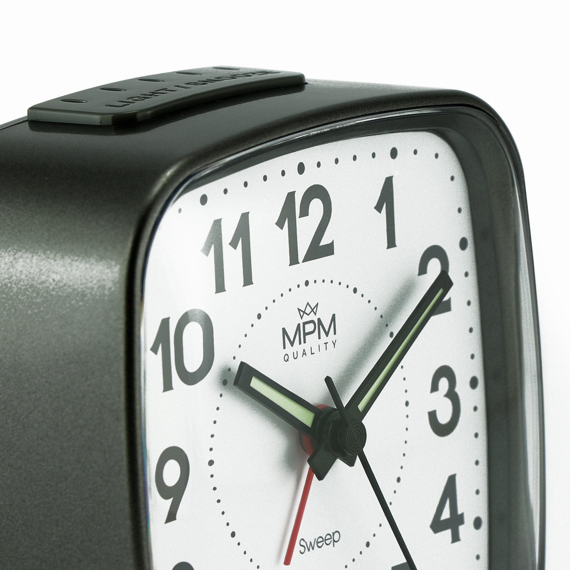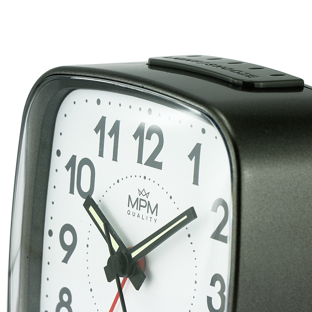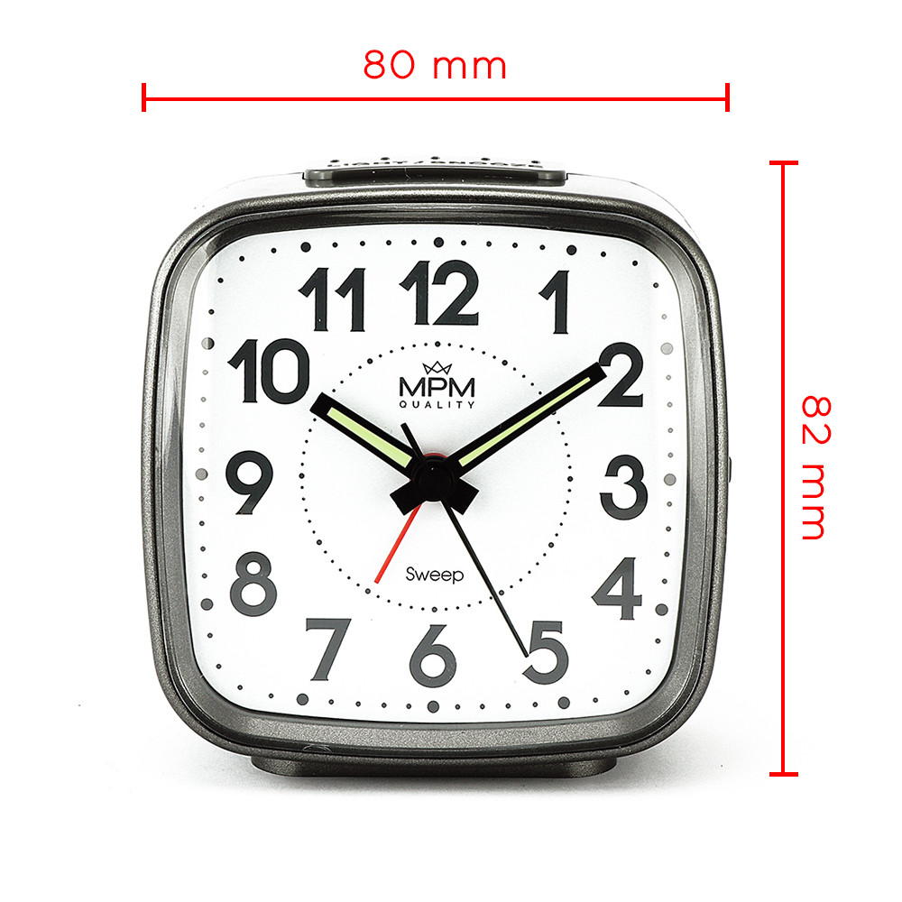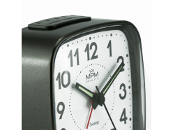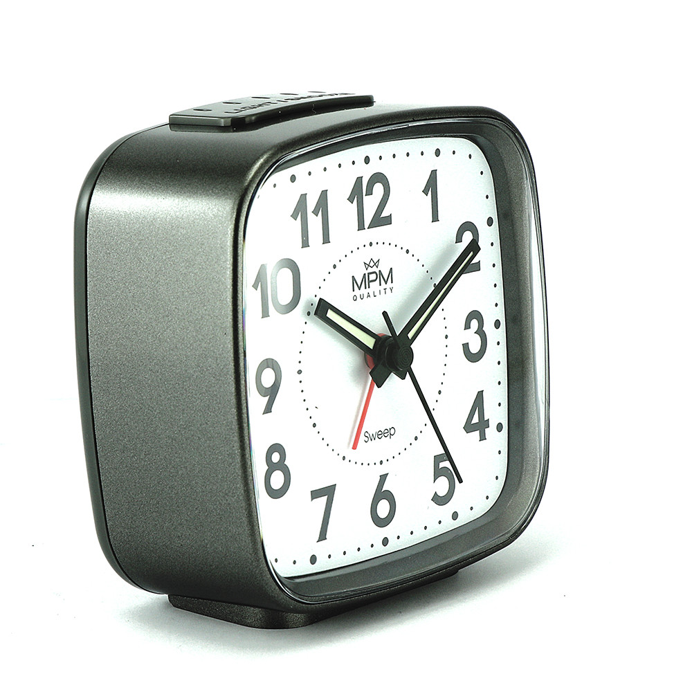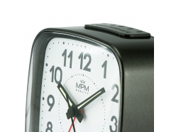 Plastový analogový budík s plynulým chodem, LED podsvícením a luminiscenčními ručičkami.