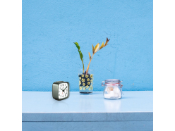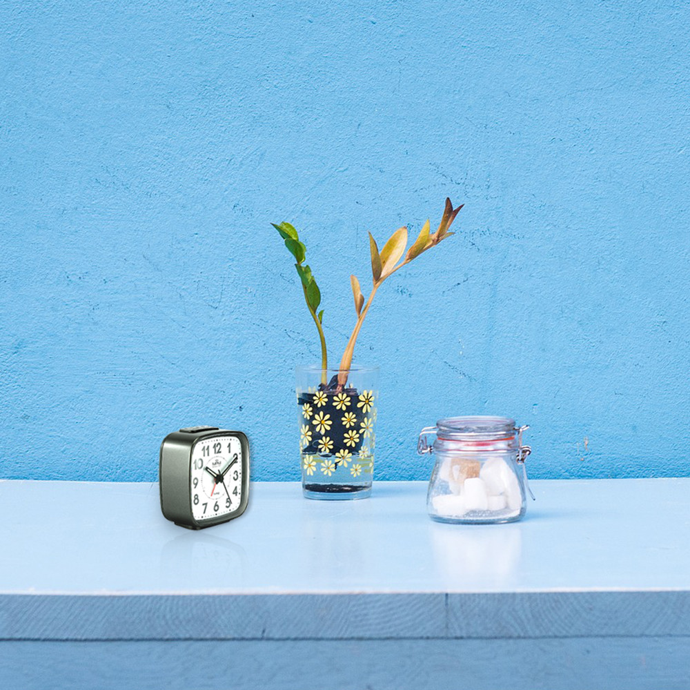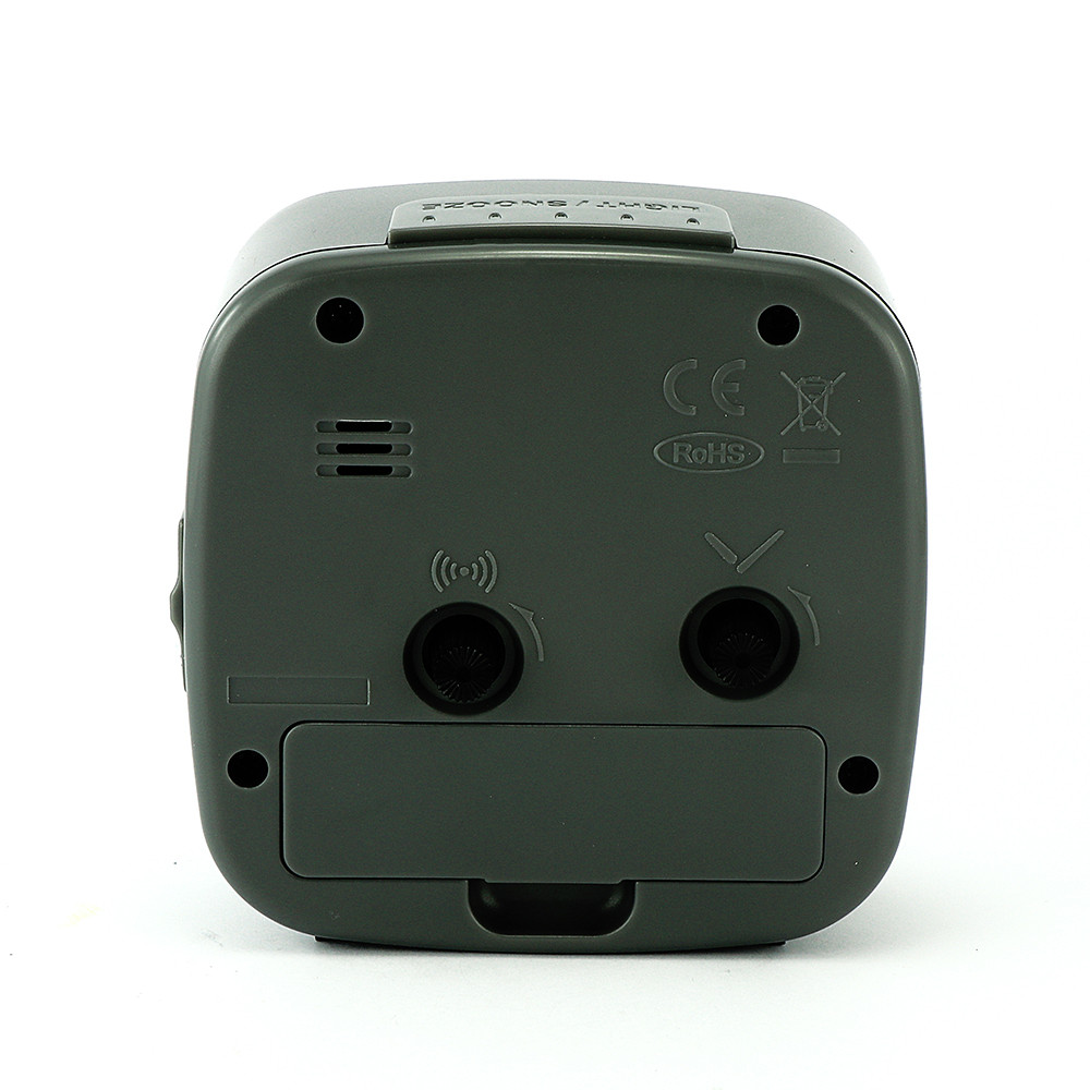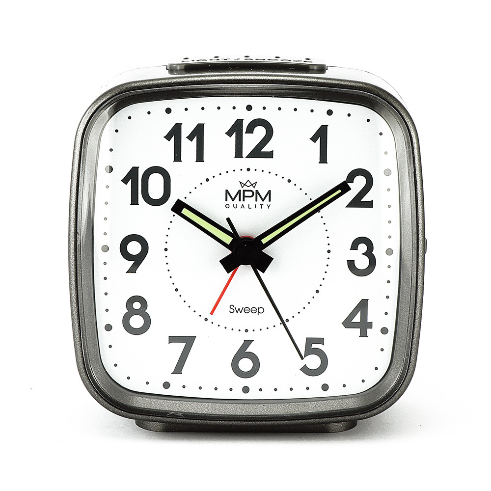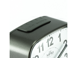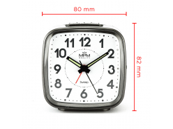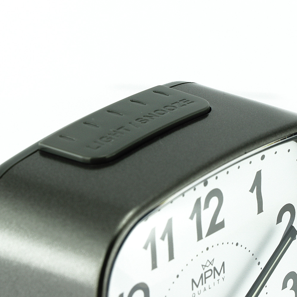 Plastový analogový budík s plynulým chodem, LED podsvícením a luminiscenčními ručičkami.