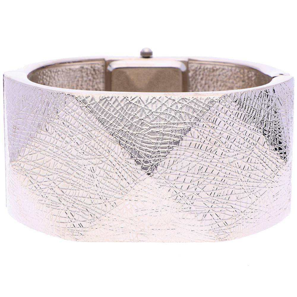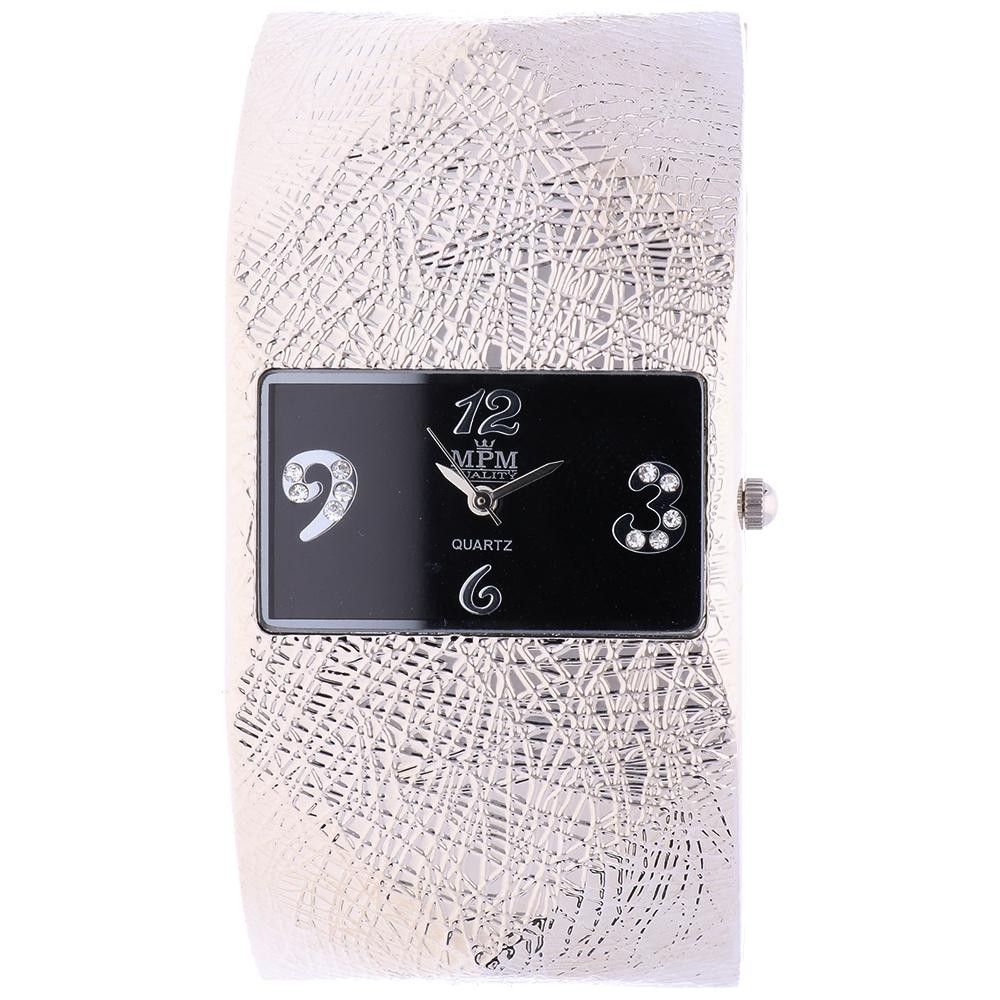 Dámské hodinky MPM s netradičním hranatým číselníkem. Část číslic na hodinkách je osazena stylovými kamínky. Společně se zdobným slitinovým náramkem dotvářejí celkovou eleganci nositelky.