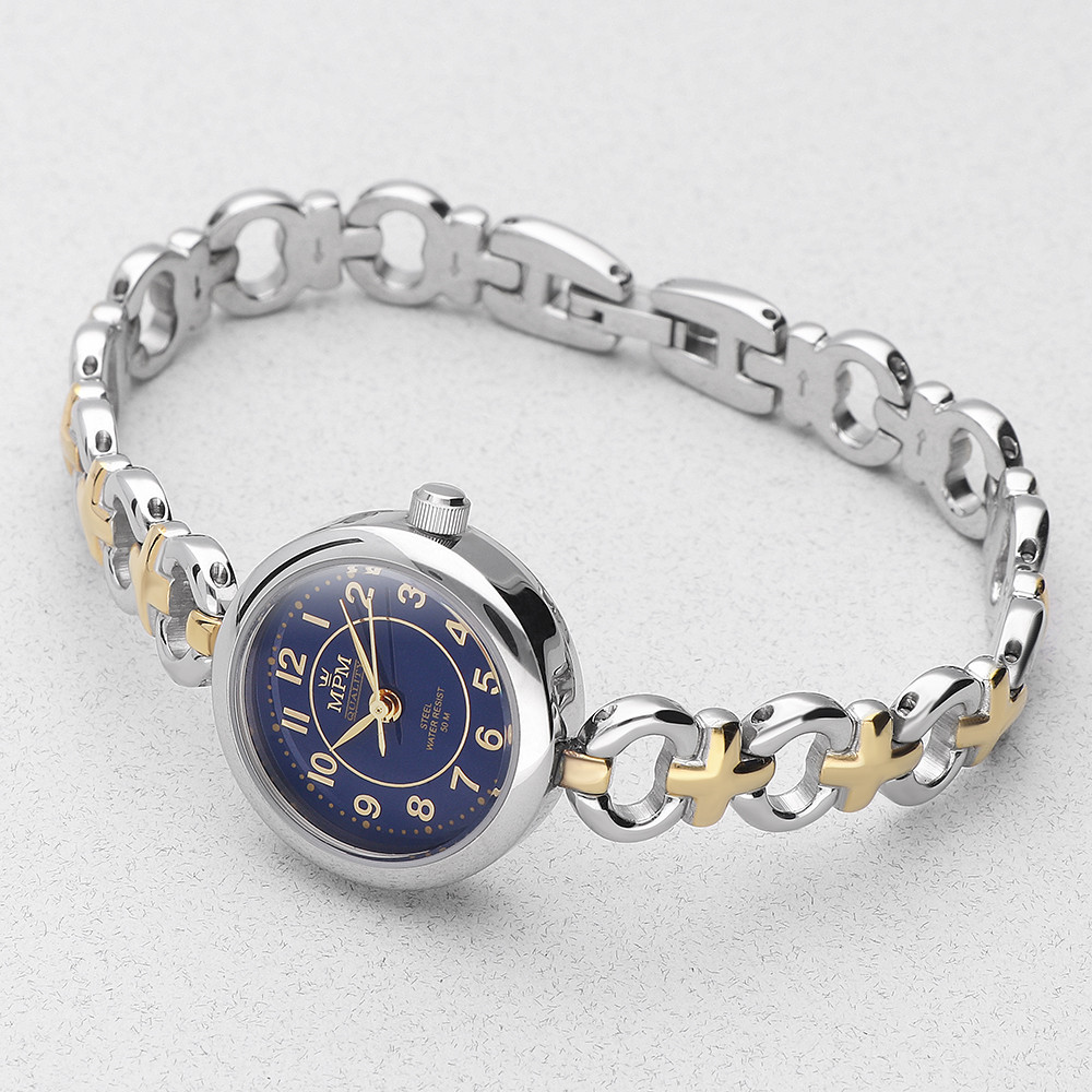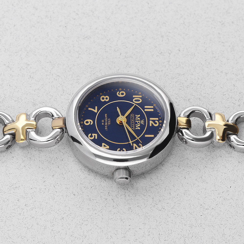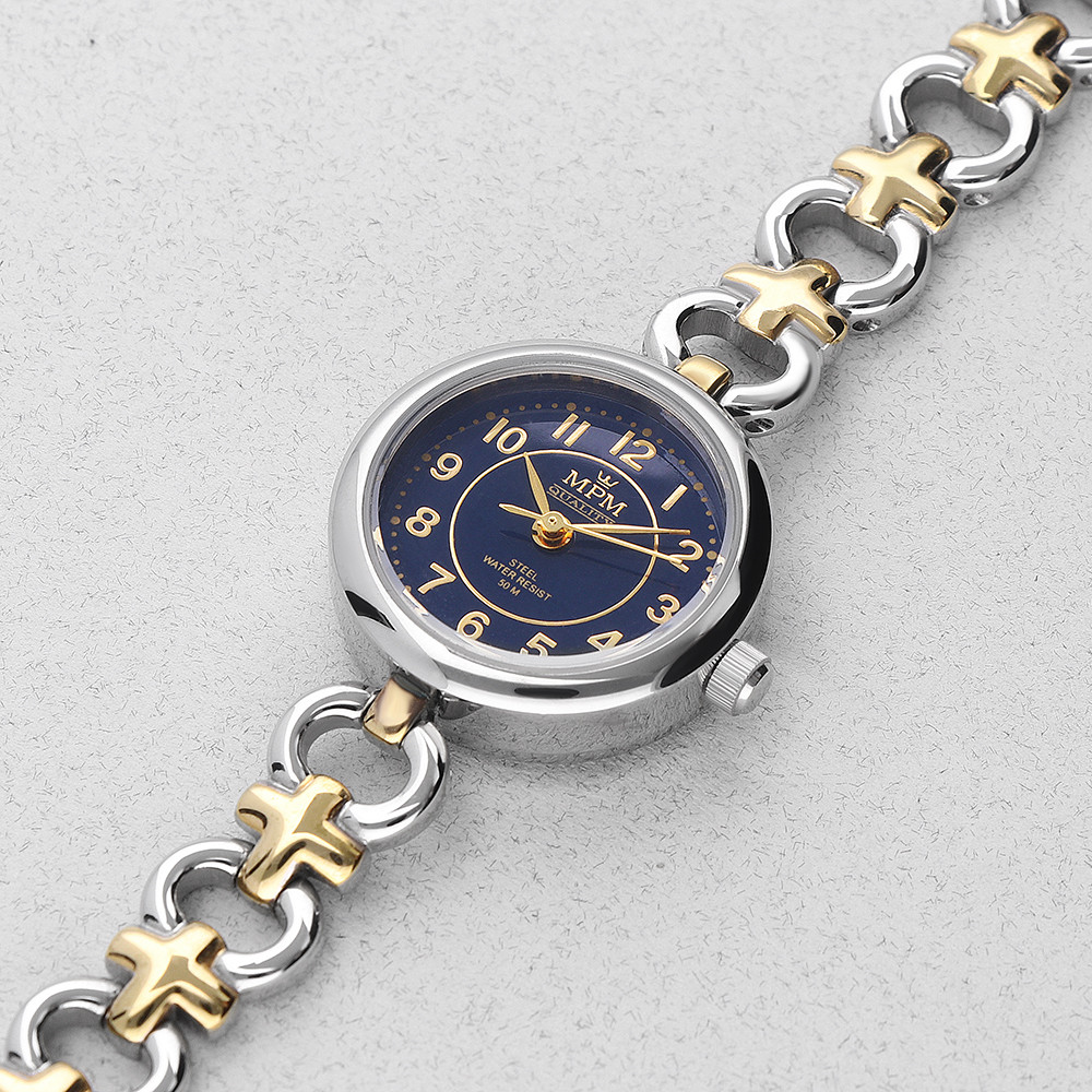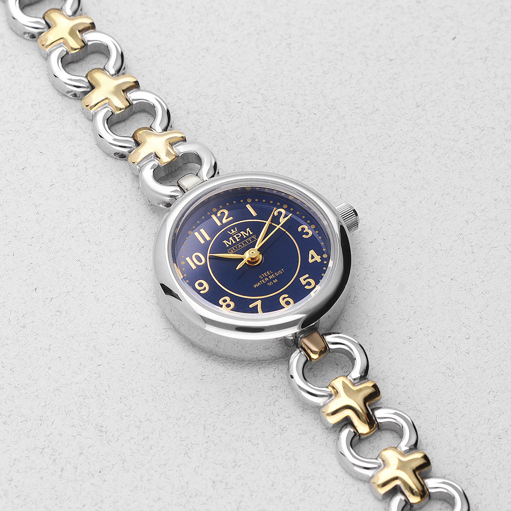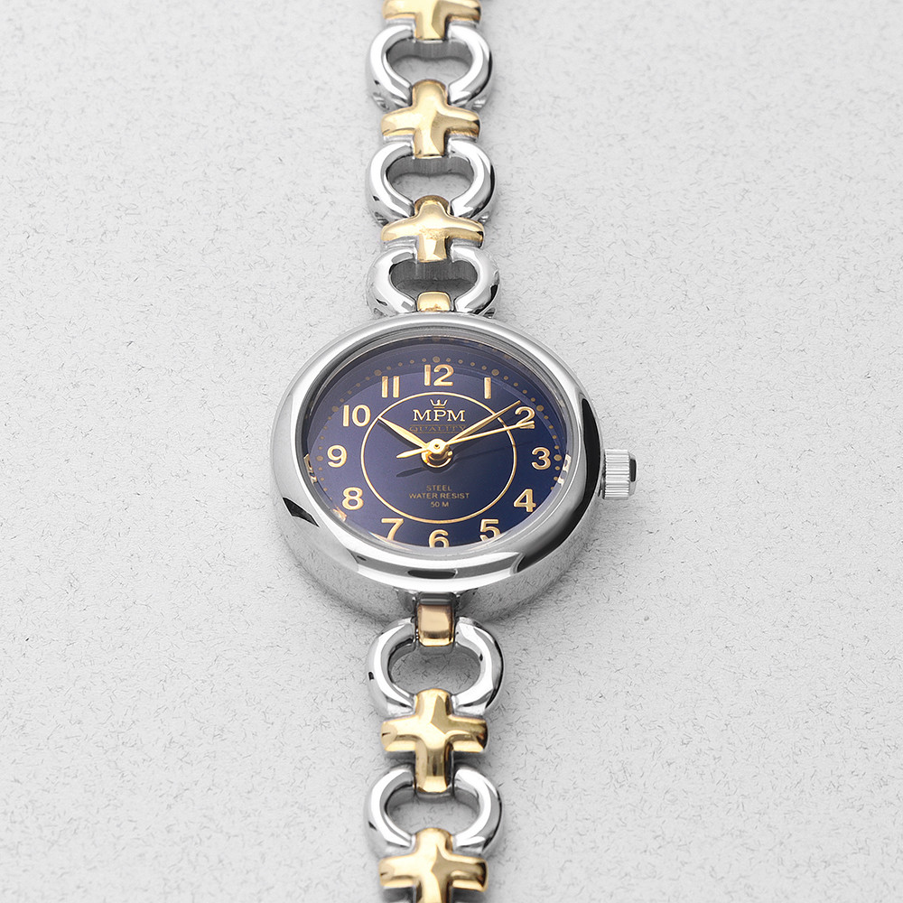 Okouzlující dámské hodinky MPM Sun vyrobené z ušlechtilé nerezové oceli s částečně pozlaceným nerezovým řemínkem. Tmavý číselník na hodinkách dává vyniknout vystupujícím pozlaceným číslicím, okruží a ručičkám. Pozlacené prvky nabízí také nerezovým očkový řemínek. Obrovskou předností těchto hodinek je použitý antialergenní materiál. Hodinky působí velice elegantním dojmem a rády na sebe poutají pozornost.