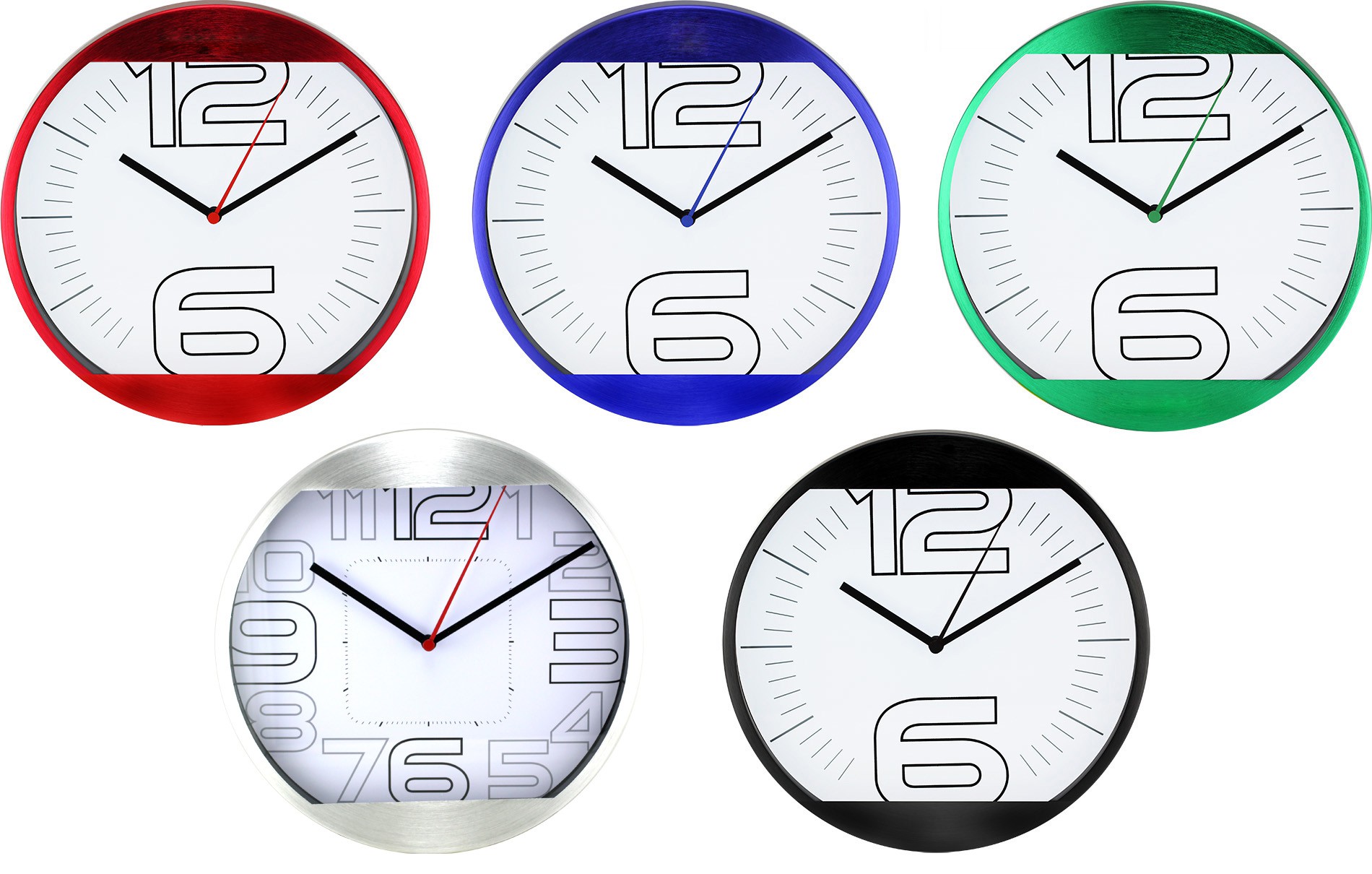Barevné kovové nástěnné hodiny s originálním číselníkem.