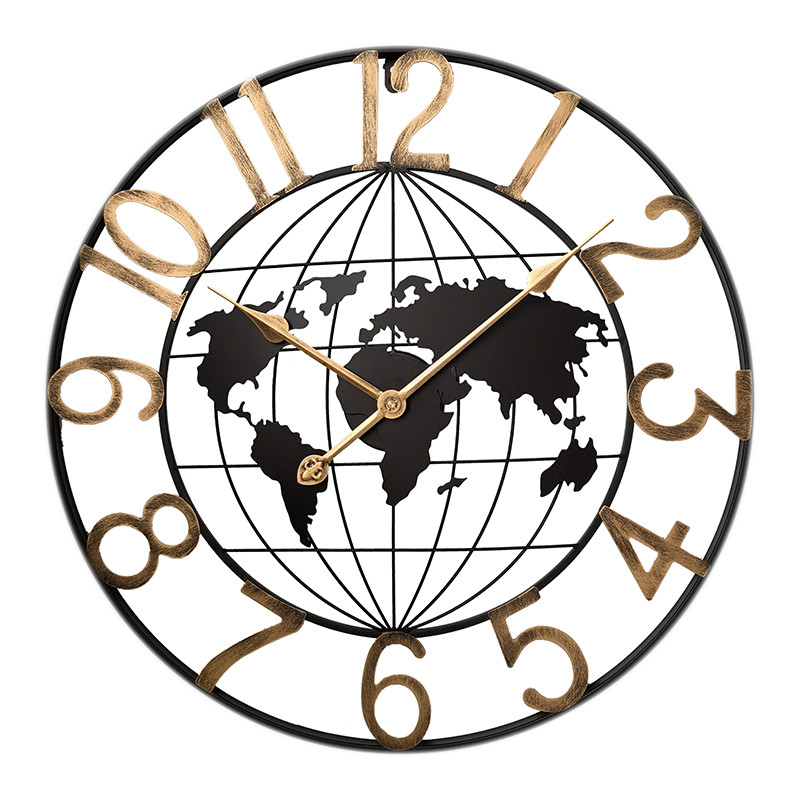 Designové nástěnné kovové hodiny s motivem světa. Arabské číslice a ručičky na číselníku hodin jsou pozlacené, ostatní komponenty hodin jsou černé. Hodiny dokonale vyniknou na stěnách domácností i firem, a díky svému motivu světa se skvěle hodí také do interiérů hotelů a cestovních kanceláří.