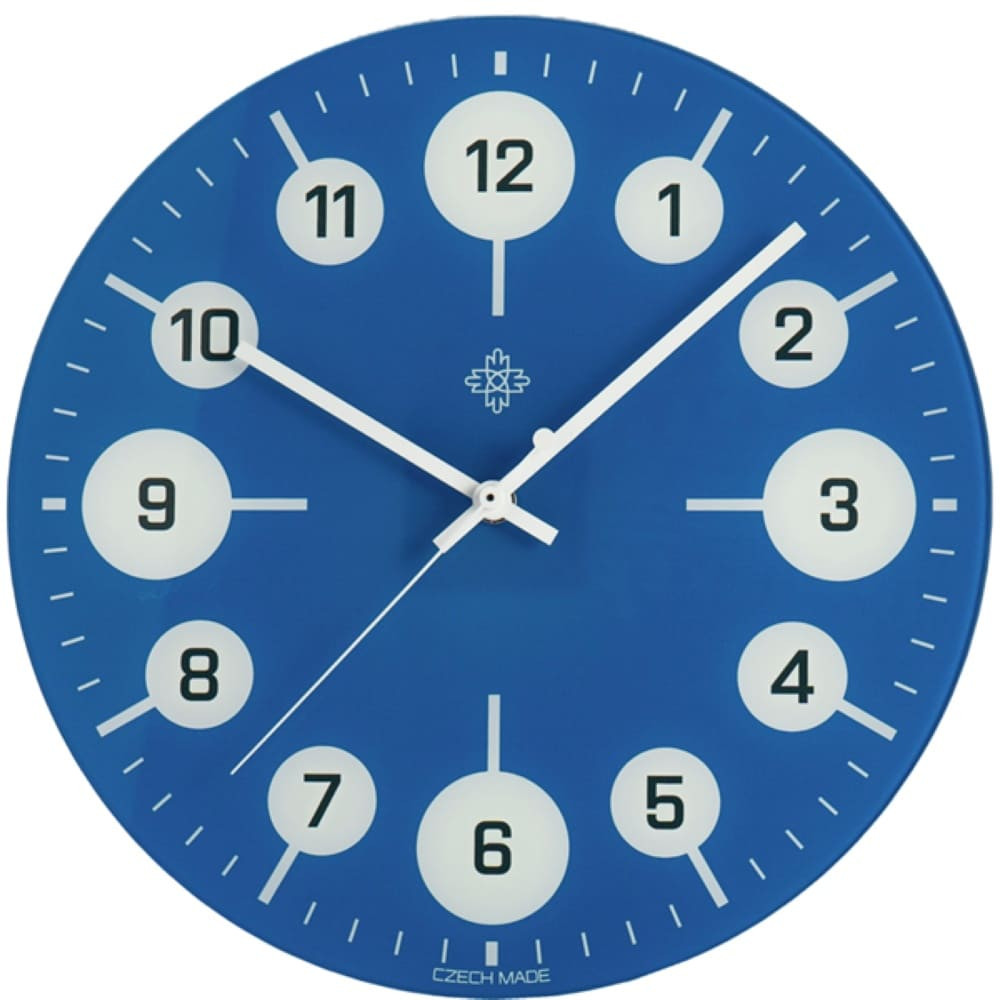 Skleněné nástěnné hodiny s modrým číselníkem inspirované hodinkami PRIM Beruška. Arabské číslice zasazené do výrazných kruhových ploch připomínají puntíky a spolu s minutovou stupnicí evokují vzhled berušky. Bílé ručičky jsou díky kontrastnímu provedení dobře čitelné. Hodiny byly vyrobeny v souladu s certifikací CZECH MADE.