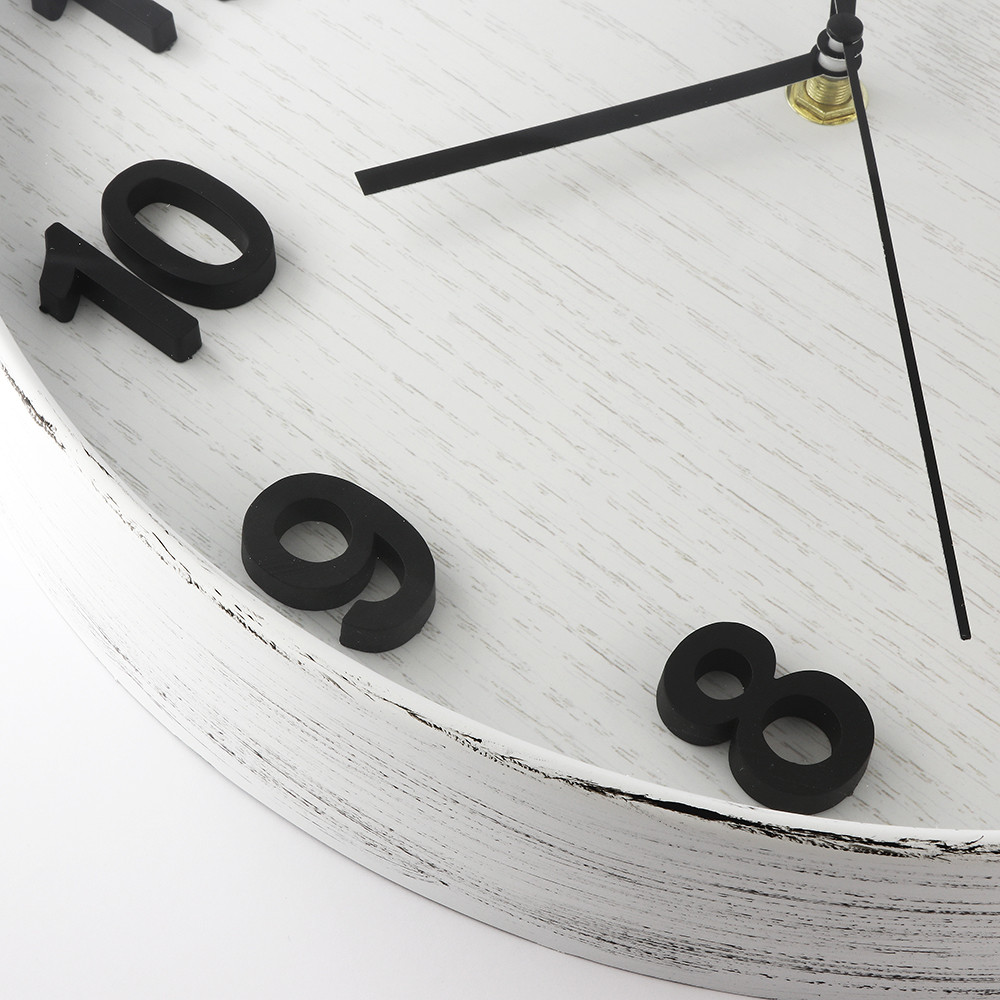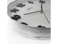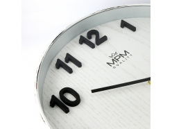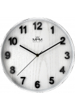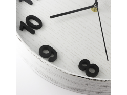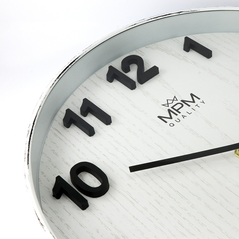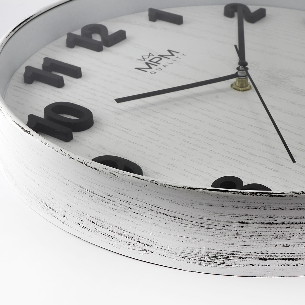 Nástěnné plastové hodiny PRIM Beta evokující vzhled starých ošoupaných hodin s číselníkem ve vzoru bílého dřeva.