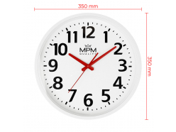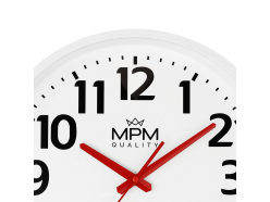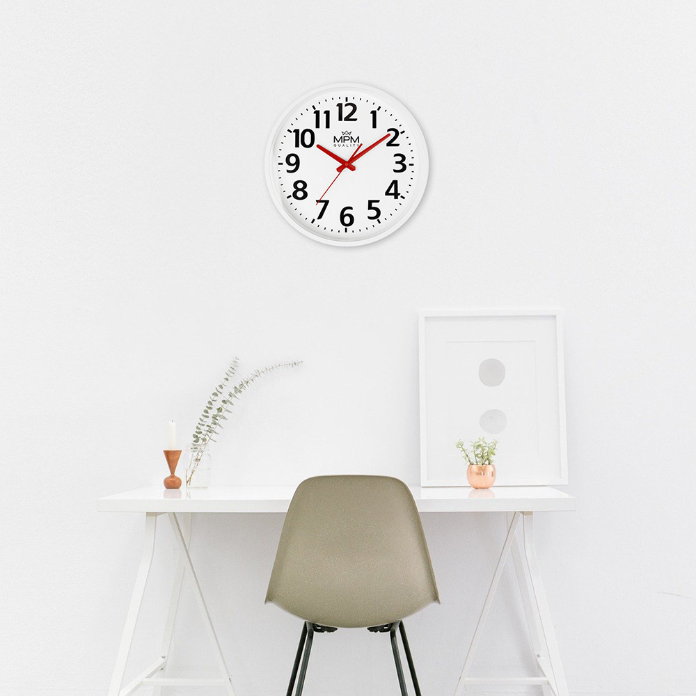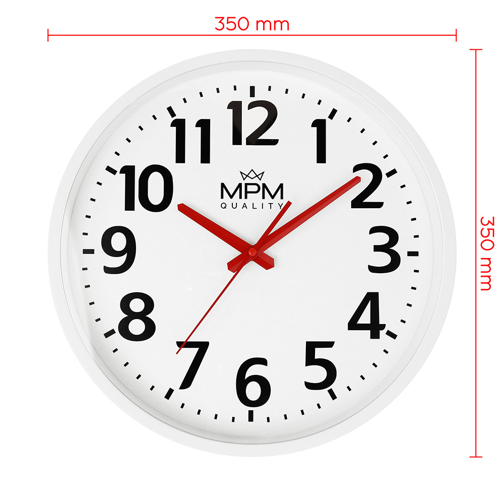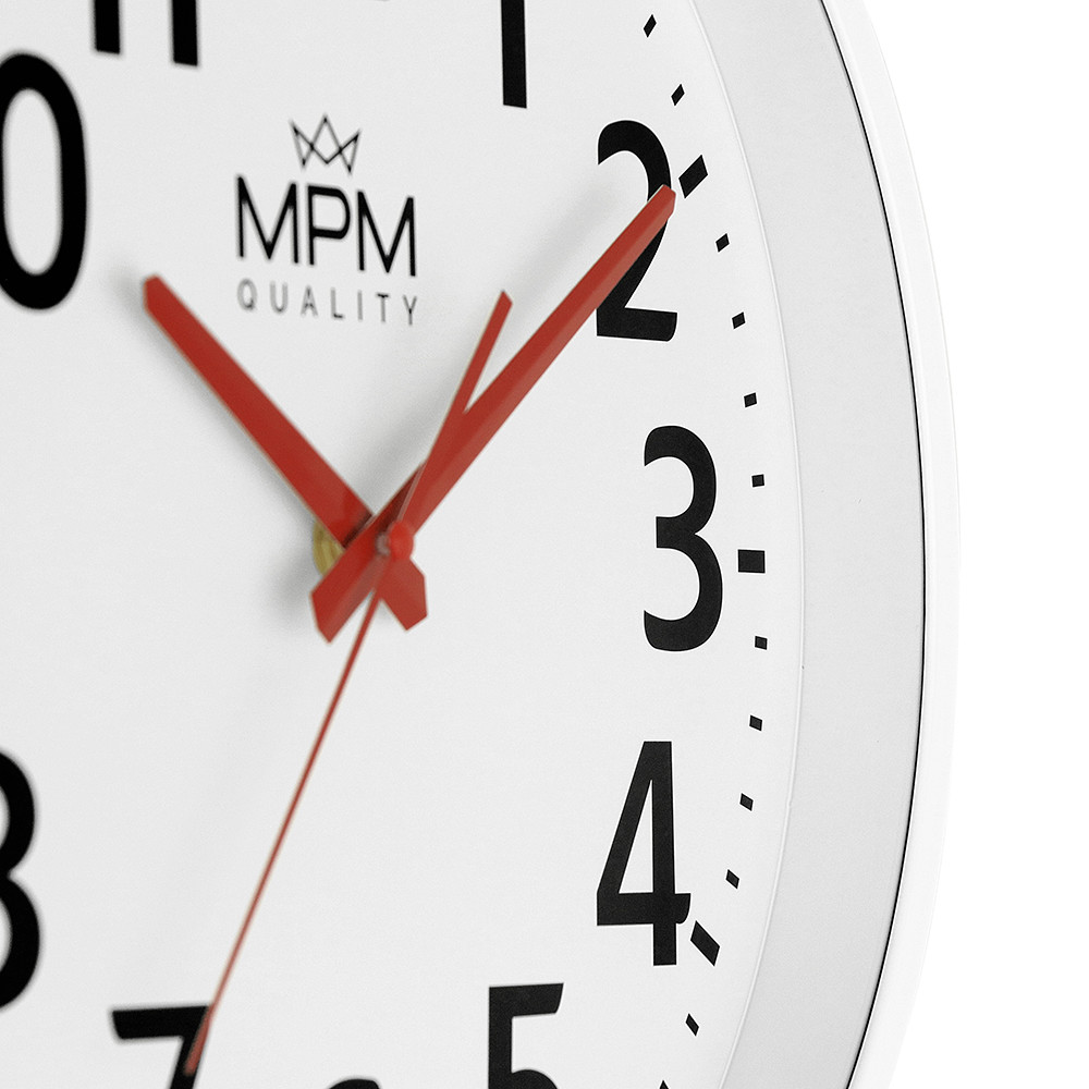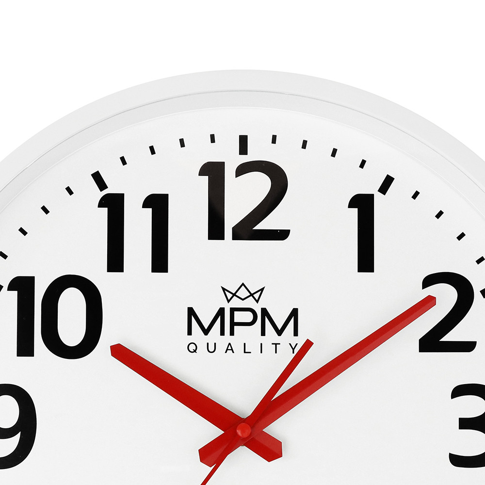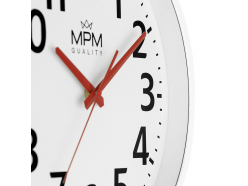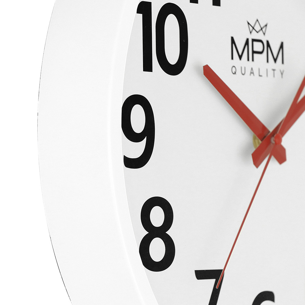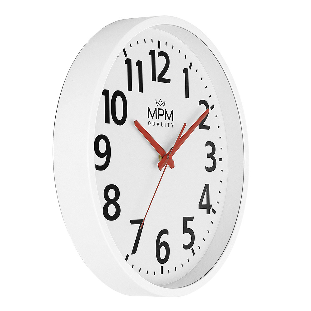 Nástěnné plastové hodiny MPM Classic s klasickým čitelným číselníkem a s typickým školním vzhledem. Hodiny jsou vybaveny strojkem Quartz s plynulým chodem a vteřinovou ručičkou.