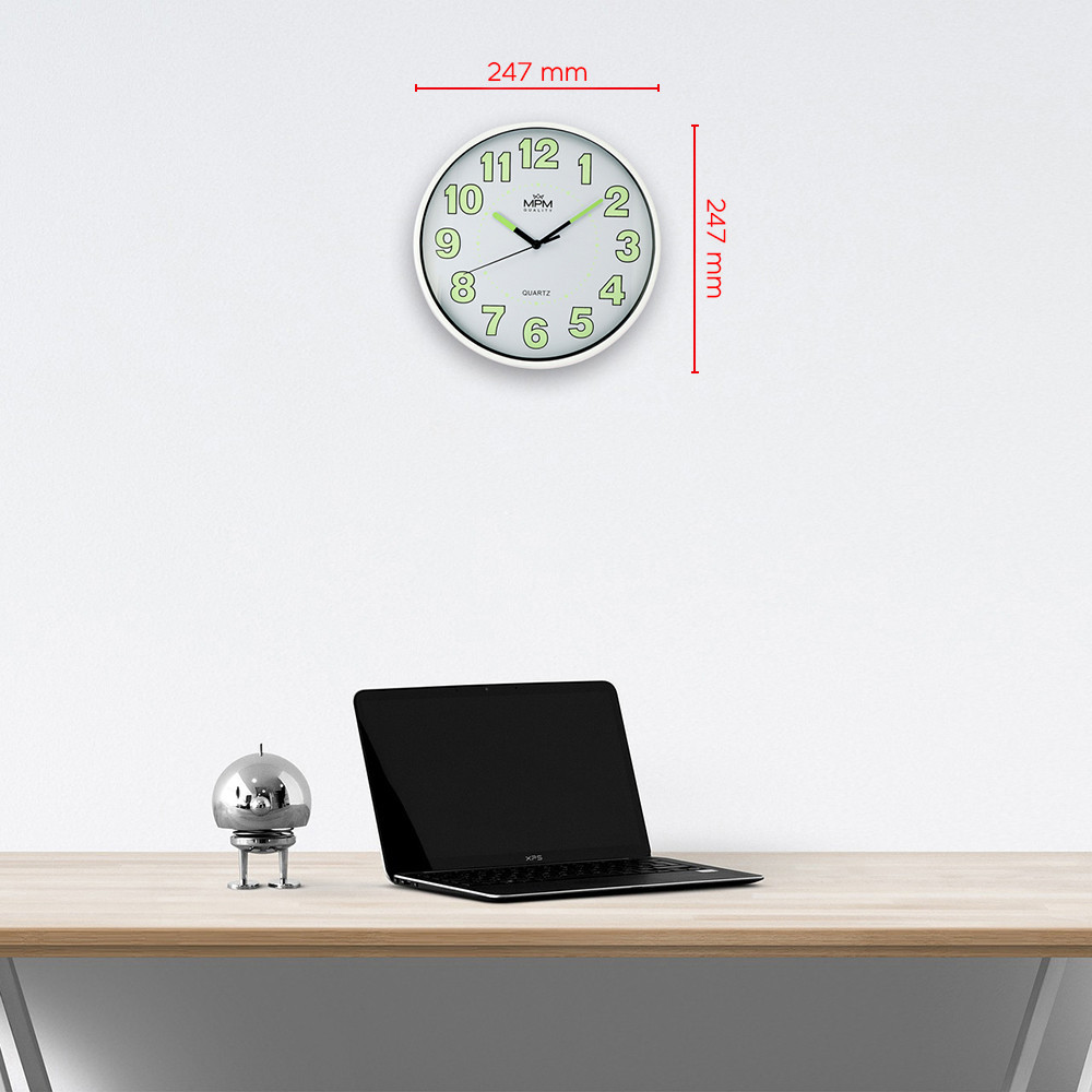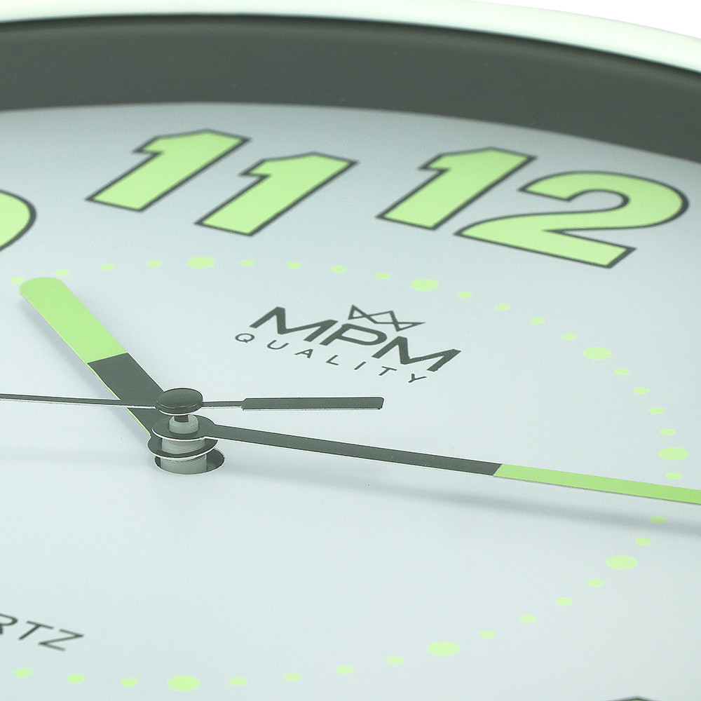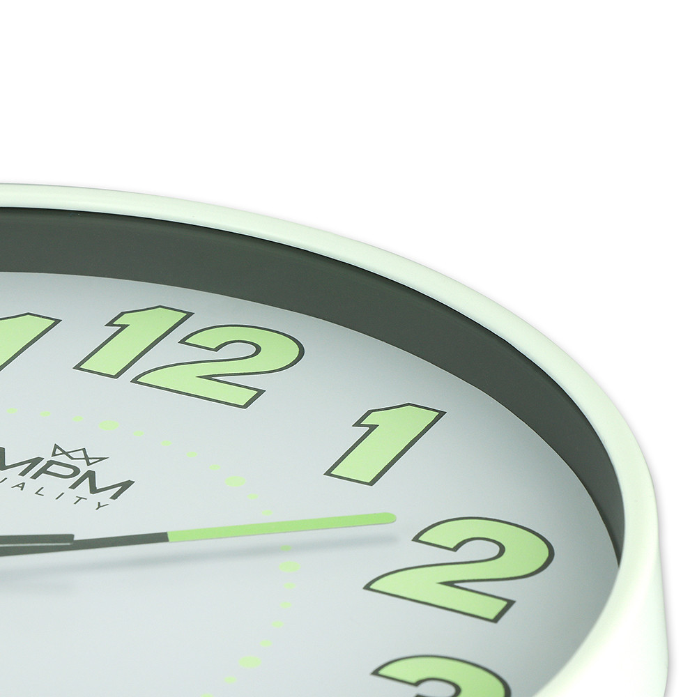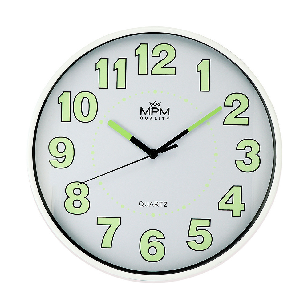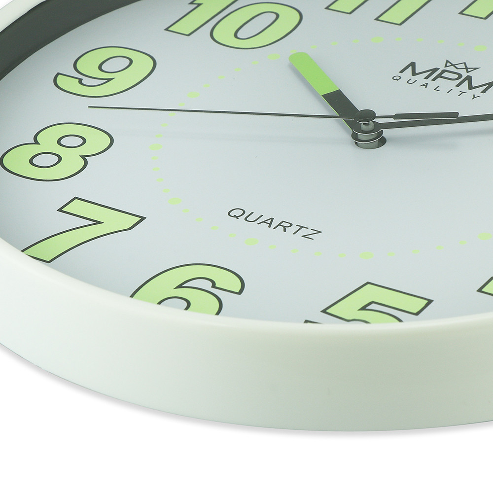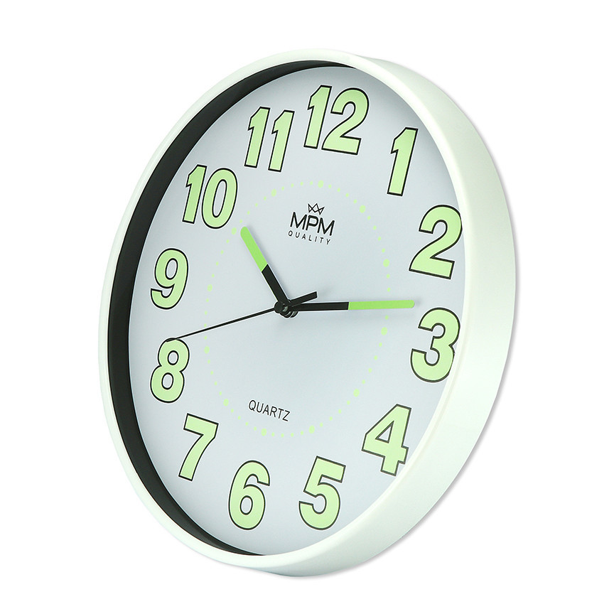 Nástěnné plastové hodiny se zvýrazněnými luminiscenčními číslicemi a ručičkami. Díky kvalitnímu quartzovému strojku s plynulým chodem je pohyb sekundové ručičky prakticky neslyšitelný. Ručičky jsou navíc od případného poškození chráněny minerálním sklem.