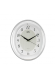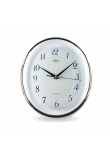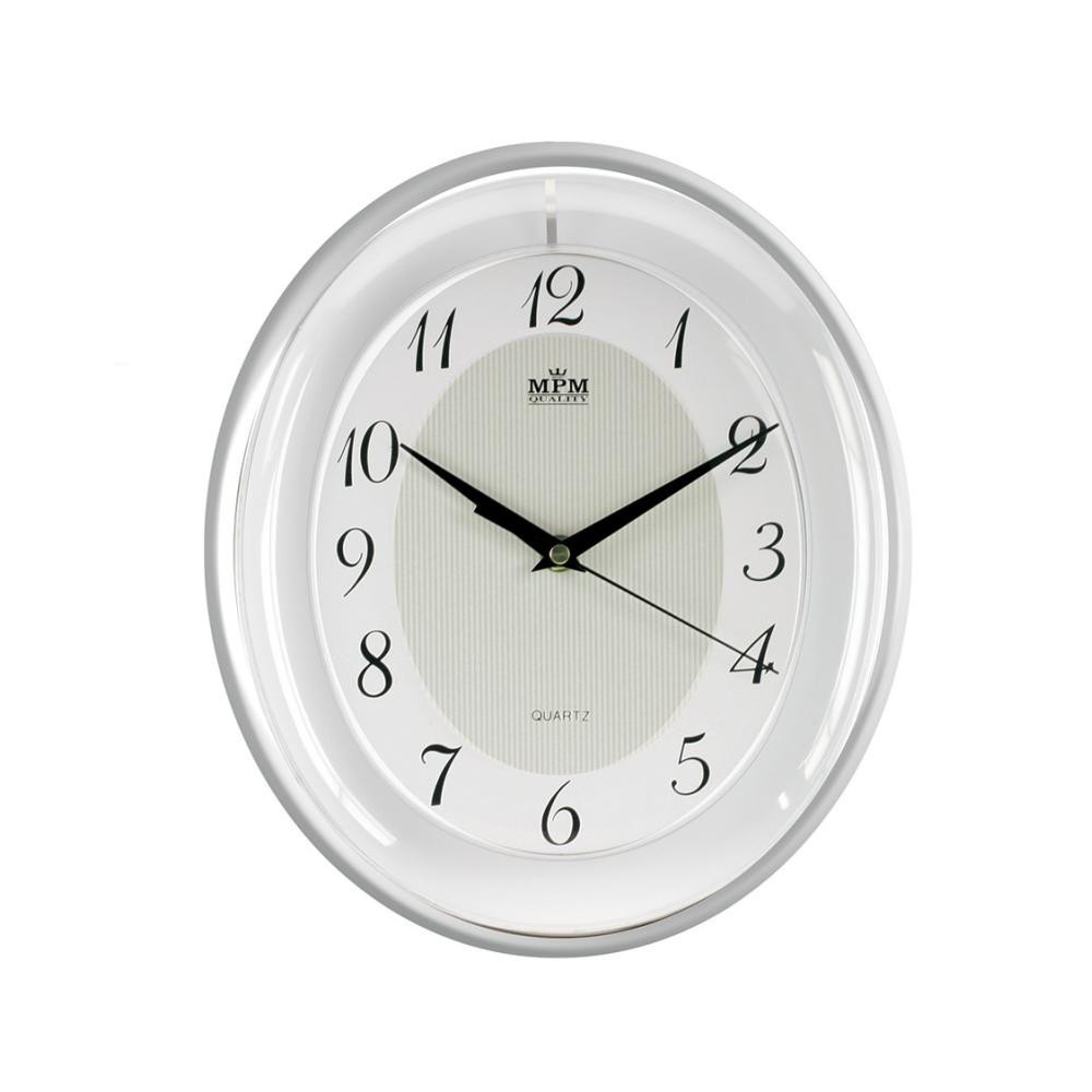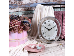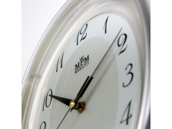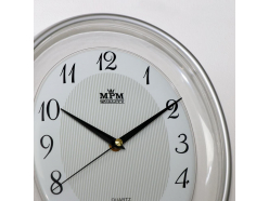 Oválné nástěnné plastové hodiny tón v tónu s minerálním sklem.