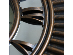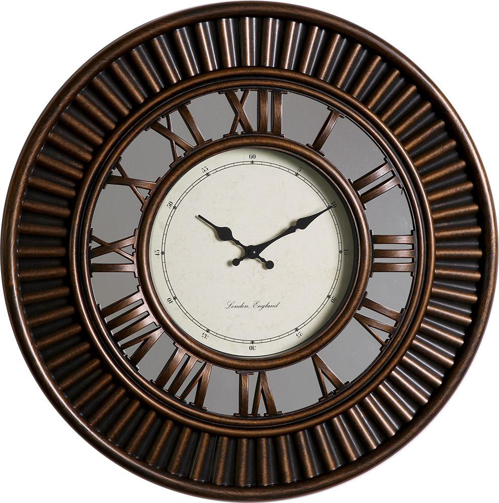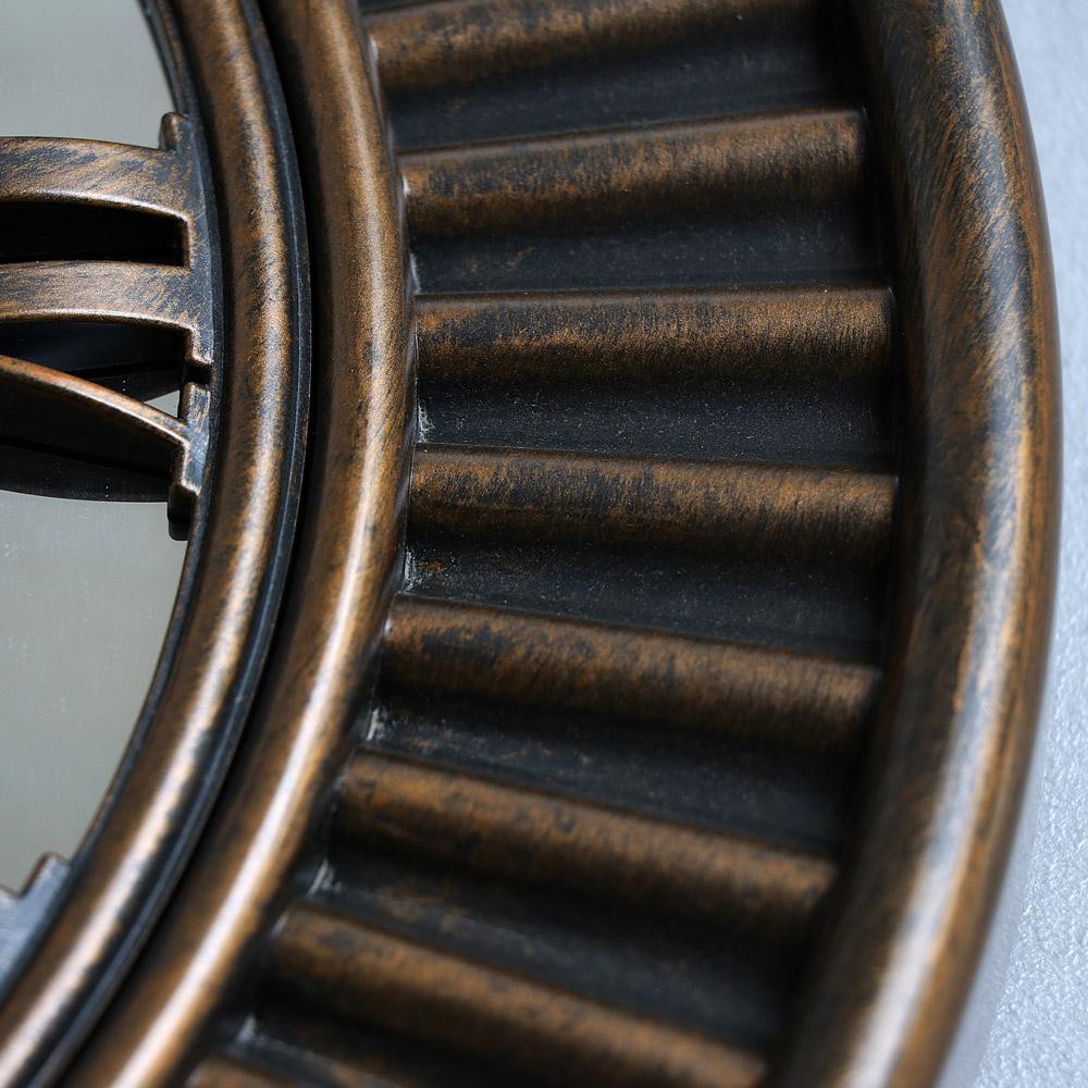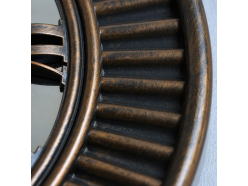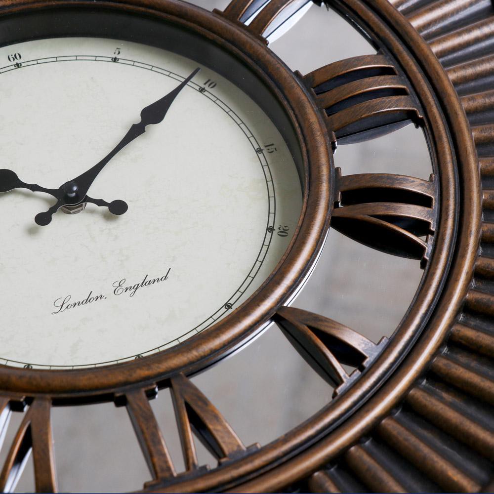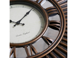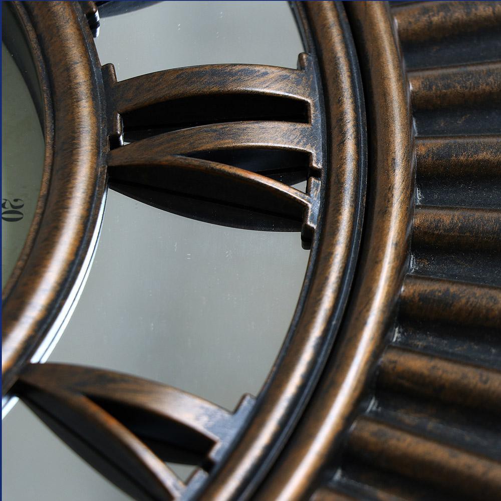 Retro nástěnné hodiny se zrcadlem a netradičně umístěnými indexy.