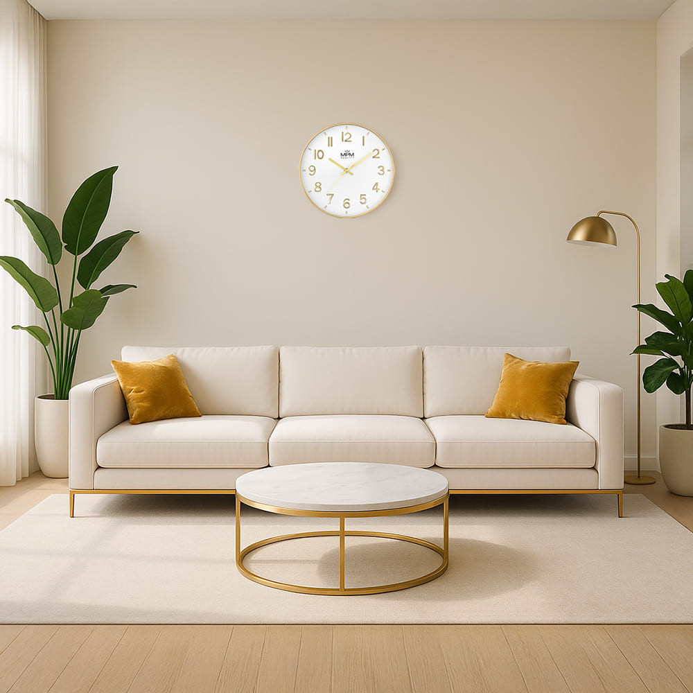 Nástěnné plastové hodiny s pozlacenými komponenty. Hodiny jsou osazeny kvalitním strojkem zajišťující plynulý pohyb sekundové ručičky. Elegantní vzhled těchto hodin skvěle podtrhne atmosféru vašeho domova.