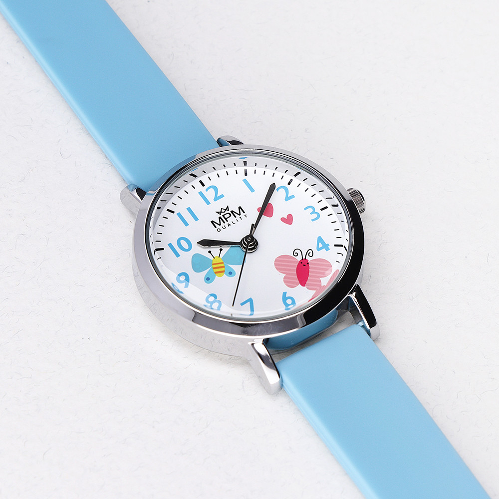 Dětské hodinky MPM zkrášleny obrázky motýlků s ladícím silikonovým řemínkem. Pouzdro hodinek v kvalitním provedení s víčkem z nerezové oceli a s voděodolností 5 ATM.