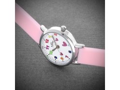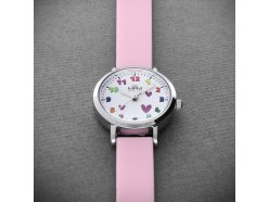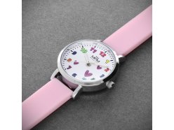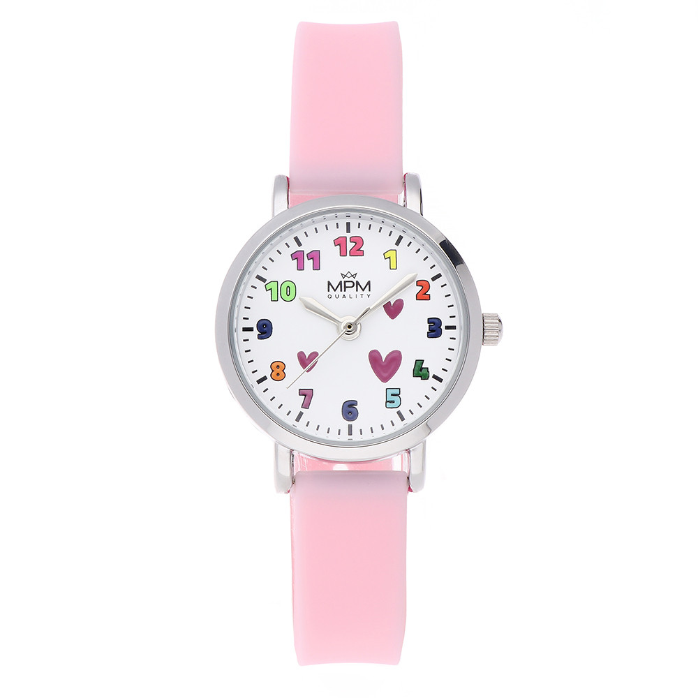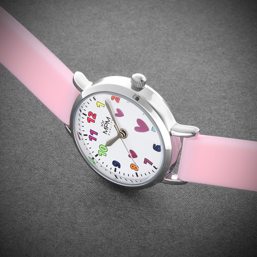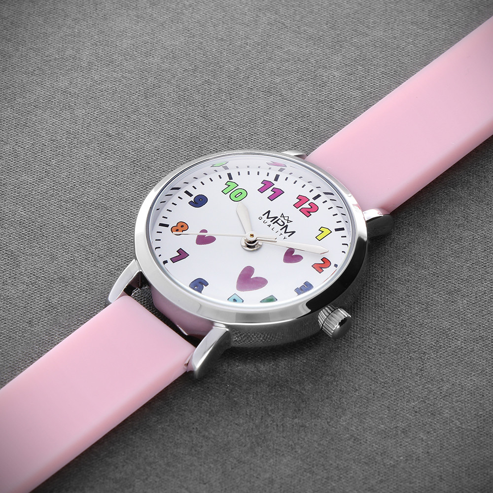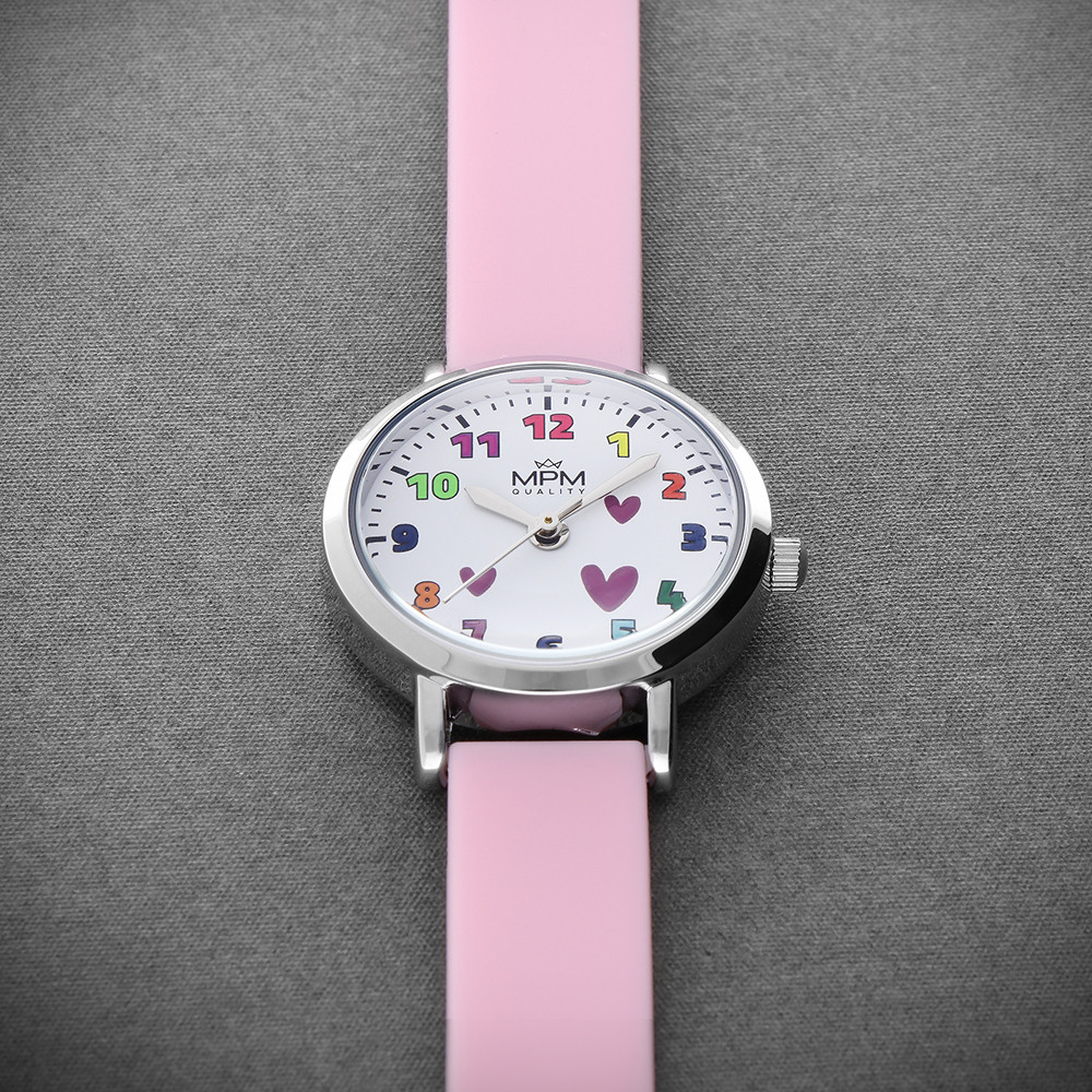 Dívčí model dětských MPM hodinek na silikonovém pásku. Pro tento model byly zvoleny kovové sword ručičky ve tvaru mečů. Motiv srdíček na číselníku hodinek doplňují arabské číslice v plném spektru barev. Pěkný design hodinek zaručeně potěší každou malou slečnu.