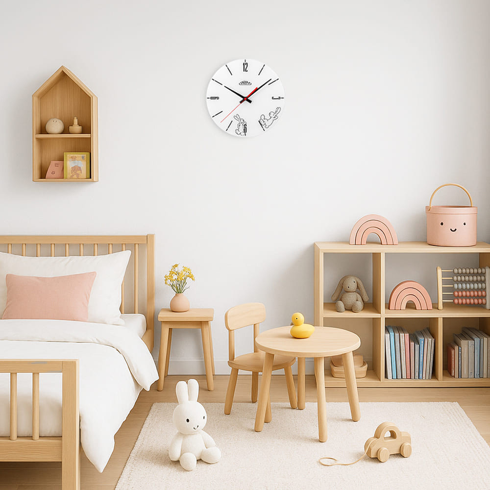 Nástěnné hodiny s postavičkami oblíbených večerníčkových hrdinů, králíků Boba a Bobka. Veselé motivy ve dvou provedeních probudí úsměv na tváři a slyšíte? Jakoby zdálky? „Vstávat a cvičit!“