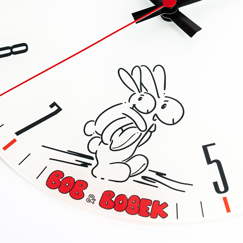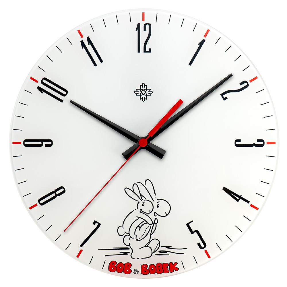 Wall clock with characters of the favourite cartoon heroes, rabbits Bob and Bobek. Cheerful motifs in two versions will bring a smile to your face and can you hear? As if from afar? "Get up and exercise!"