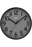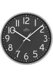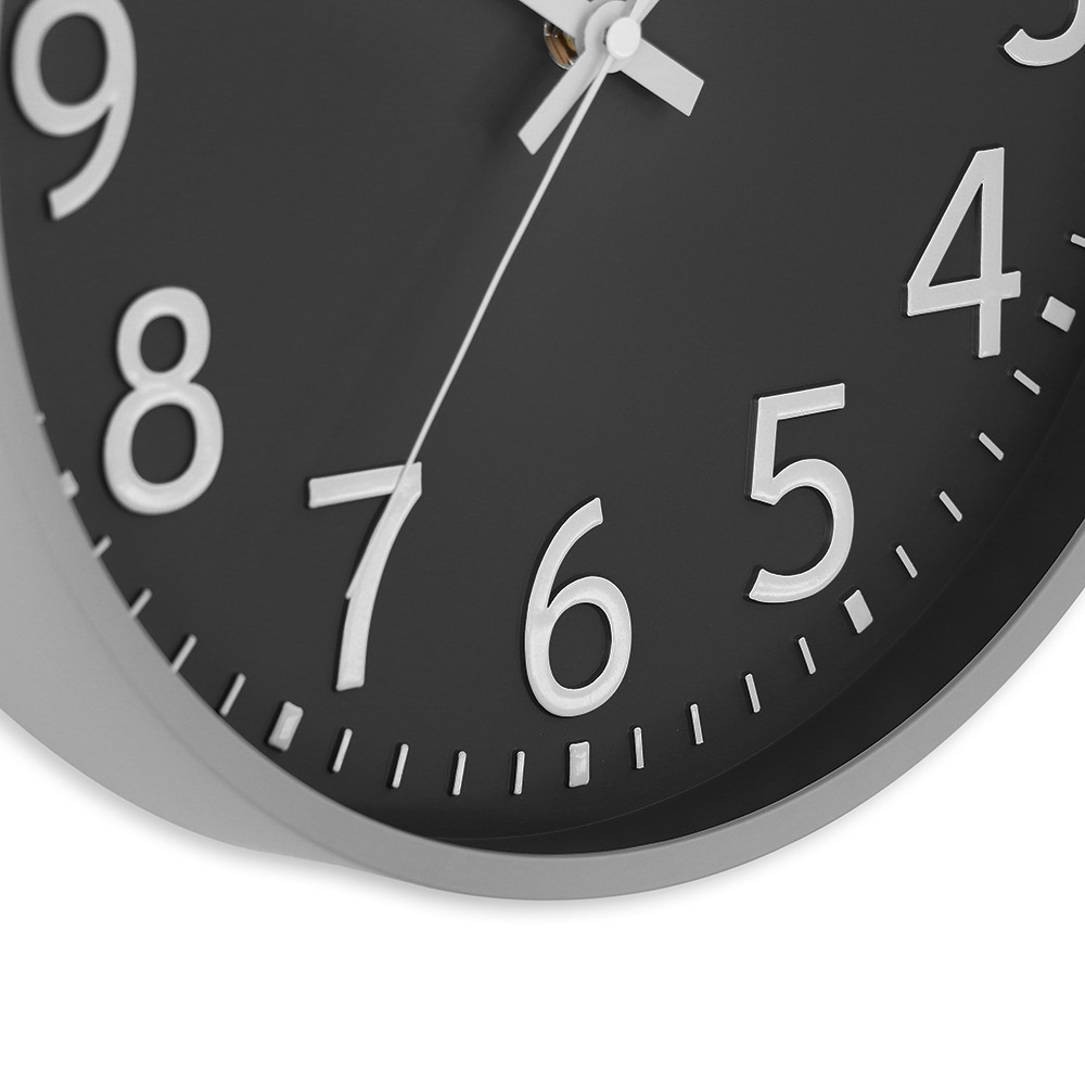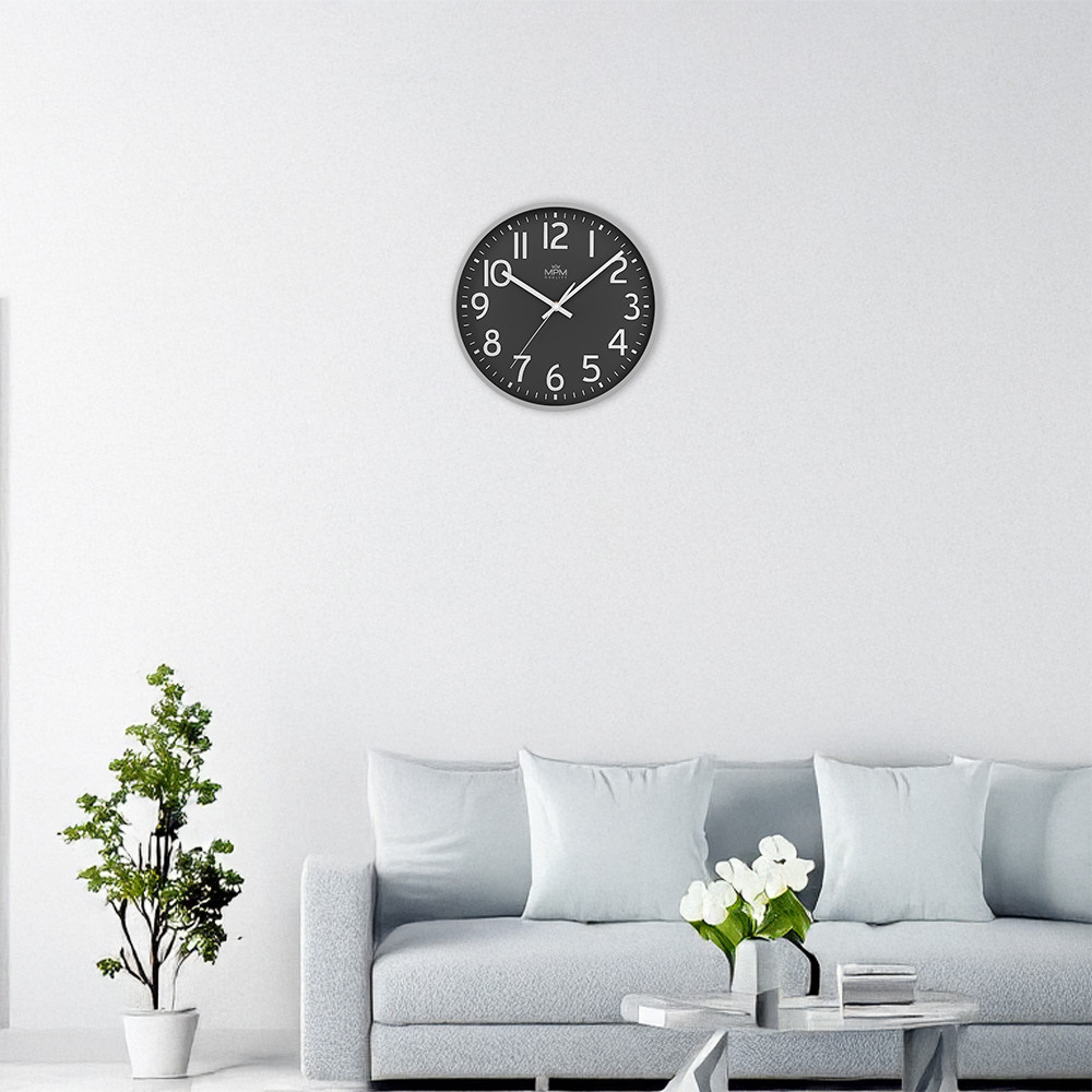 A collection of modern plastic wall clocks, this time with a dark but elegant dial. The protruding Arabic numerals, the hour hands and the front of the clock frame are perfectly colour-coordinated.