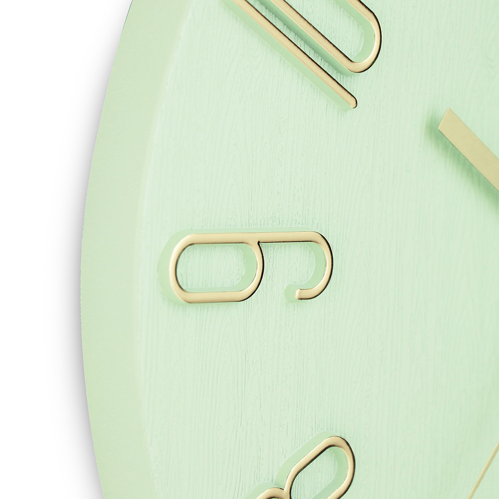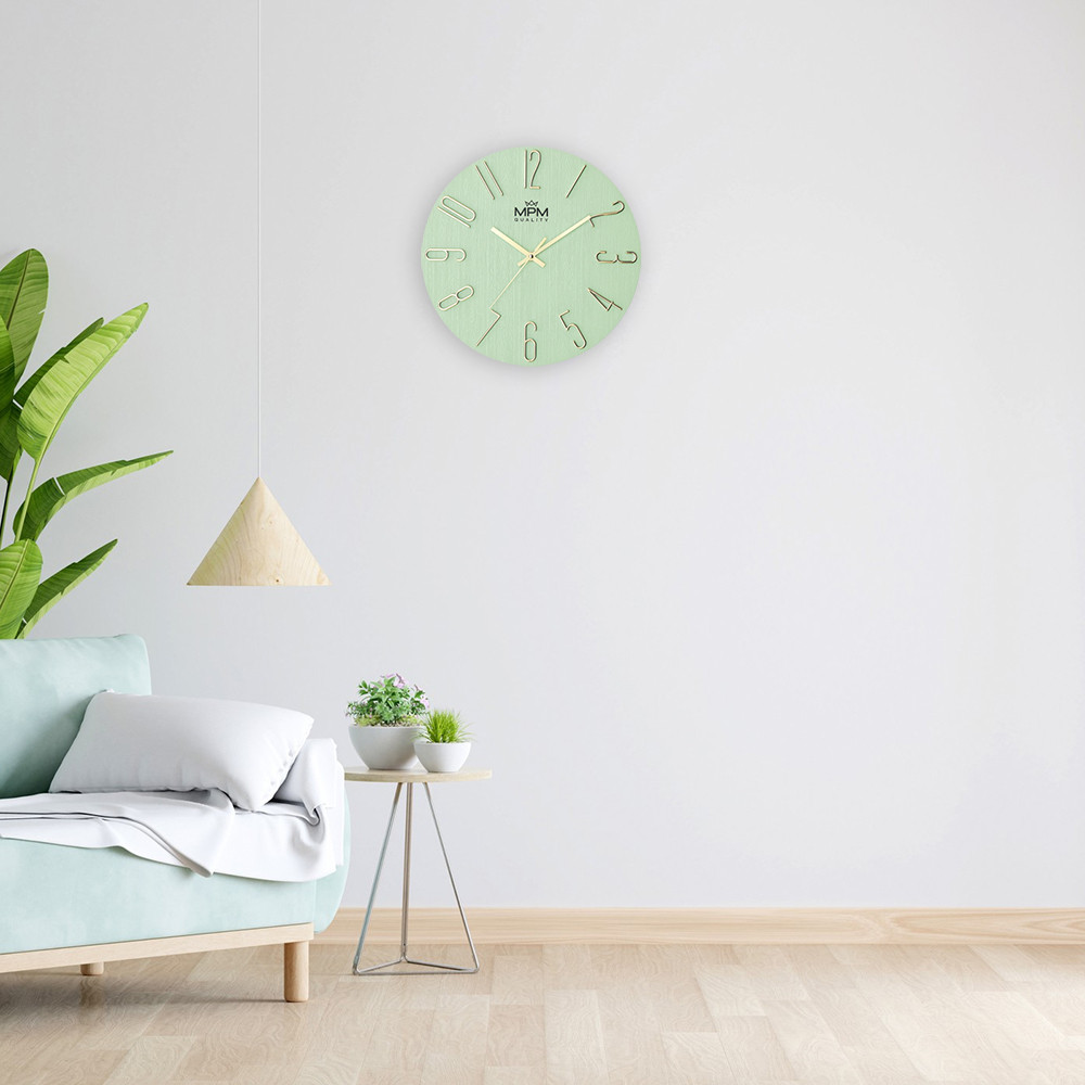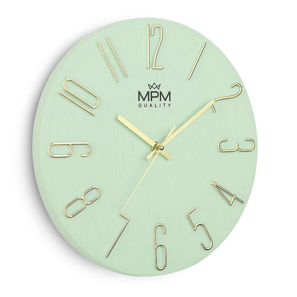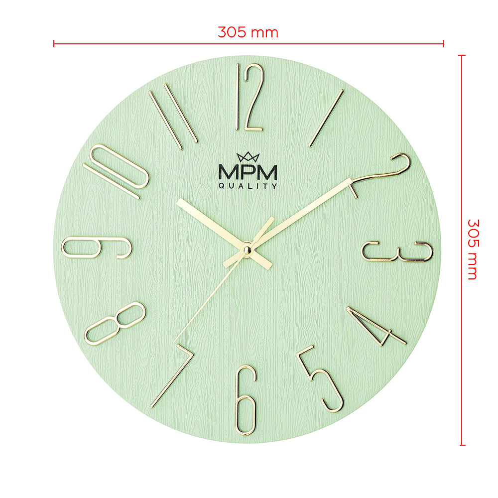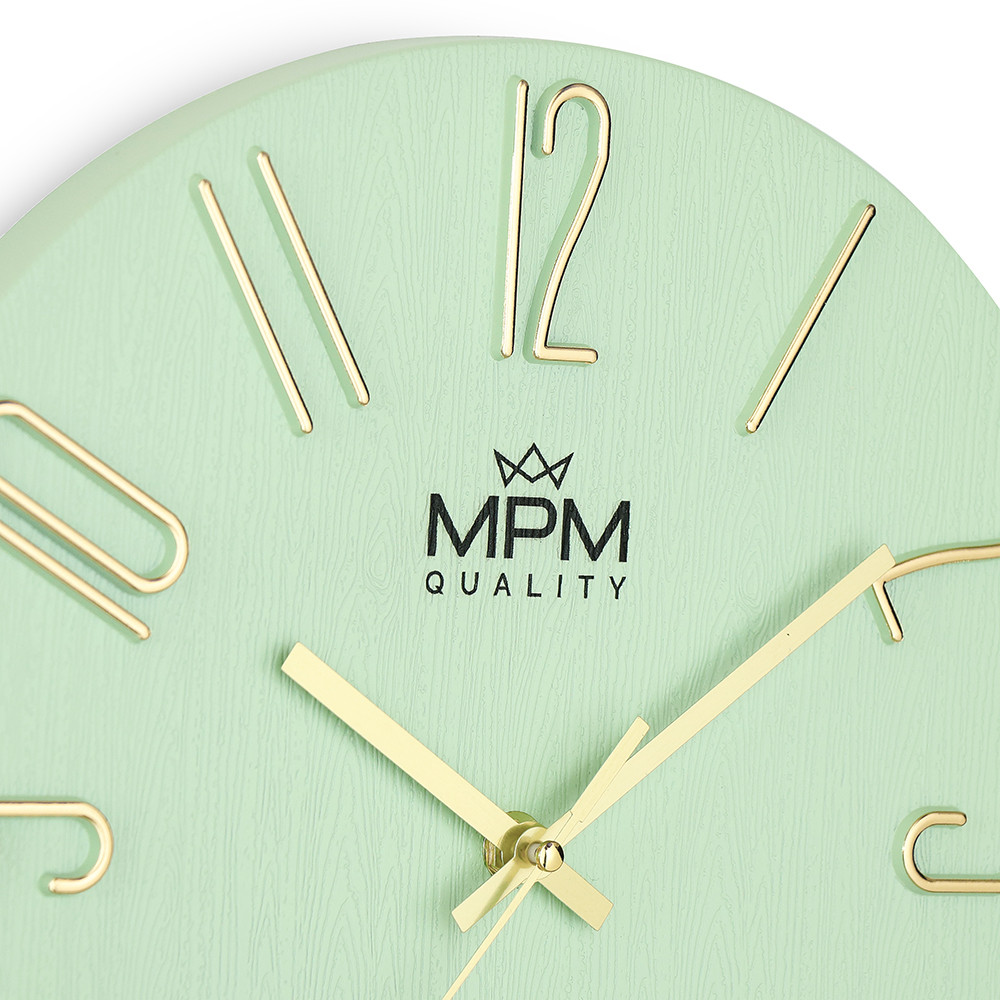MPM Primera plastic wall clock with a pattern of annual rings in different colour shades. The hands and raised Arabic numerals are gilded and placed perpendicular to the center of the dial. The numbers are rotated to always maintain easy readability. The clock is equipped with a Quartz movement.