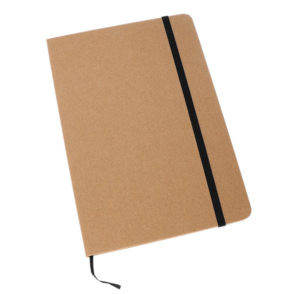 Lined notebook with recycled kraft paper covers. The notebook contains 80 lined A5 sheets. The notebook includes a textile bookmark and a locking elastic band to prevent unwanted opening.