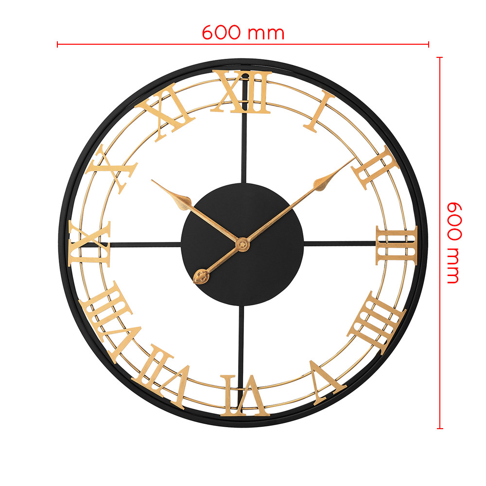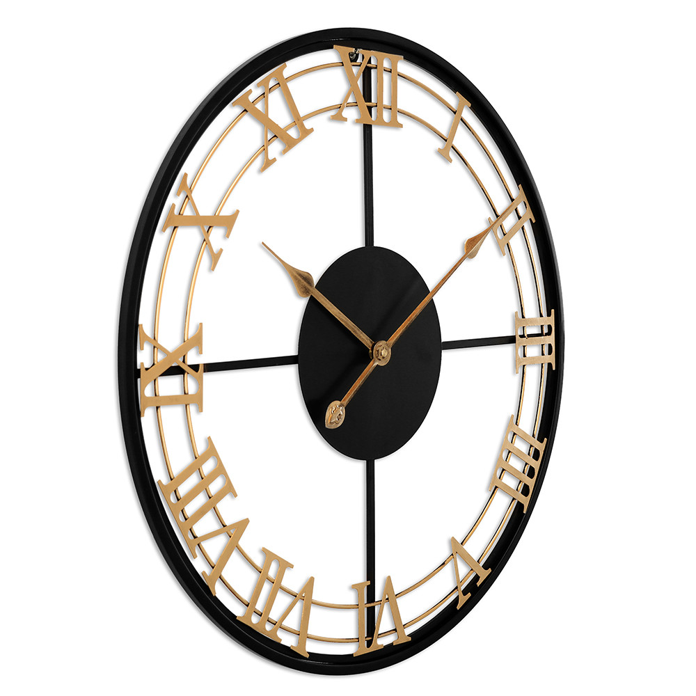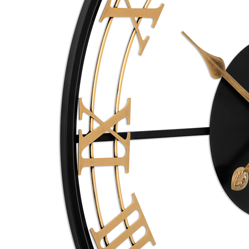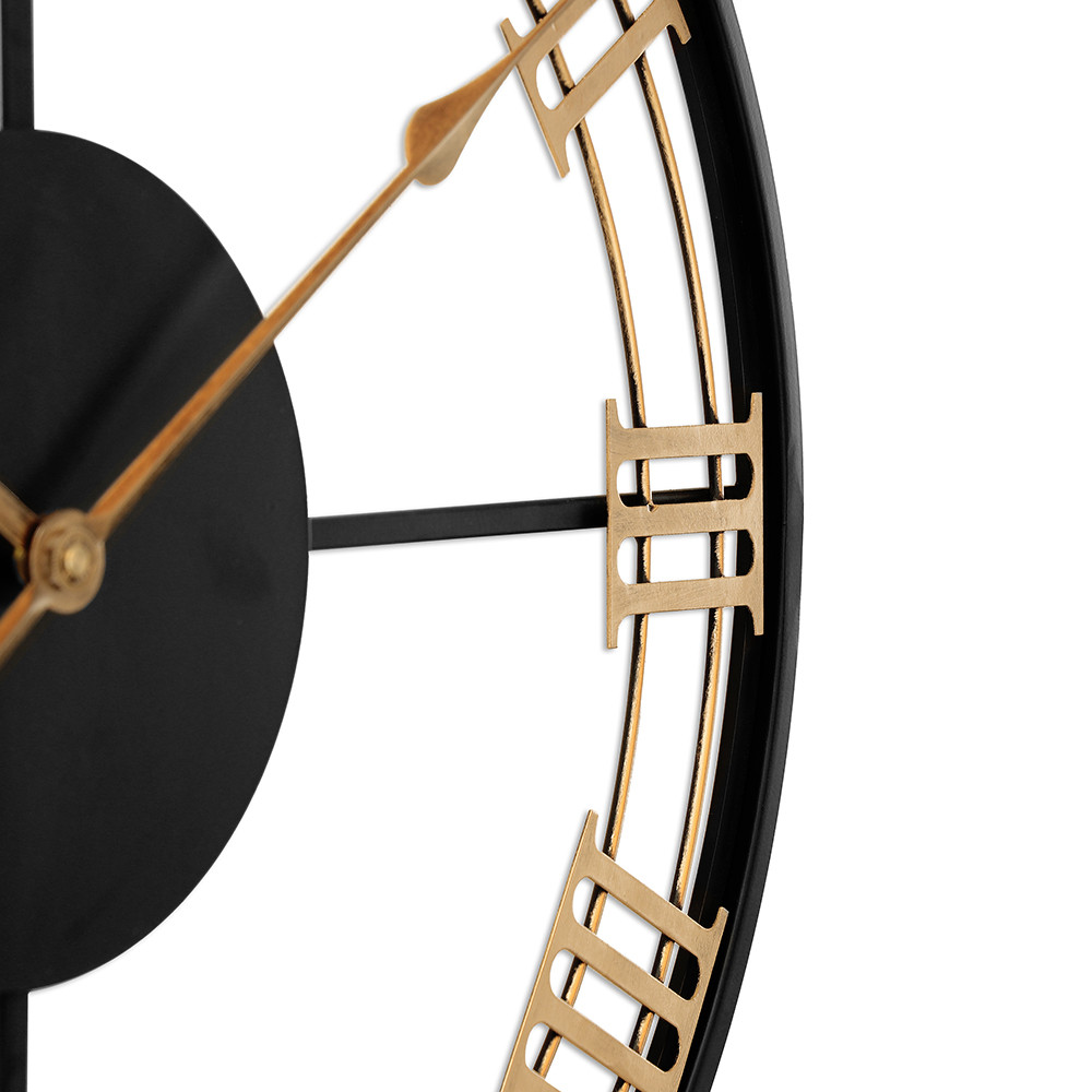 The design metal clock with a diameter of 60 cm in antique style catches the eye at first glance. The combination of gold and black in this clock will perfectly enliven the interior and bring a fresh touch of elegance to it.