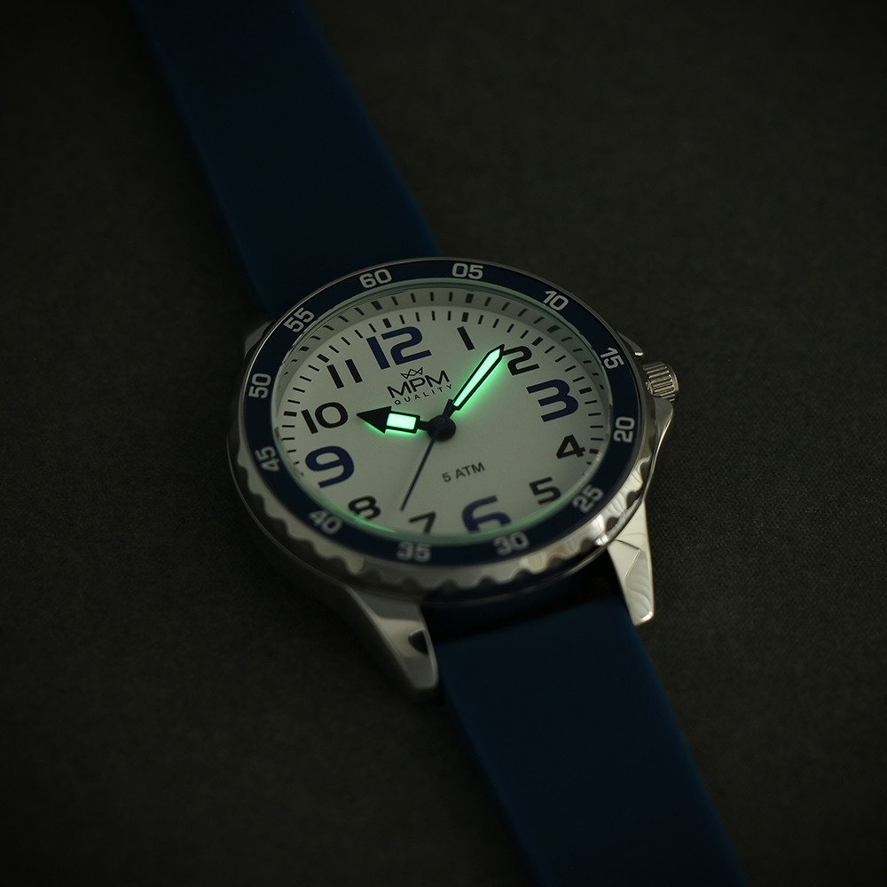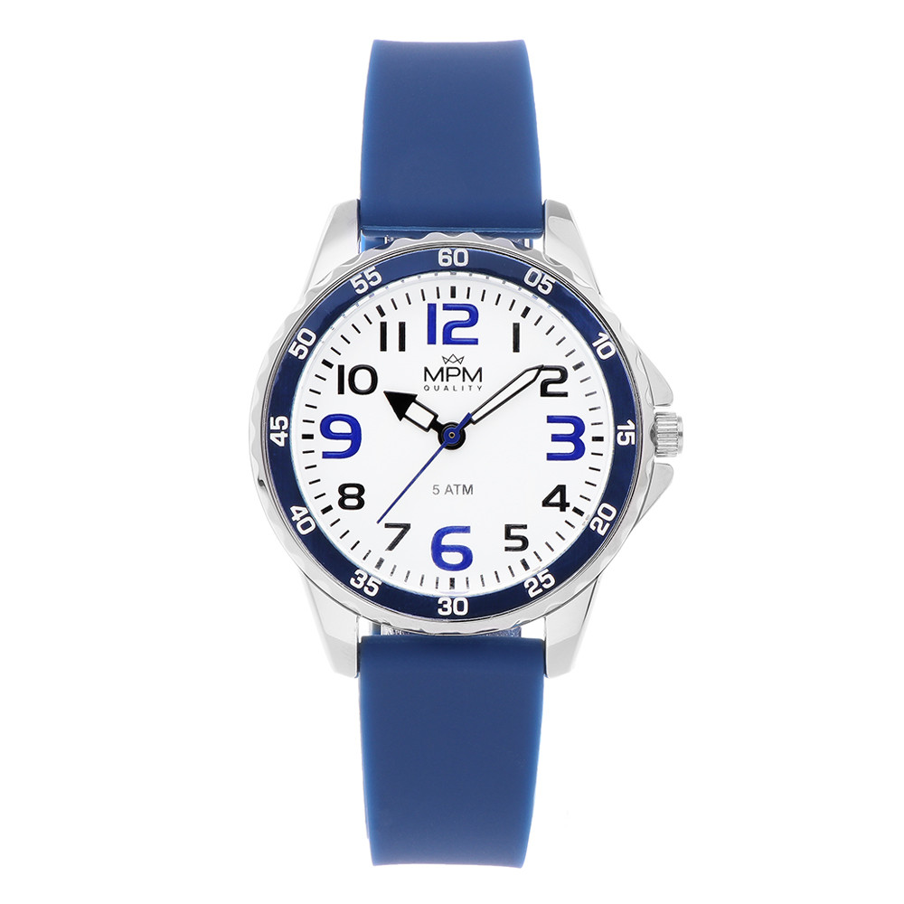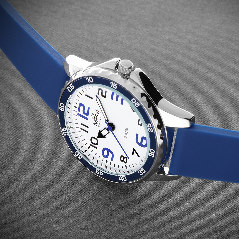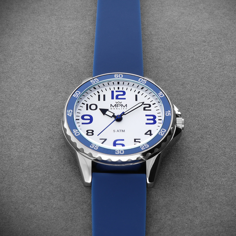 Children's MPM watch suitable for both boys and girls. The readability of the watch is facilitated by the size of the numerical indexes used together with the distinct hands. The appearance of the hands combines the shape of an arrow and a sword, which are additionally covered with a luminescent layer. The dial of the watch is complemented by a colourful seconds hand. We equipped the watch with a really soft silicone strap so that your children do not restrict any activity and they have a constant sense of time.