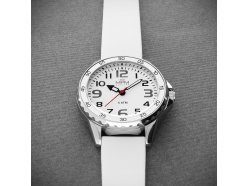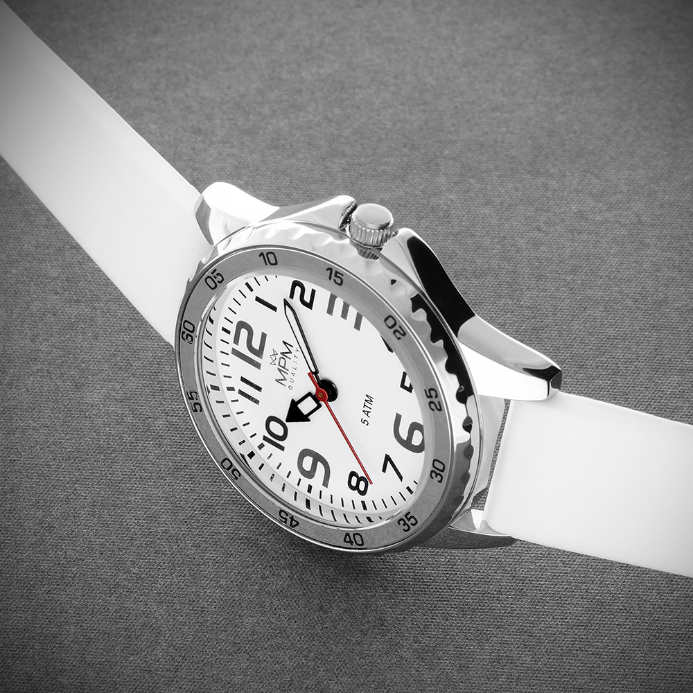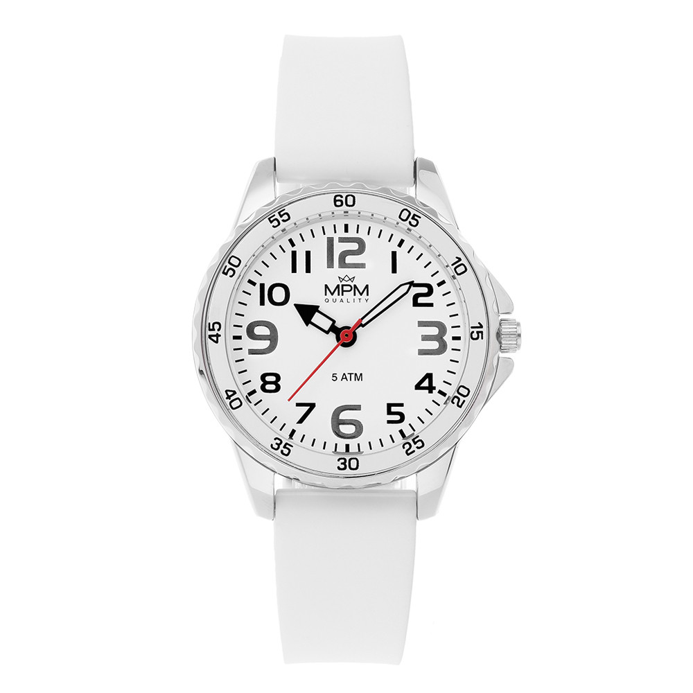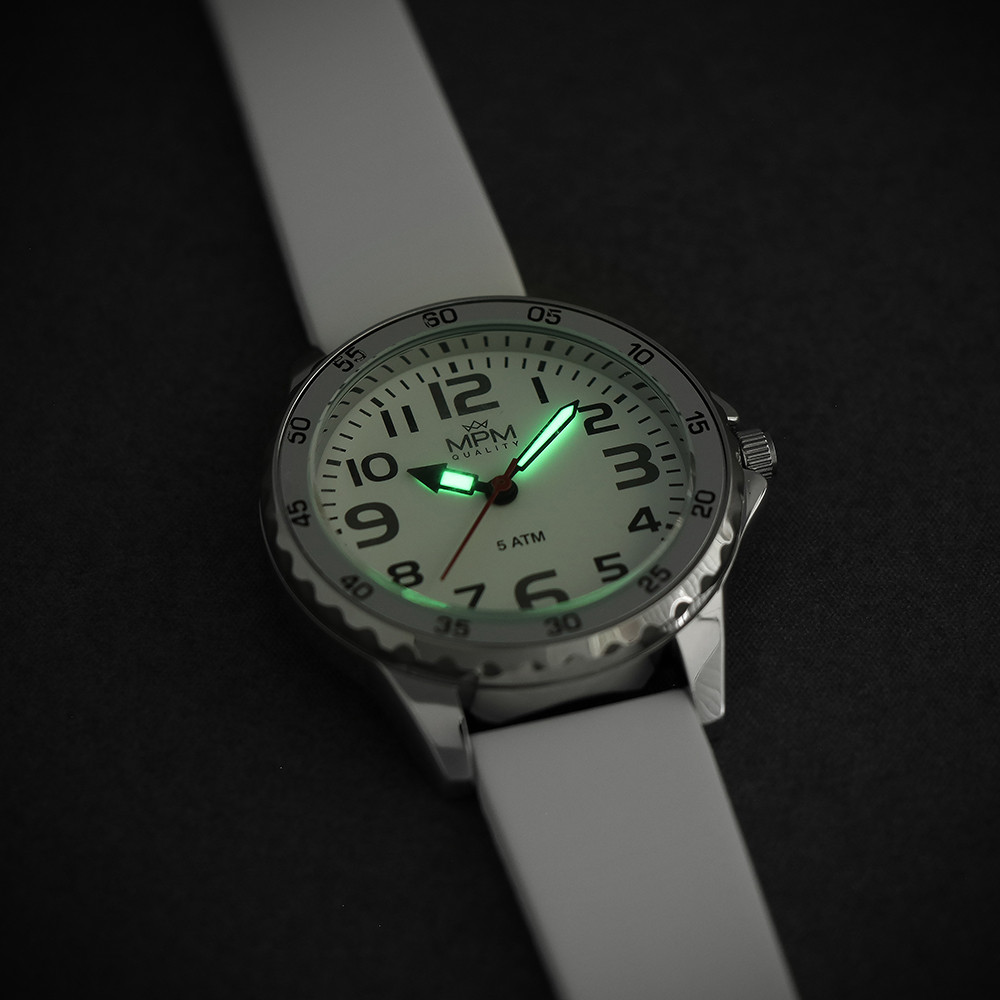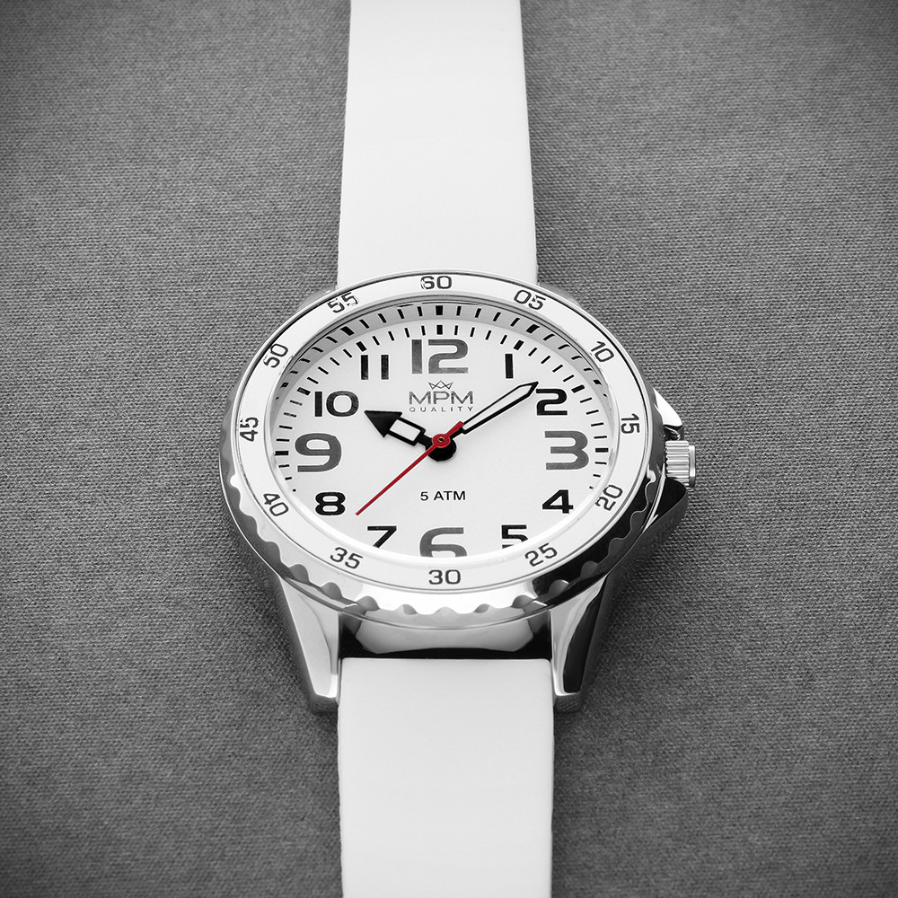 Children's MPM watch suitable for both boys and girls. The readability of the watch is facilitated by the size of the numerical indexes used together with the distinct hands. The appearance of the hands combines the shape of an arrow and a sword, which are additionally covered with a luminescent layer. The dial of the watch is complemented by a colourful seconds hand. We equipped the watch with a really soft silicone strap so that your children do not restrict any activity and they have a constant sense of time.