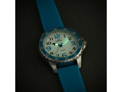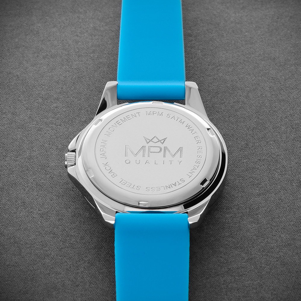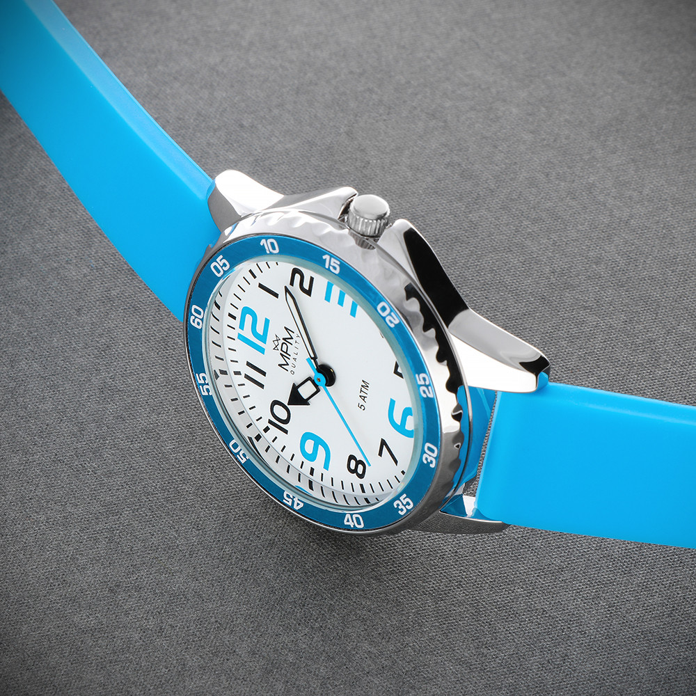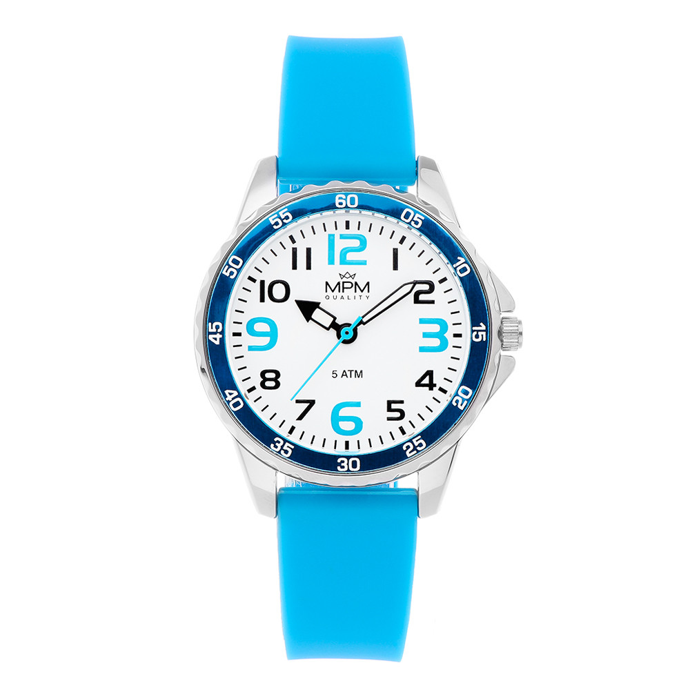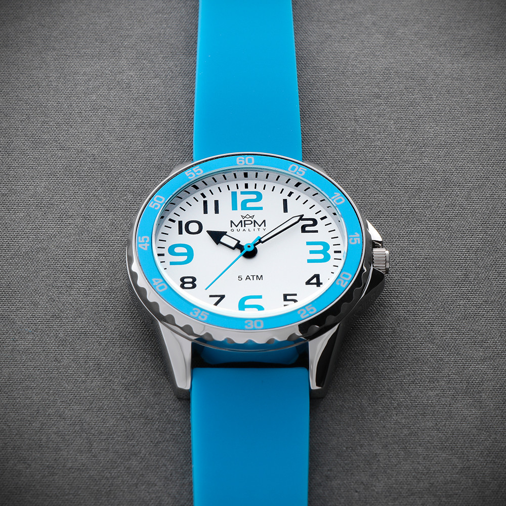 Children's MPM watch suitable for both boys and girls. The readability of the watch is facilitated by the size of the numerical indexes used together with the distinct hands. The appearance of the hands combines the shape of an arrow and a sword, which are additionally covered with a luminescent layer. The dial of the watch is complemented by a colourful seconds hand. We equipped the watch with a really soft silicone strap so that your children do not restrict any activity and they have a constant sense of time.