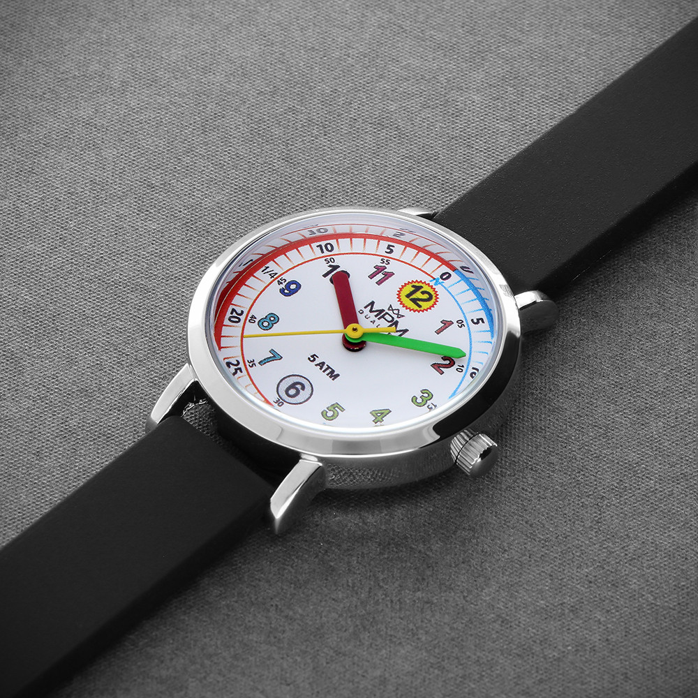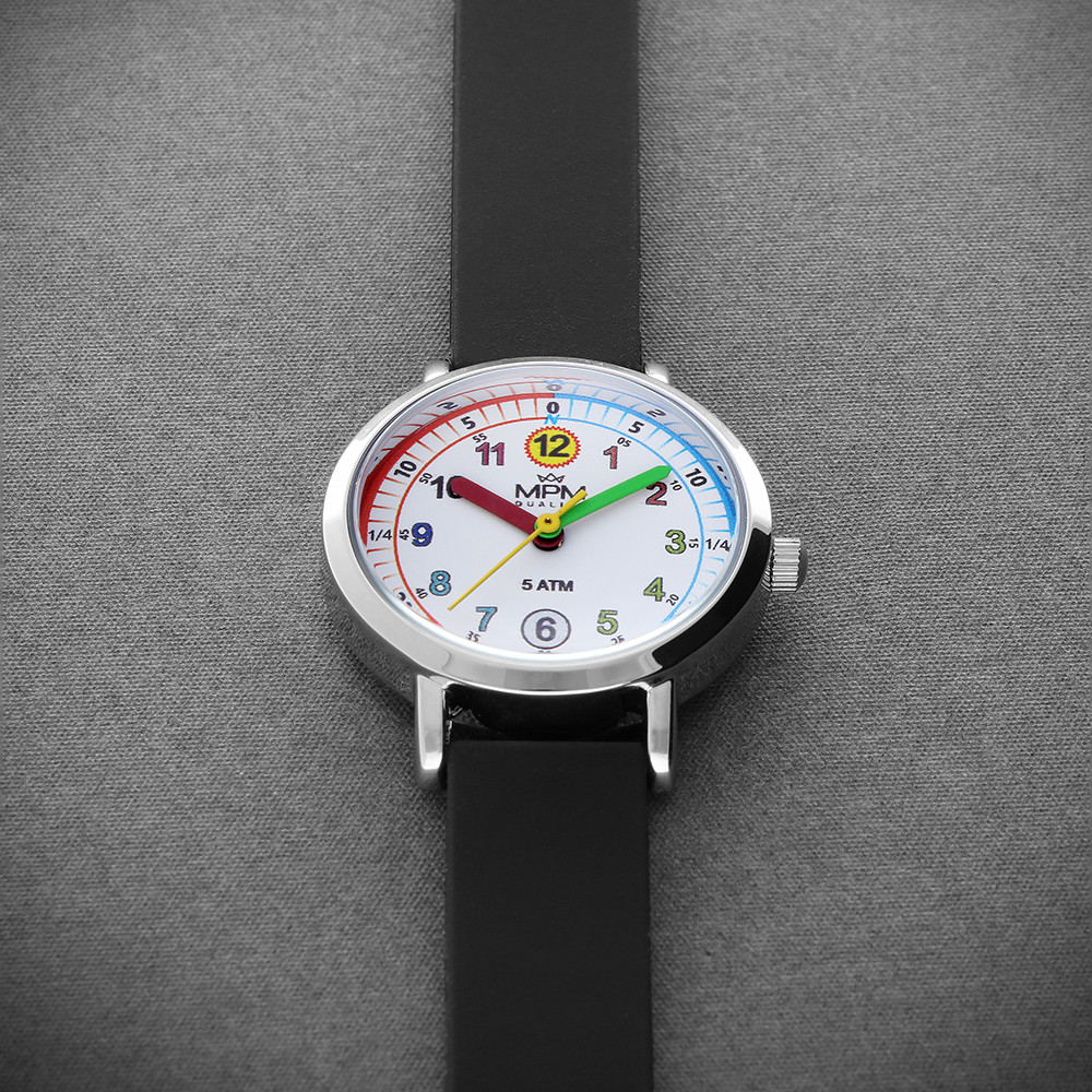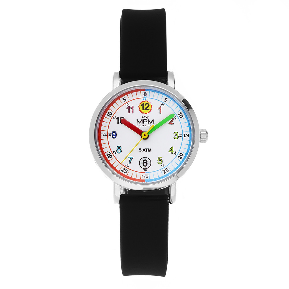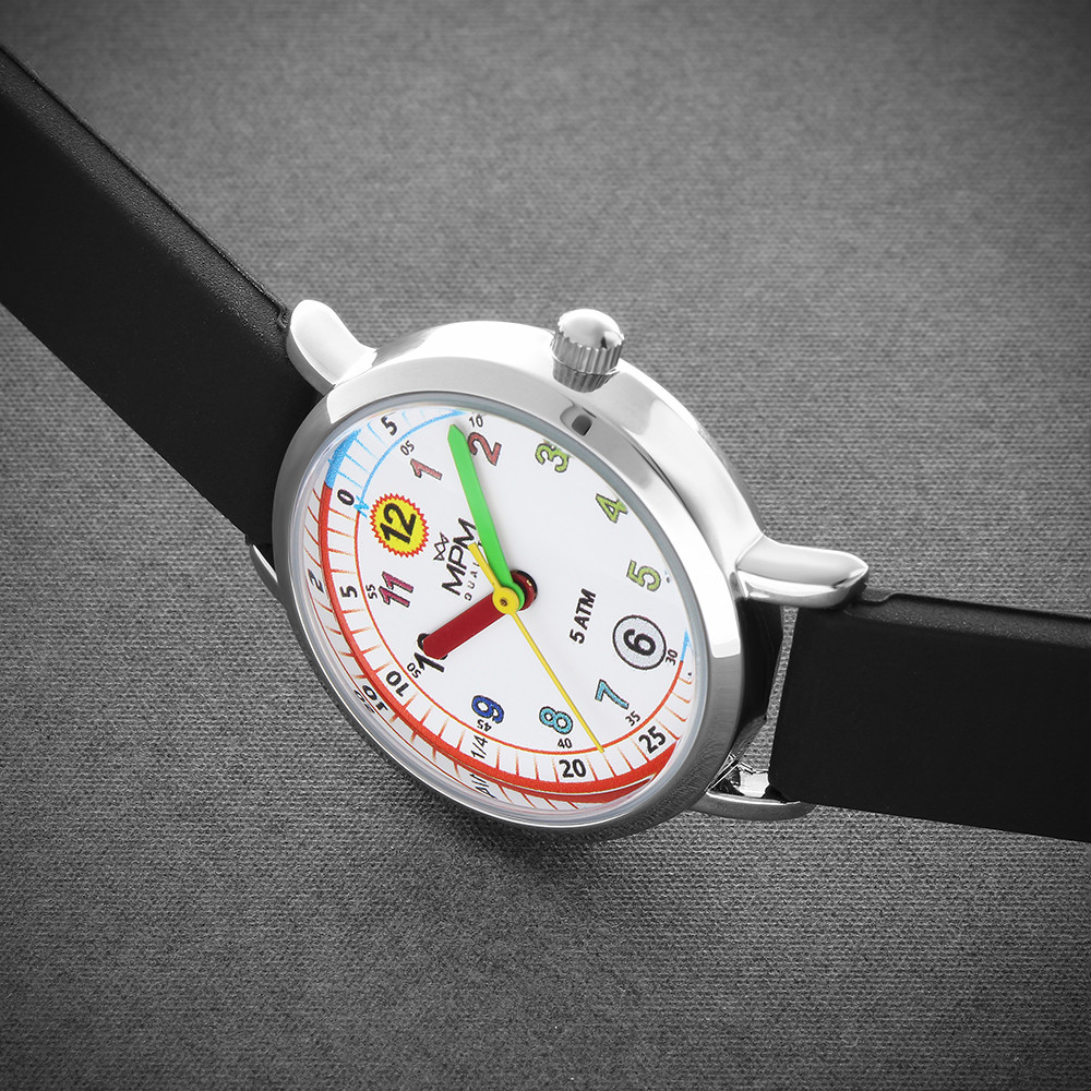 Girl's model of children's MPM watch on a silicone strap. The dial is designed to help children with flawless time recognition. The colourful hands fit perfectly into the theme of the dial. Water resistance of 5 ATM guarantees the basic resistance of the watch against normal humidity.