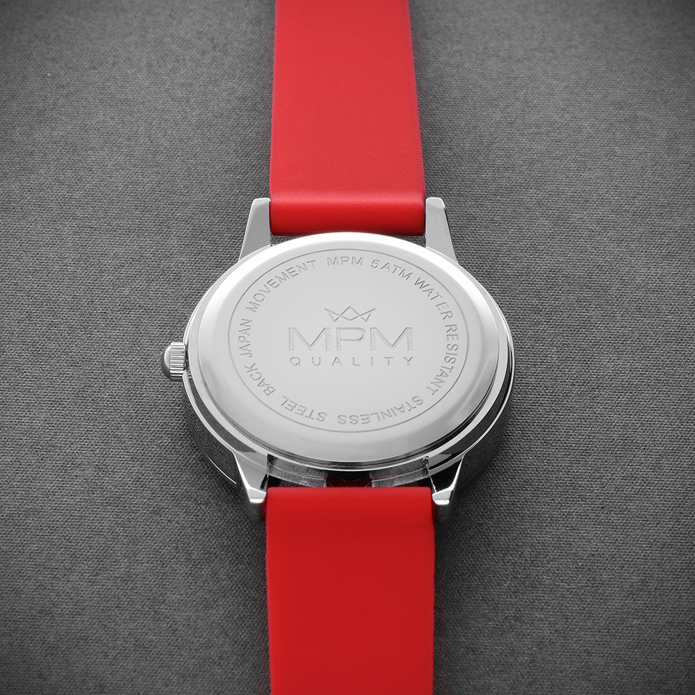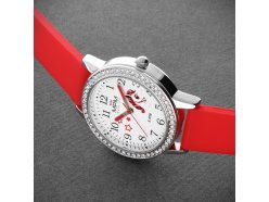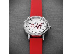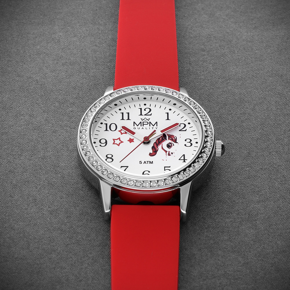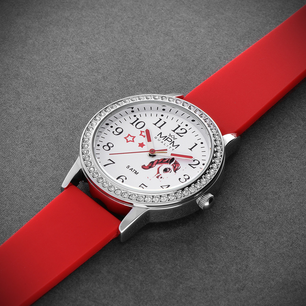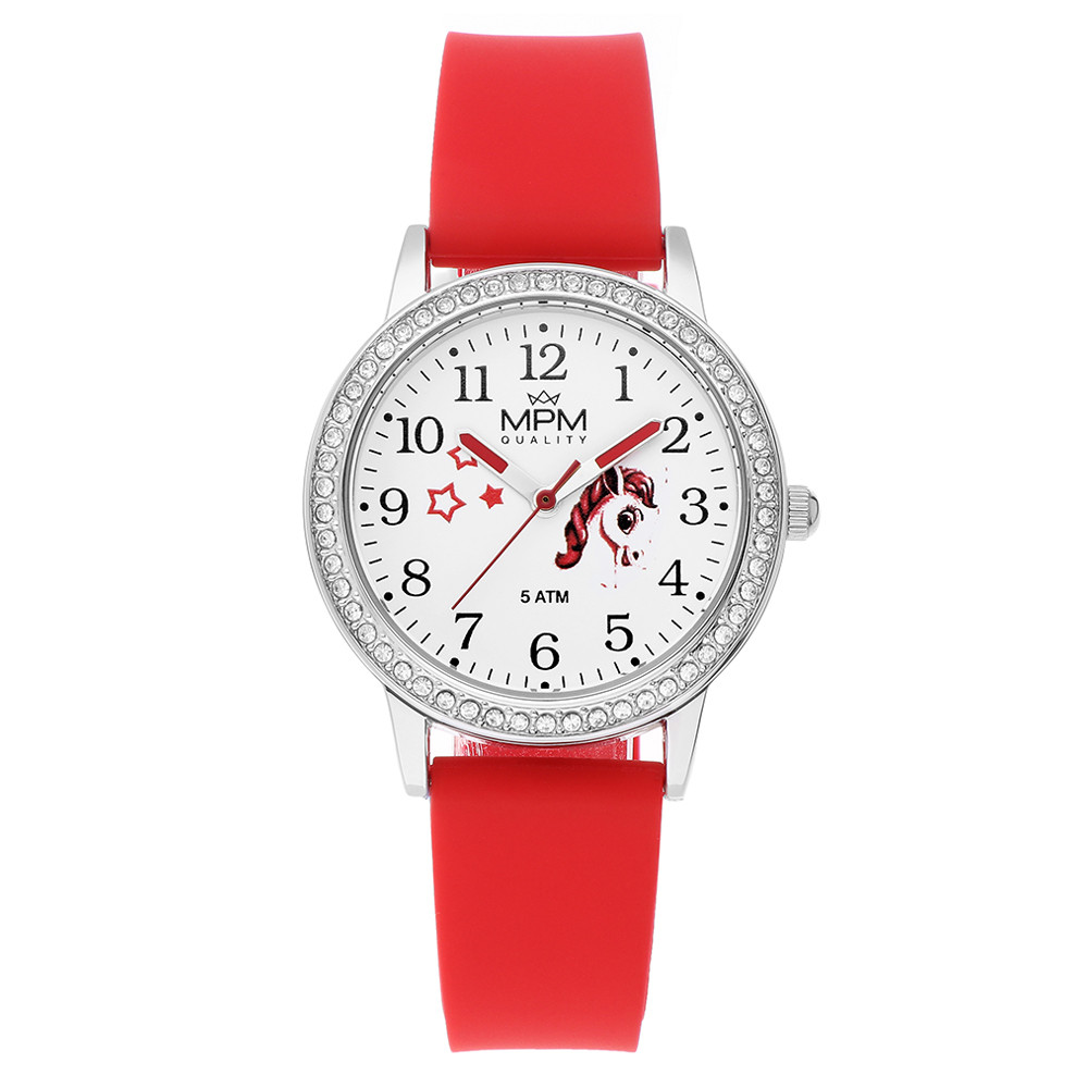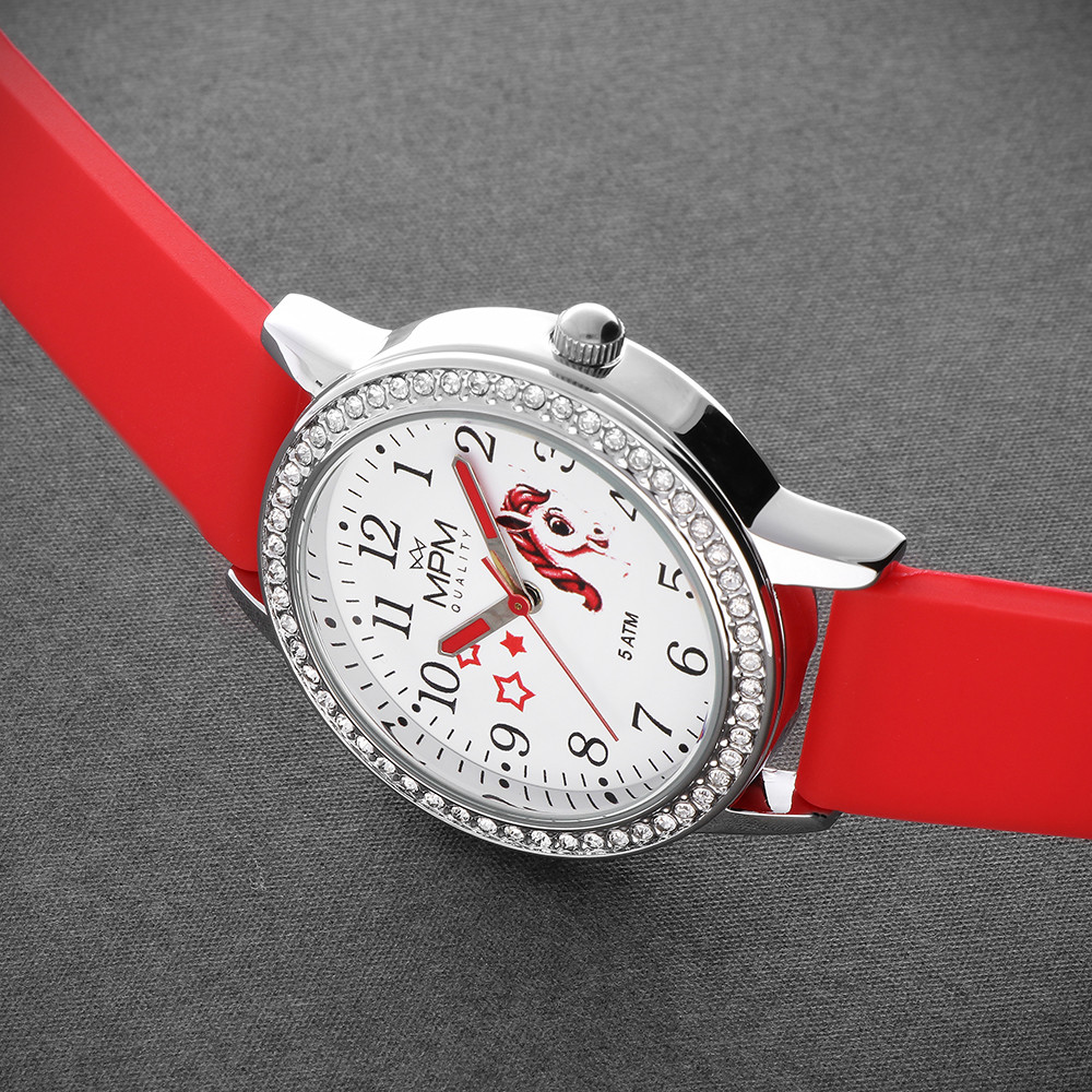 Stylish girls' model of children's MPM watch with a pony motif and three stars. The watch is equipped with silver pencil hands, with a coloured imitation of a luminescent layer, and a thin coloured seconds hand. The dial of the watch is decorated with a pony motif with three stars in compatible colours with the strap. The decorative bezel of the watch case is set with 54 zircons to achieve an elegant look.