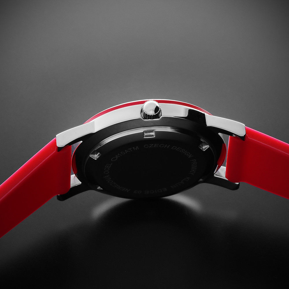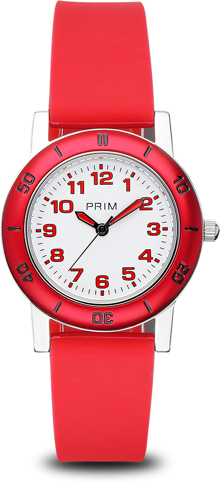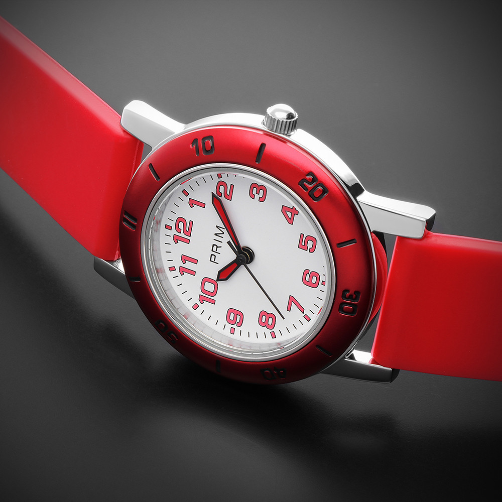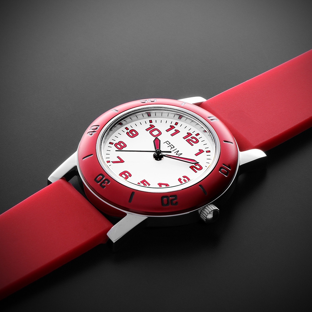 The team of graphic designers was inspired by a clear and easily recognizable dial with Arabic numerals in the colors of the ring and added colorful hands to the model. We also chose bright colors that every schoolchild can choose from, helping them learn to tell time on their first PRIM watch. The minutes are also displayed on a fixed bezel, which helps to recognize the time. The watch is made entirely of 316L stainless steel and is water-resistant to 10 ATM. The overall look is complemented by a new colorful silicone strap.