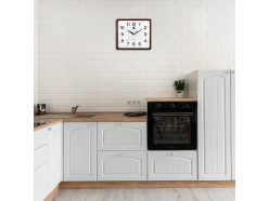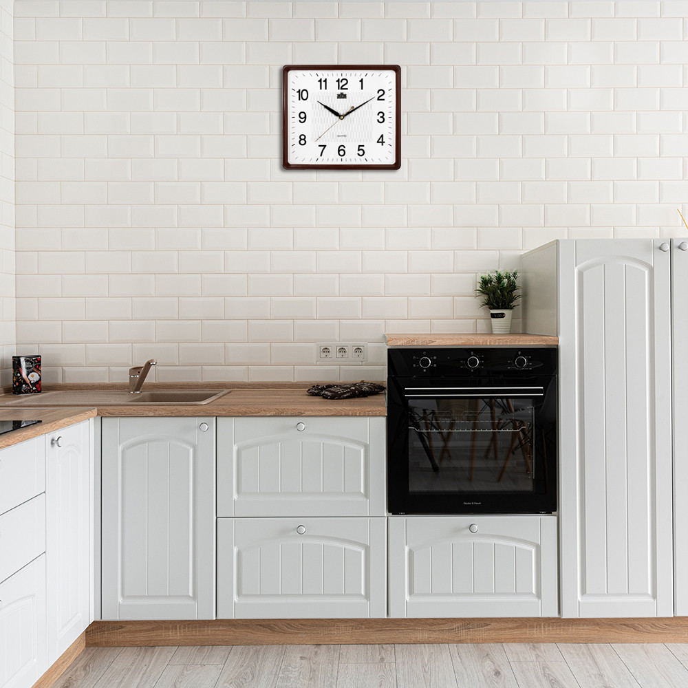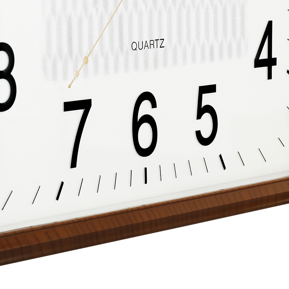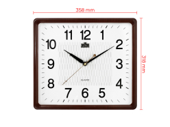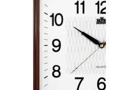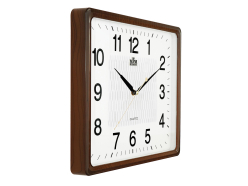 Nástěnné hodiny hranatého tvaru s jemným zdobením uprostřed ciferníku.