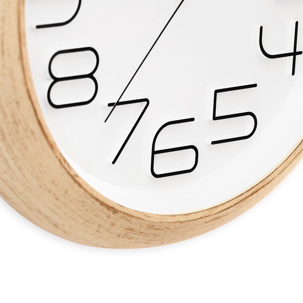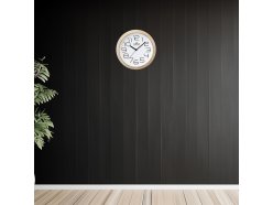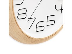 Első pillantásra egy nagyon érdekes műanyag falióra modell. A ragyogó fehér számlapot jellegzetes óramutatók és dombornyomott numerikus indexek egészítik ki, amelyek a természetes árnyékoknak köszönhetően még jobban kiemelkednek. Az egész számlapot fadíszes keret veszi körül. A keret lekerekített formája sokkal könnyebbé teszi a kezelést, akár felszereléséről, akár az elemcseréről van szó, valamint minimálisra csökkenti a kicsúszás veszélyét. A kiváló minőségű, egyenletes járású kvarcmű biztosítja, hogy az óra a lehető legcsendesebben, bosszantó ketyegés nélkül járjon. Az óra élő növényekkel együtt fog a legjobban mutatni beltérben, de ez nem követelmény.