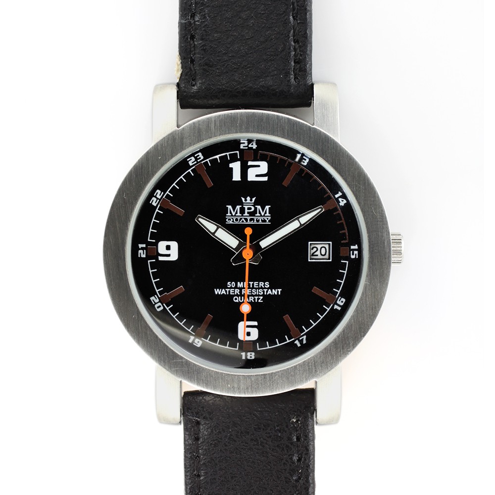 Moderní pánské hodinky s datumem a černým koženým řemínkem