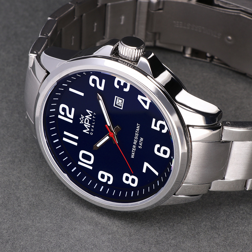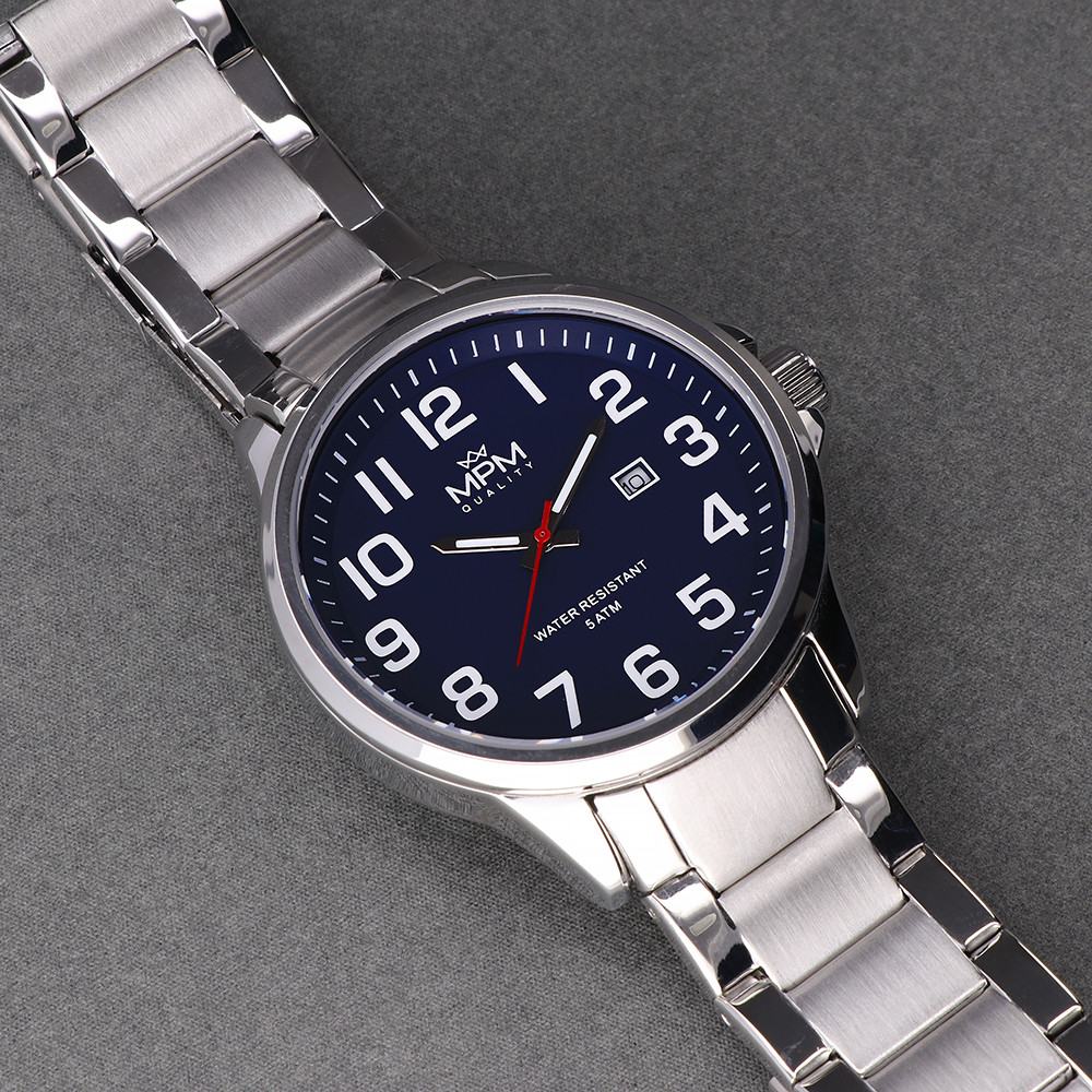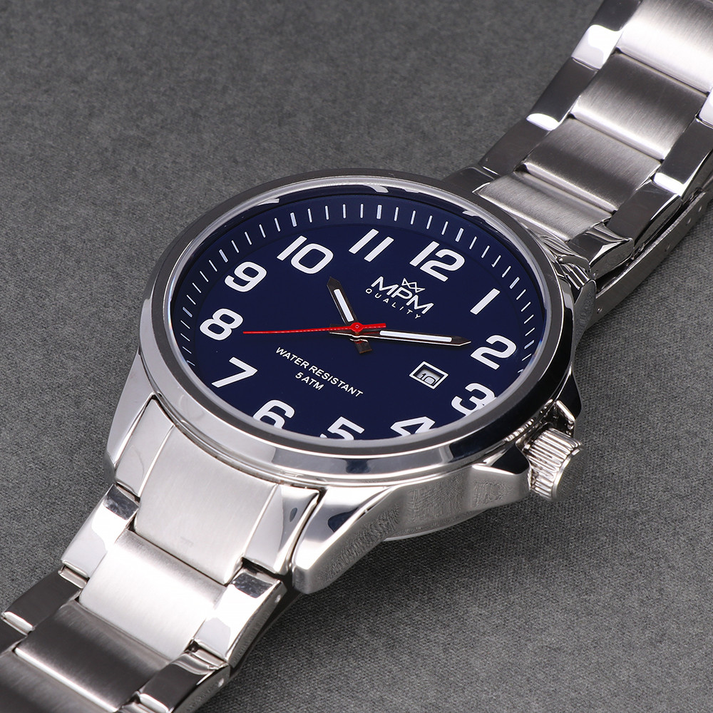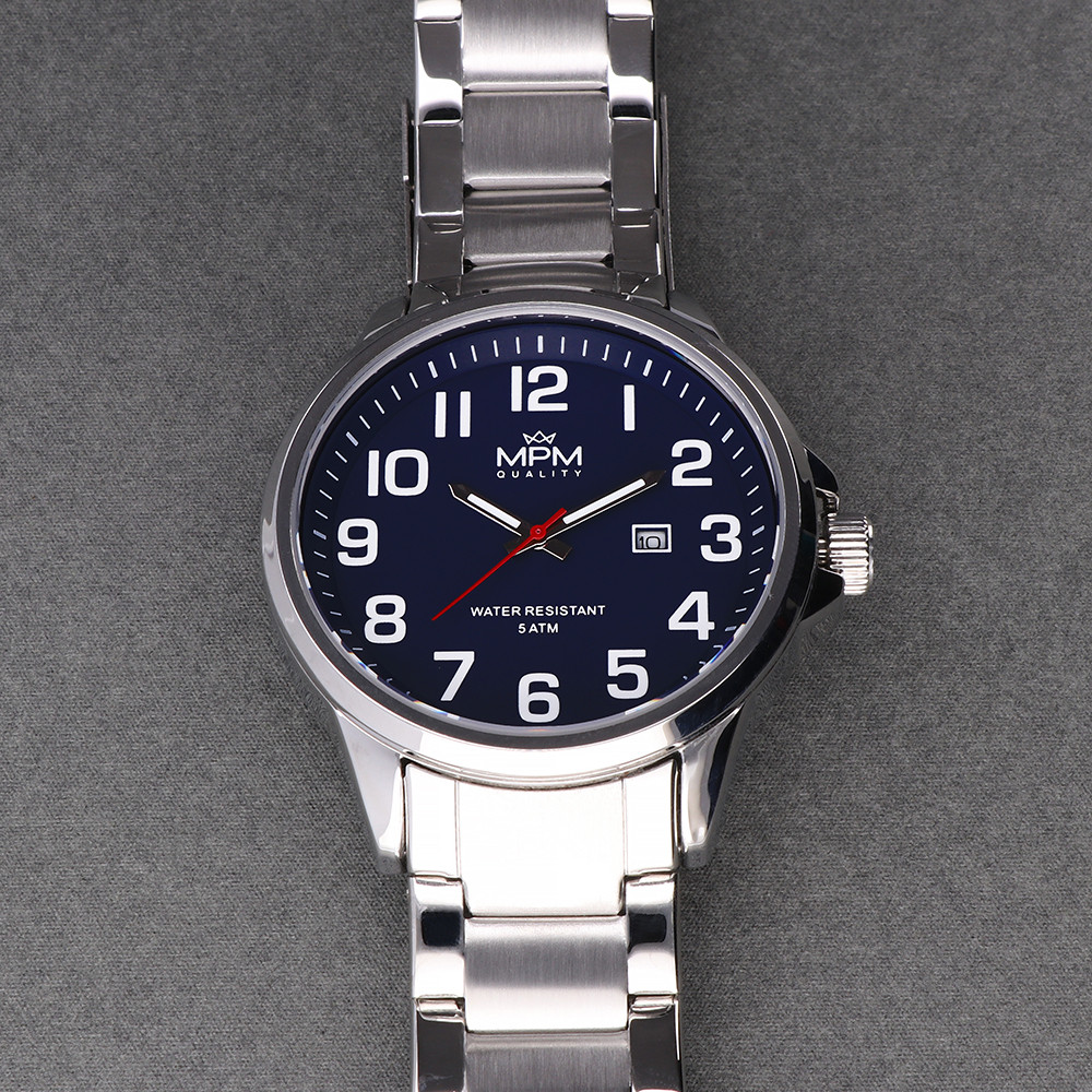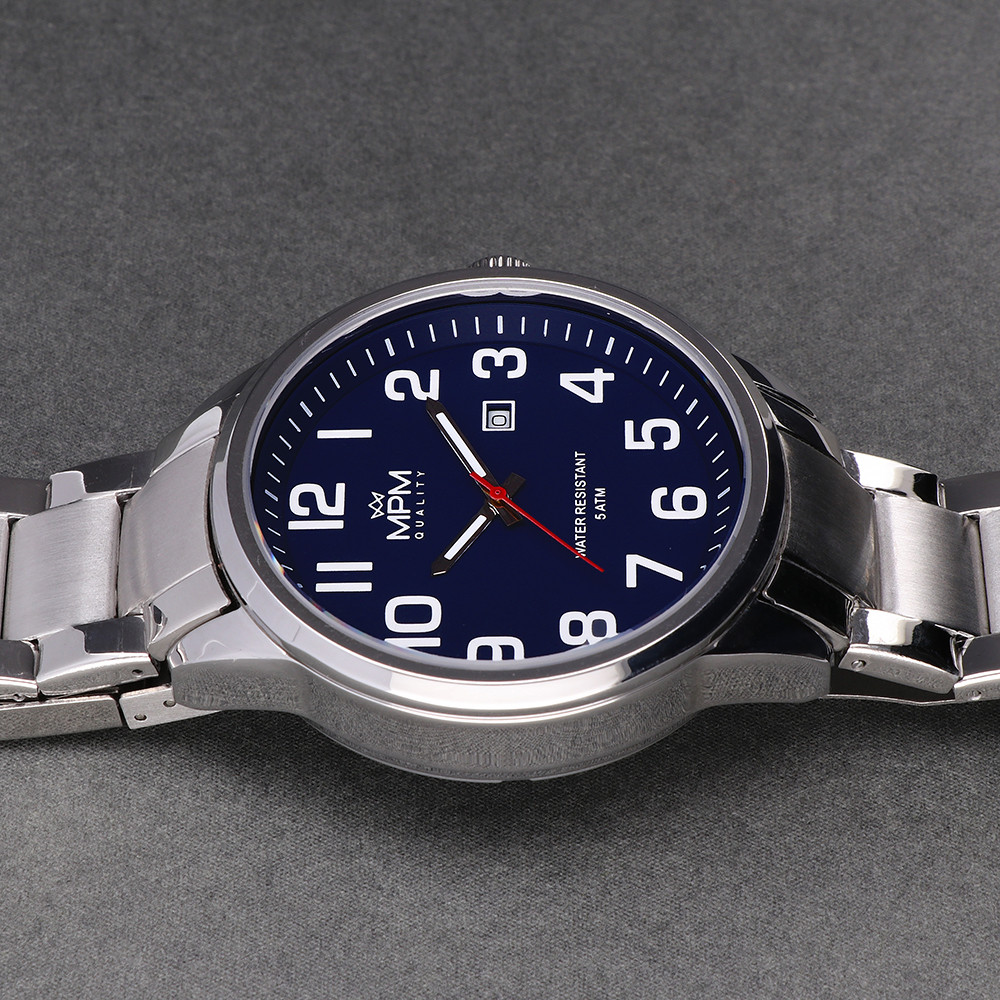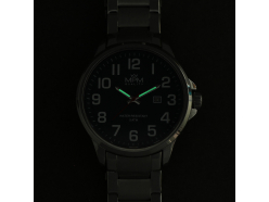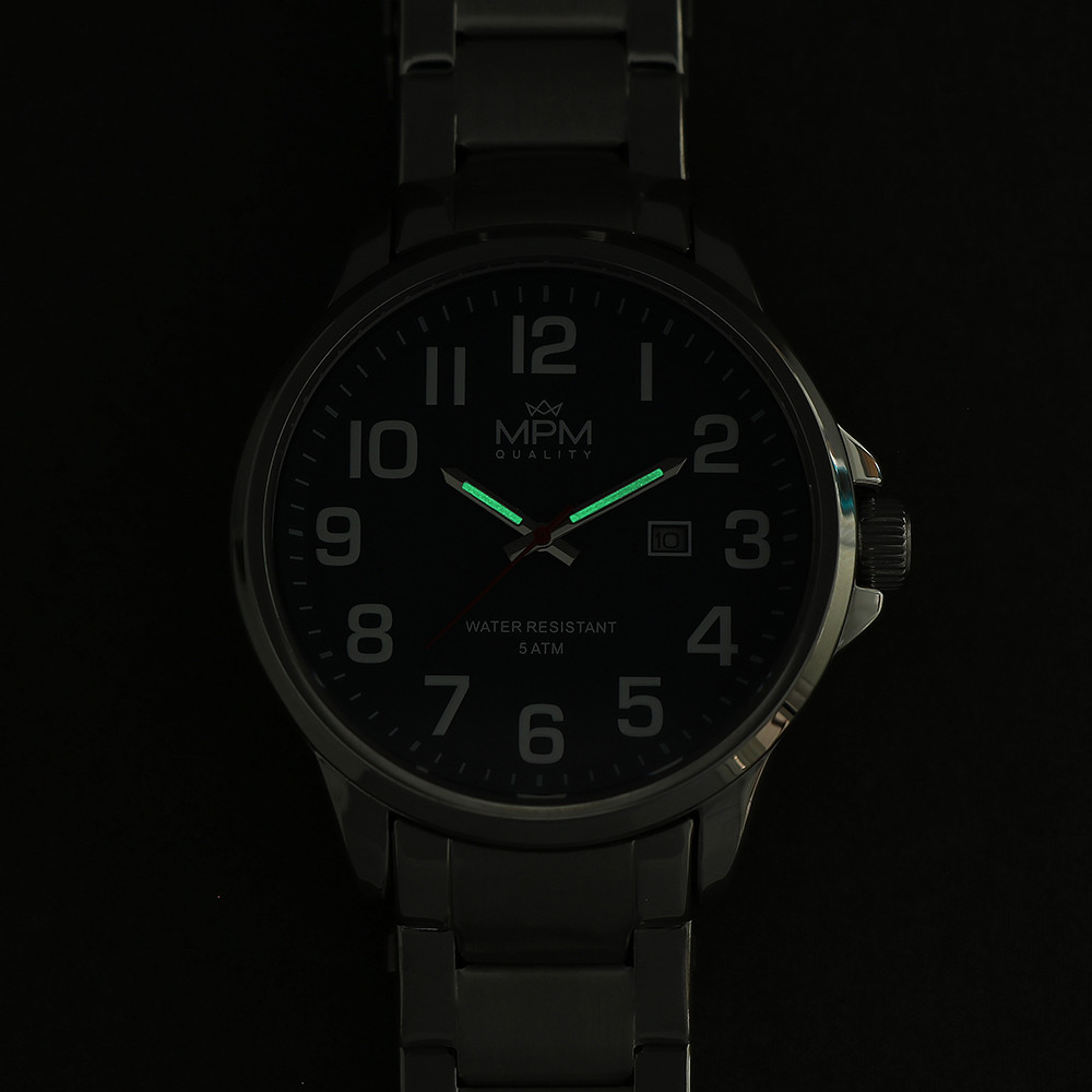 Pánské hodinky MPM s luminiscenčními ručičkami a funkcí zobrazení data na ciferníku. Kvalitní minerální sklo použité na hodinkách ochrání hodinky před poškrábáním.