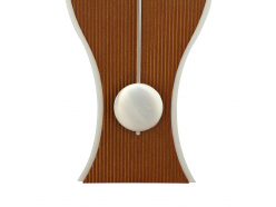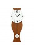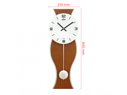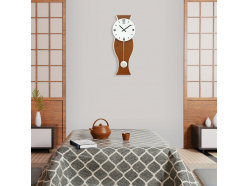 Designové nástěnné hodiny s kyvadlem, s prvky dřeva, skla a kovu.