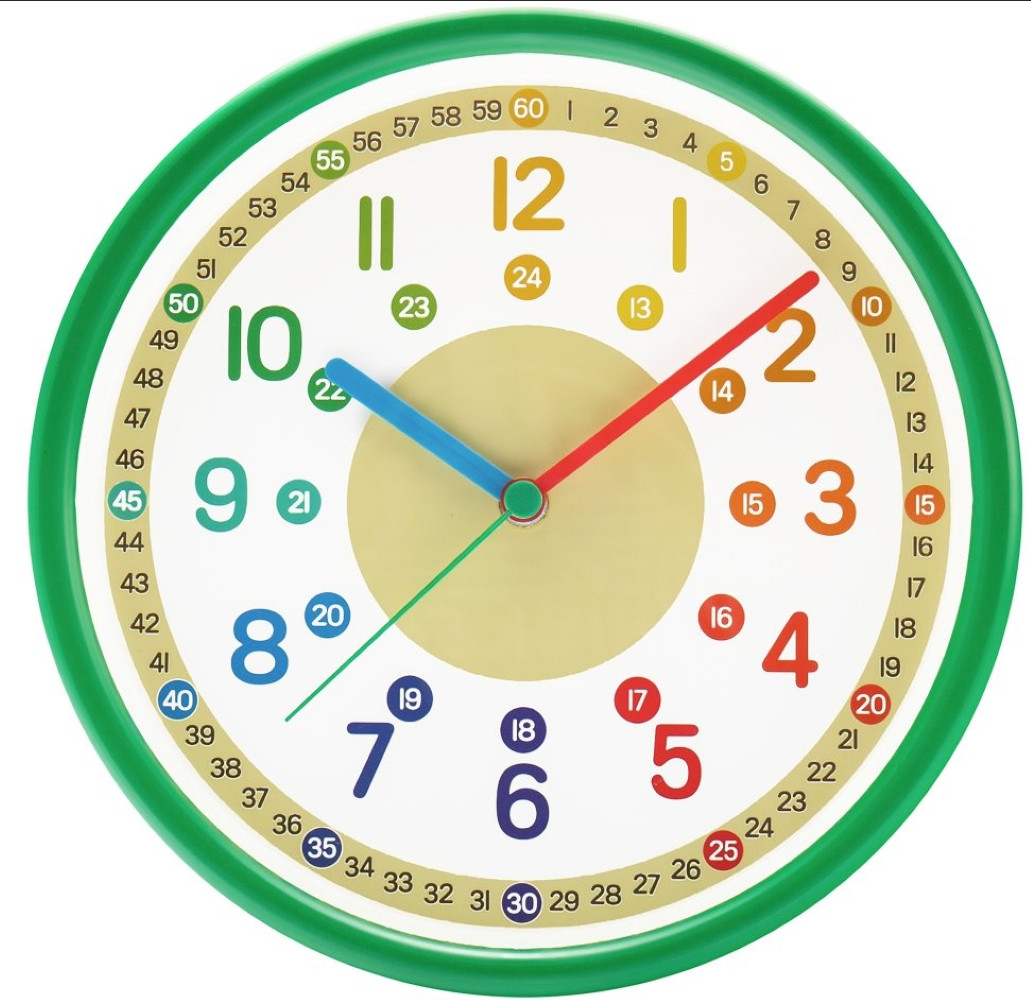 Nástěnné plastové hodiny zelené MPM Dětské plastové nástěnné hodiny UČÍM SE ČAS - zelené II