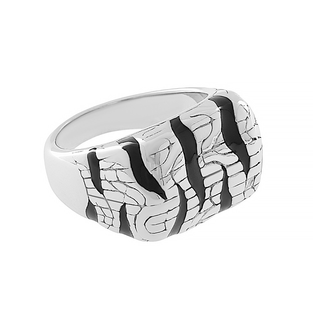 Nerezový prsten ve stříbrném provedení s černými pruhy vhodný pro obě pohlaví. Chirurgická ocel je velmi populární pro své antialergenní vlastnosti.
