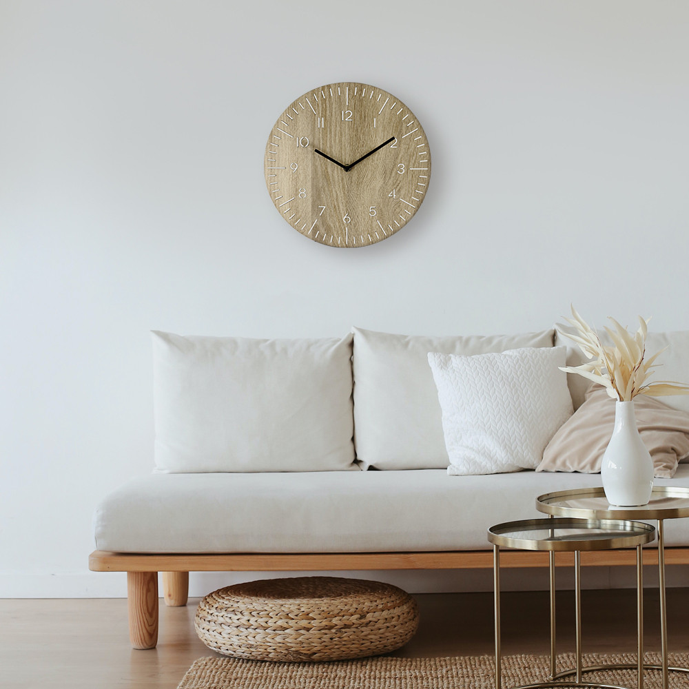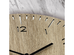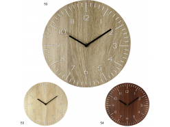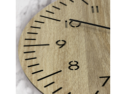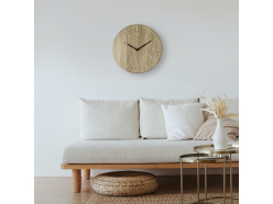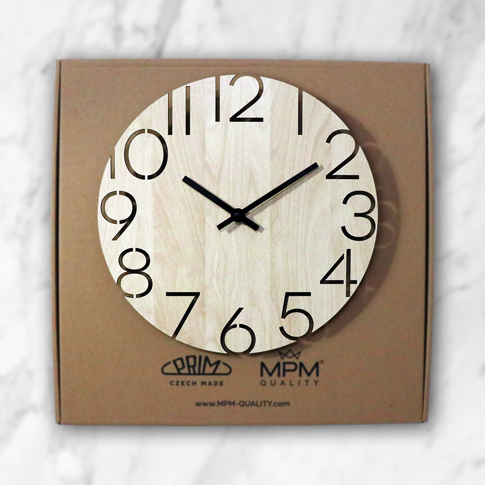 Drewniany zegar ścienny MPM Lines. Naturalny wzór z dużymi indeksami i tradycyjnymi cyframi. Mechanizm kwarcowy z funkcją płynnej pracy. Zegar wykonany jest z półtwardej płyty pilśniowej (MDF). Wyprodukowano w CZ.
