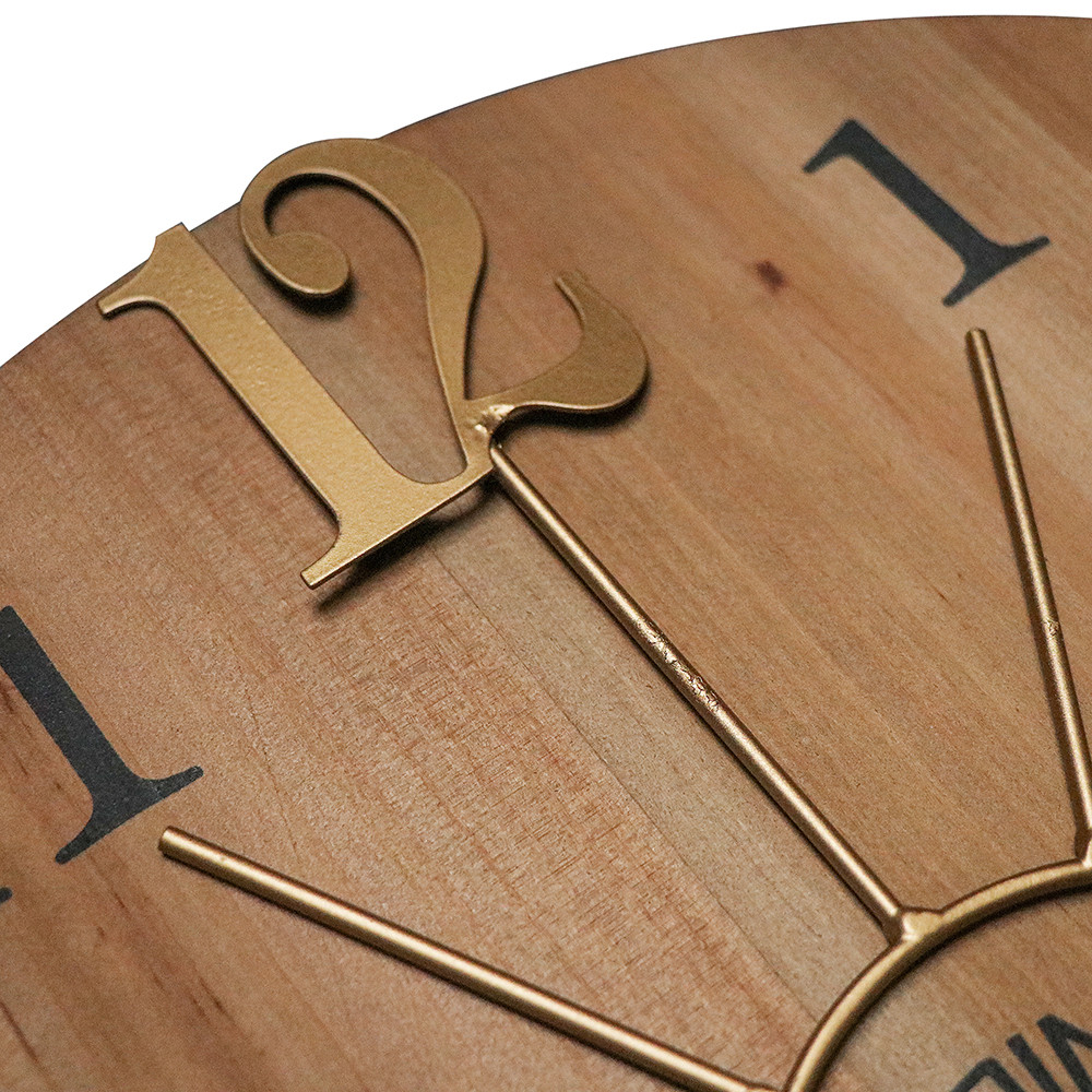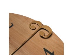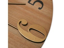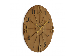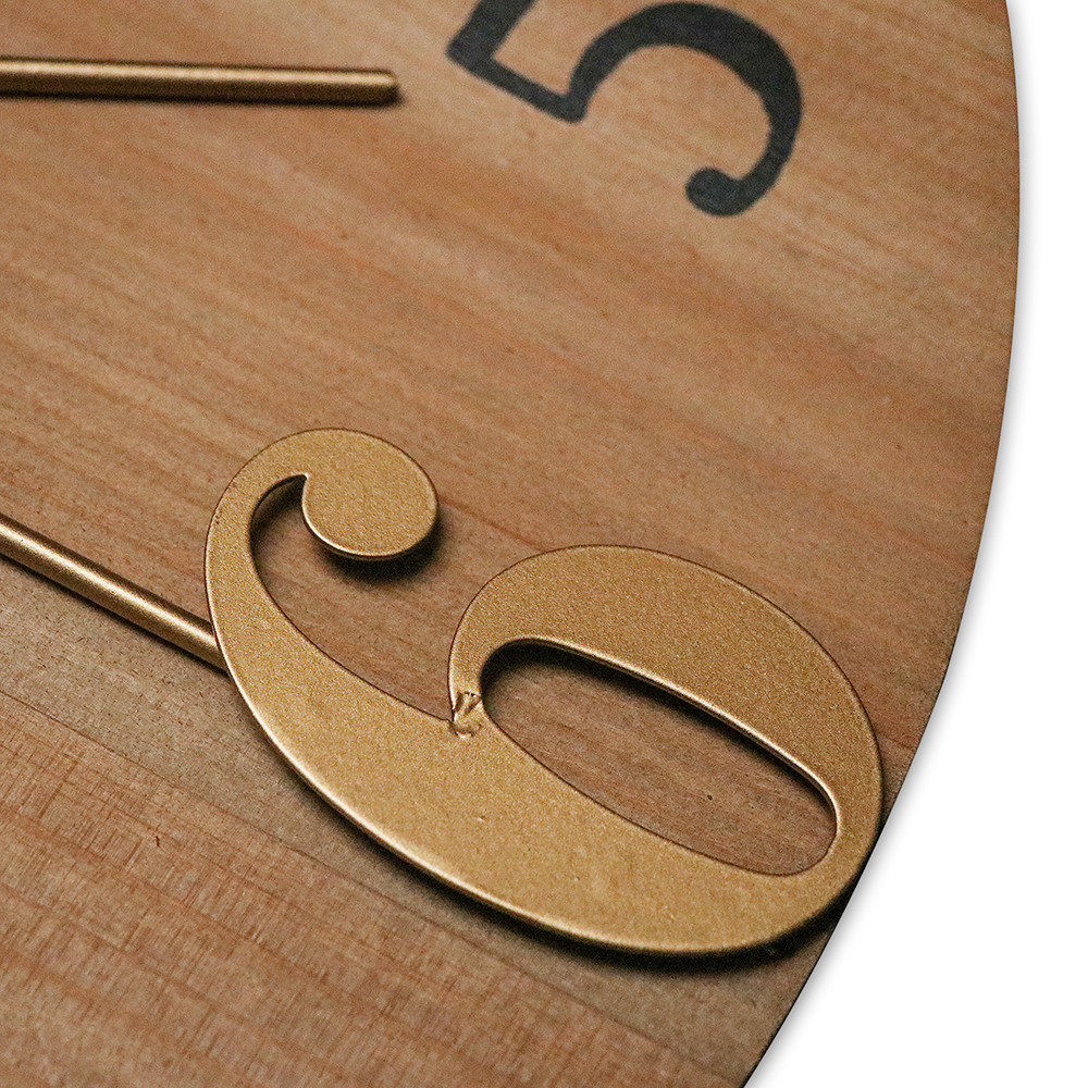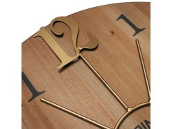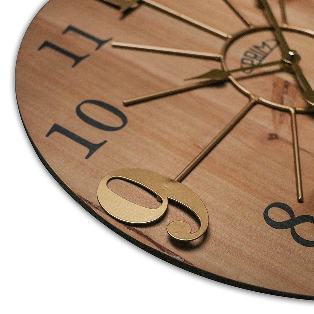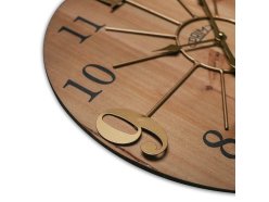 Duży drewniany zegar ścienny w kombinacji z metalowym pierścieniem oraz połączeniem cyfr wypukłych i drukowanych. Model posiada mechanizm "płynący"- sweep.