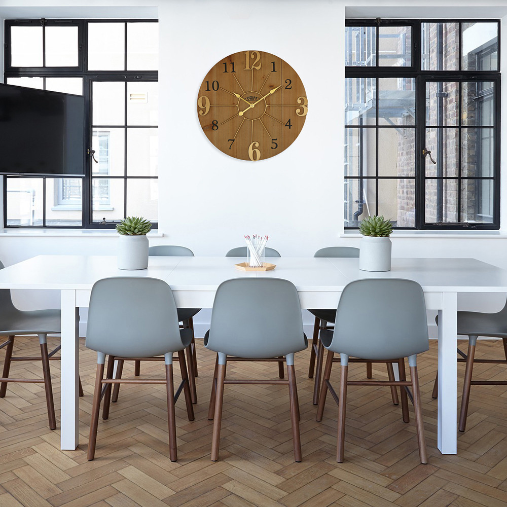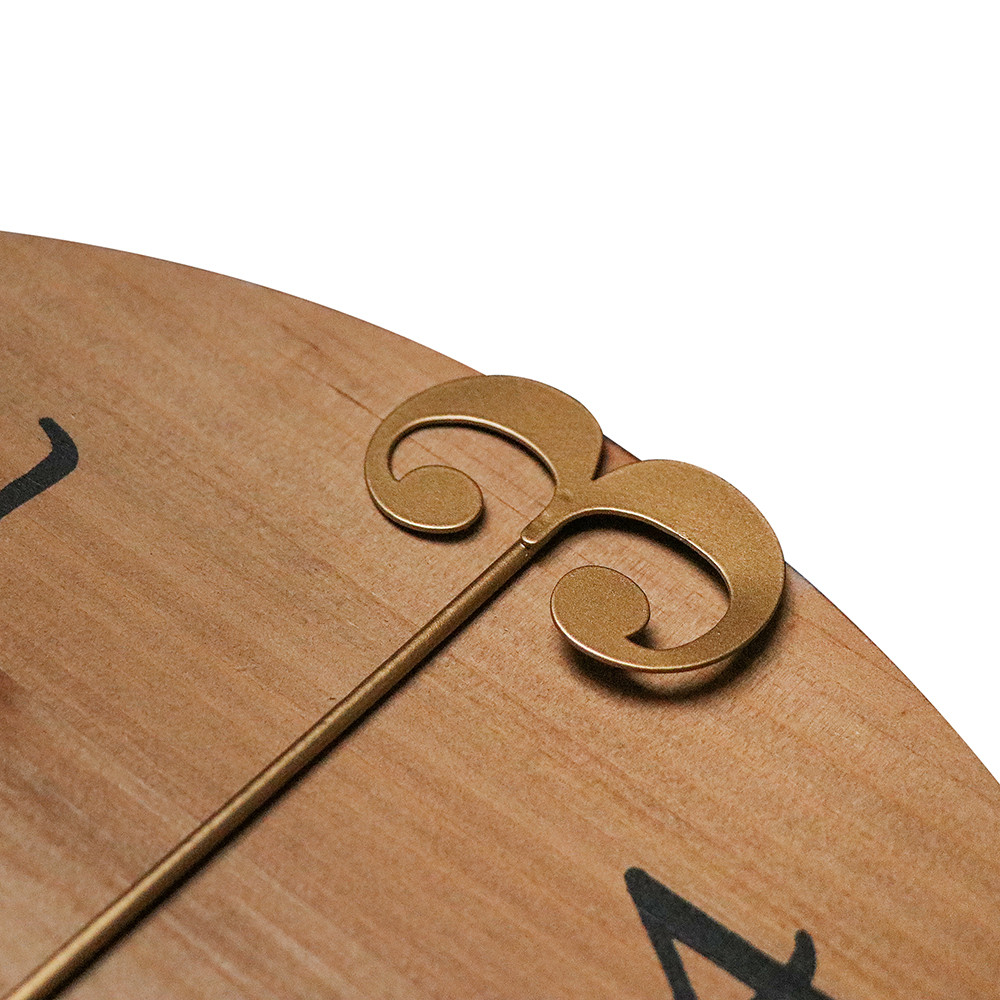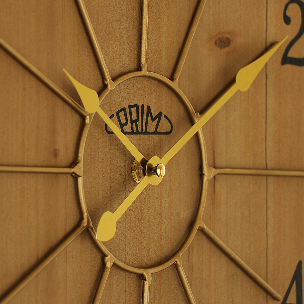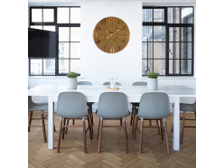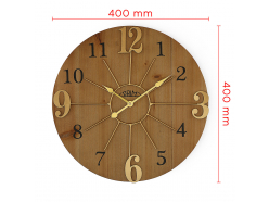 Duży drewniany zegar ścienny w kombinacji z metalowym pierścieniem oraz połączeniem cyfr wypukłych i drukowanych. Model posiada mechanizm "płynący"- sweep.