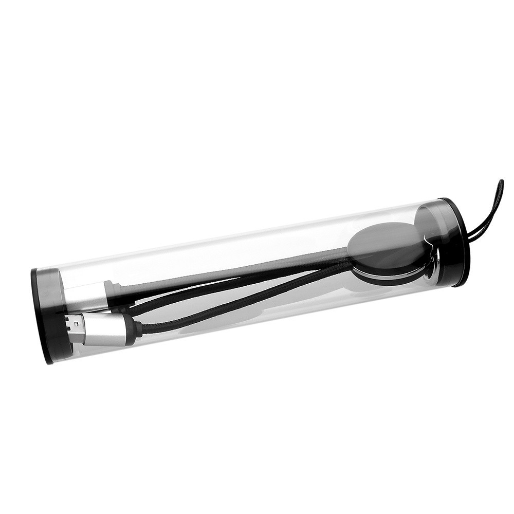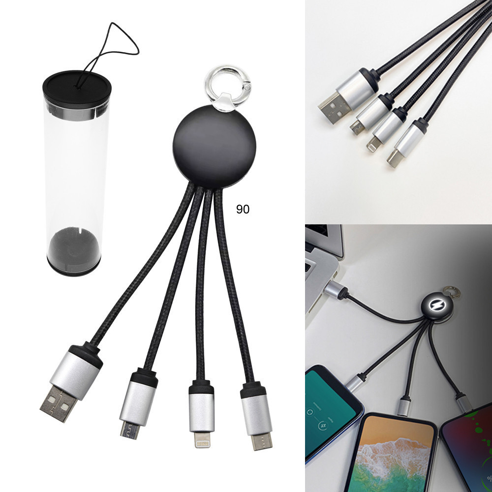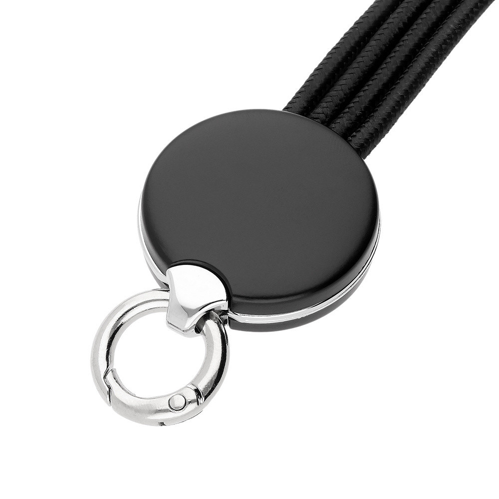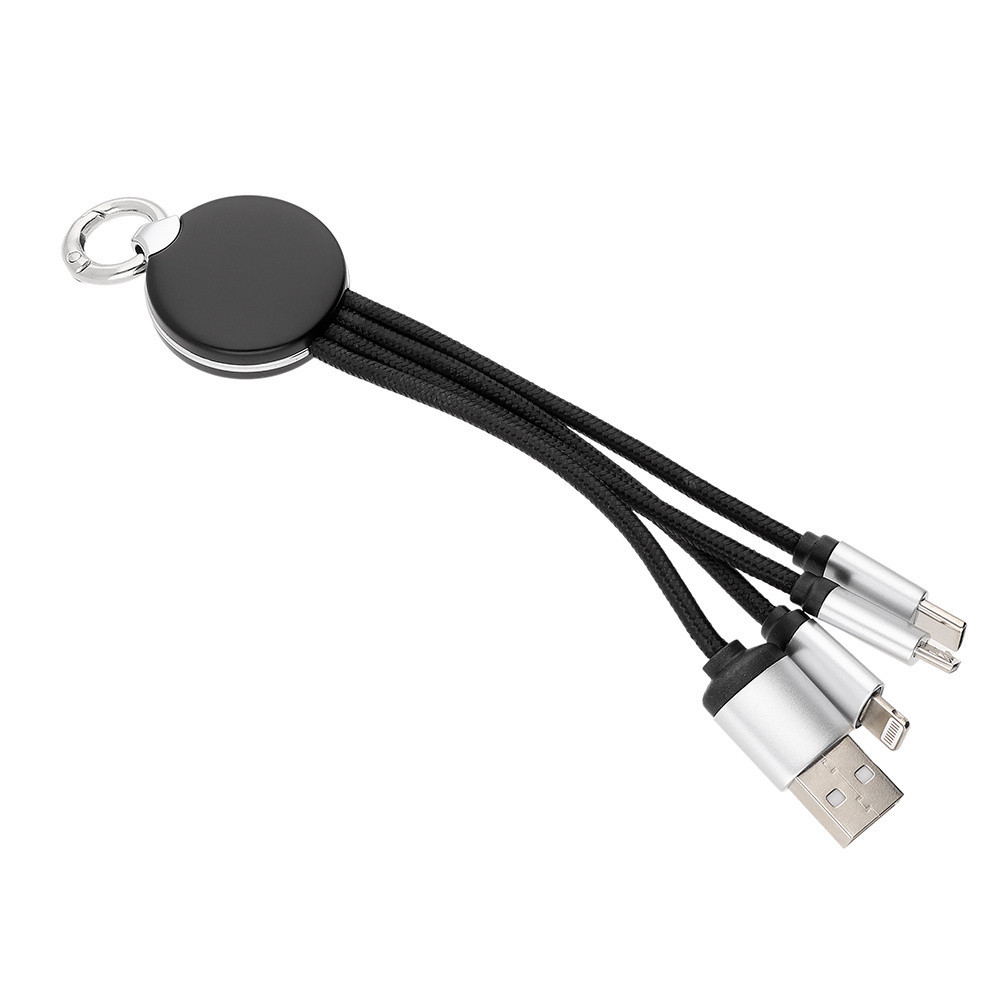 Přívěsek s redukcemi USB / Micro USB / iPhone / USB-C, s kabely v nylonovém opletu a koncovkami v plastovém pouzdře.