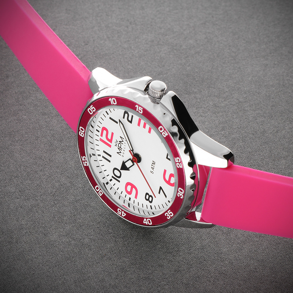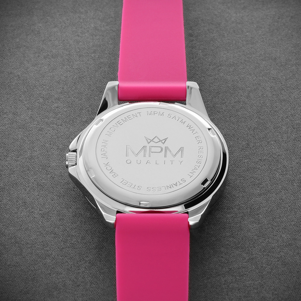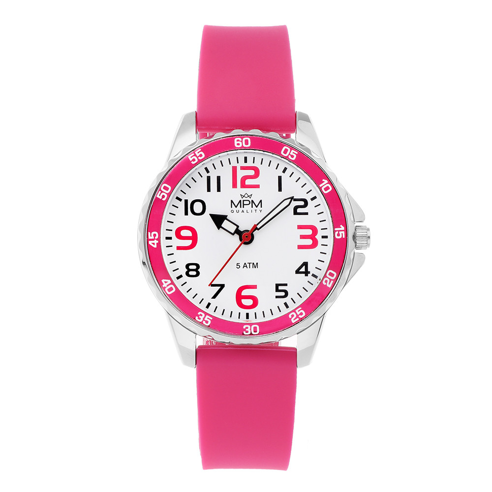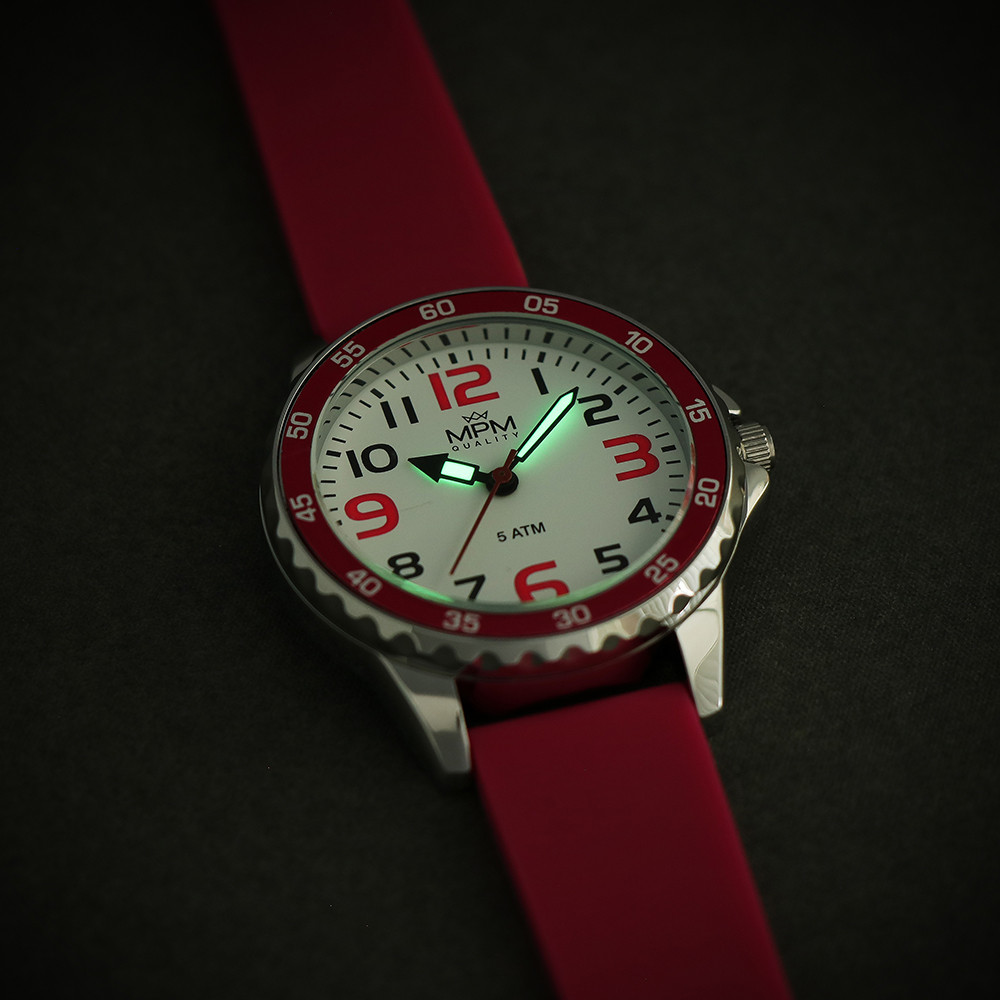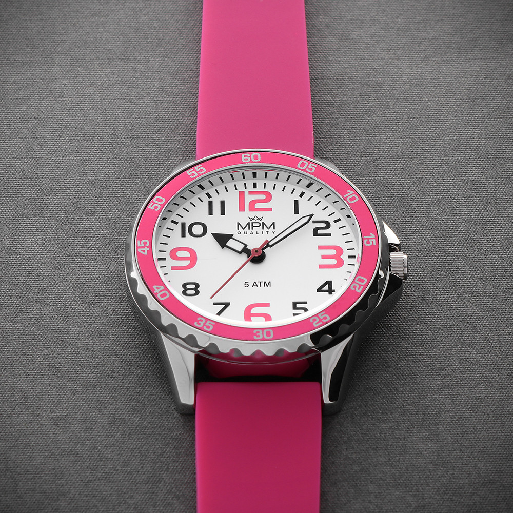 Detské MPM hodinky, vhodné pre chlapcov, aj pre dievčatá. Čitateľnosť hodiniek uľahčuje veľkosť použitých numerických indexov spoločne s výraznými ručičkami. Vzhľad ručičiek kombinujú tvar šípky a meča, ktoré sú navyše pokryté luminiscenčnou vrstvou. Ciferník hodiniek dopĺňa farebná sekundová ručička. Hodinky sme vybavili naozaj jemným silikónovým remienkom, aby sa Vaše deti neobmedzovali pri žiadnej aktivite a tiež mali neustály pojem o čase.